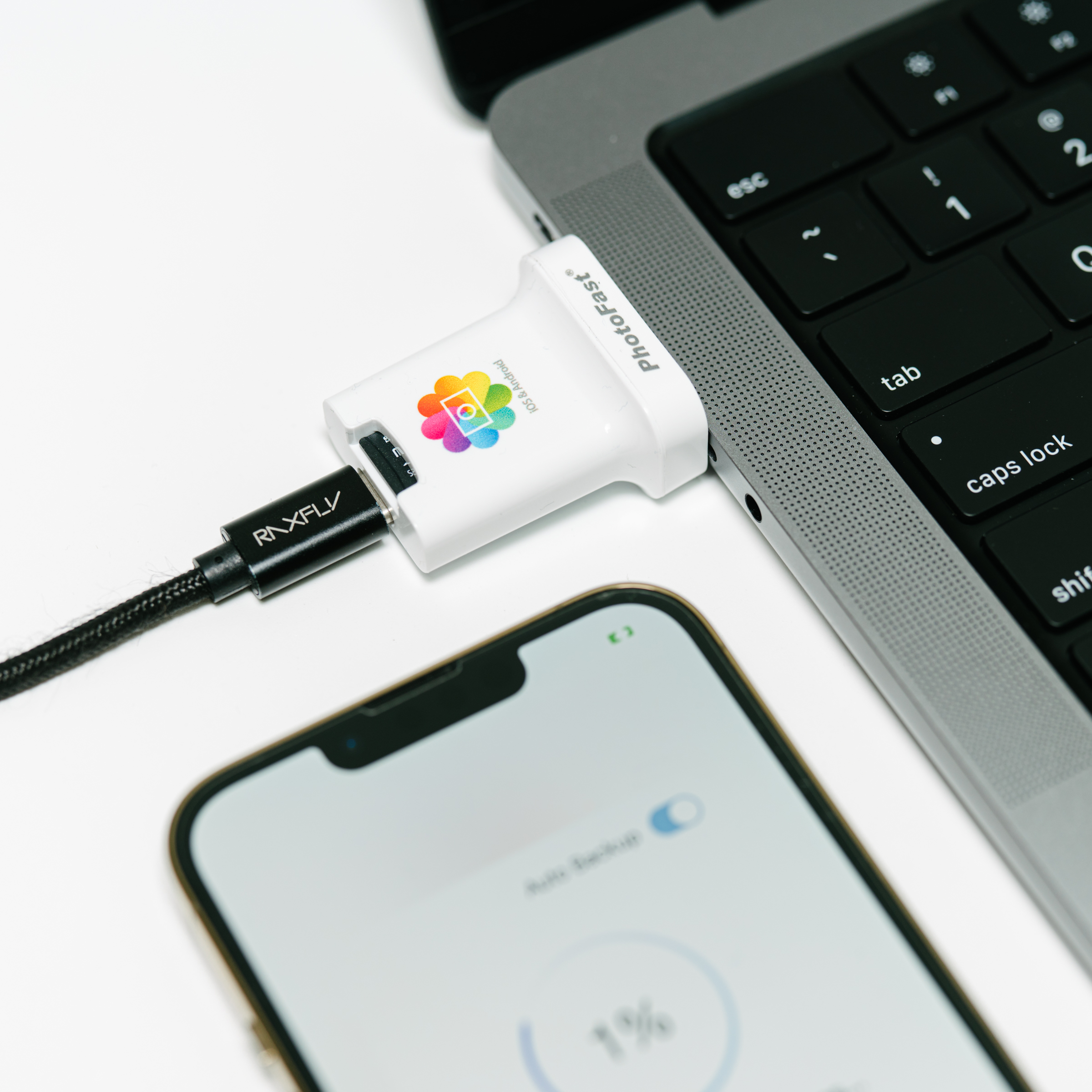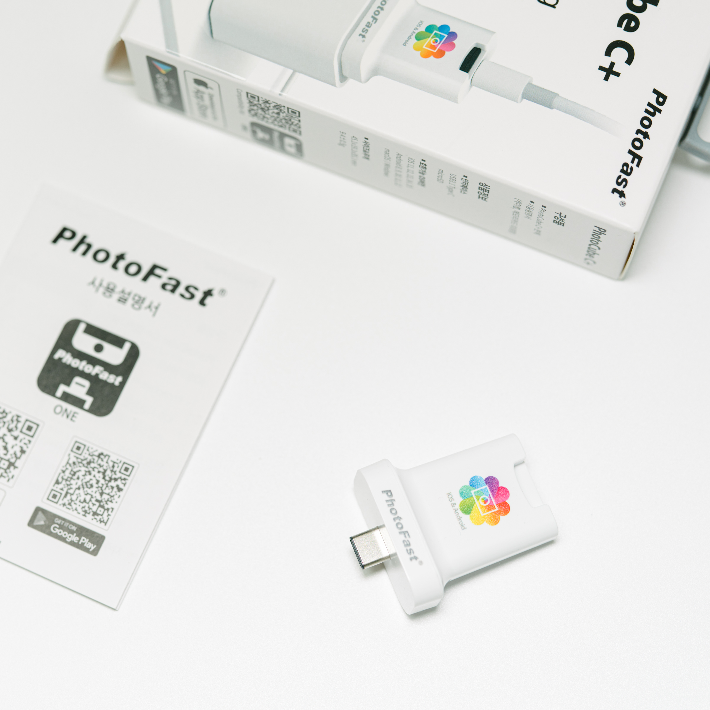 제품명은 포토패스트 포토큐브 C+입니다. USB C 포트를 통해 스마트폰과 연결되며 장치에 직접 삽입하는 microSD카드에 데이터를 백업합니다. 백업된 파일을 다른 휴대폰에 복원하는 것도 가능합니다. 아이폰/안드로이드폰을 모두 지원해 활용도가 높습니다.