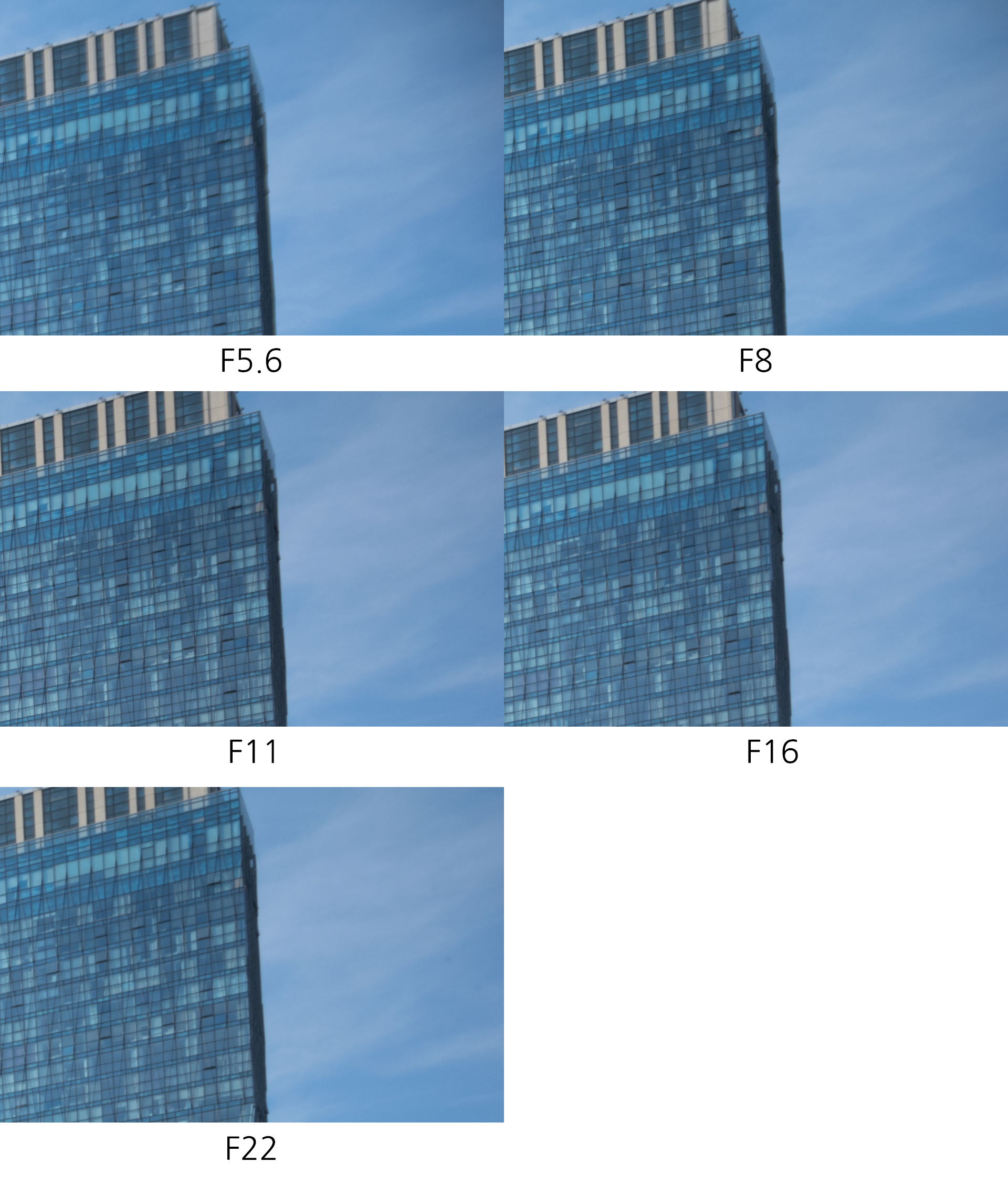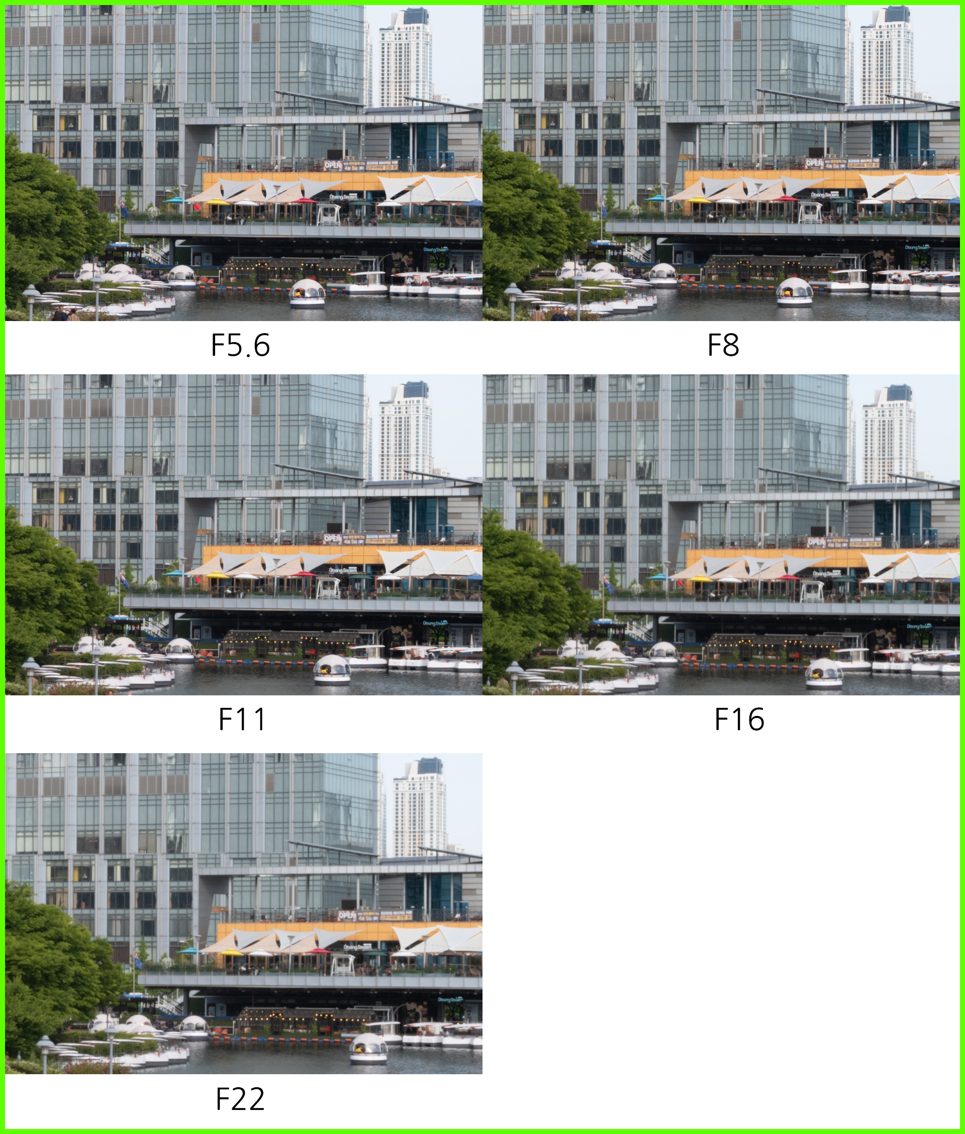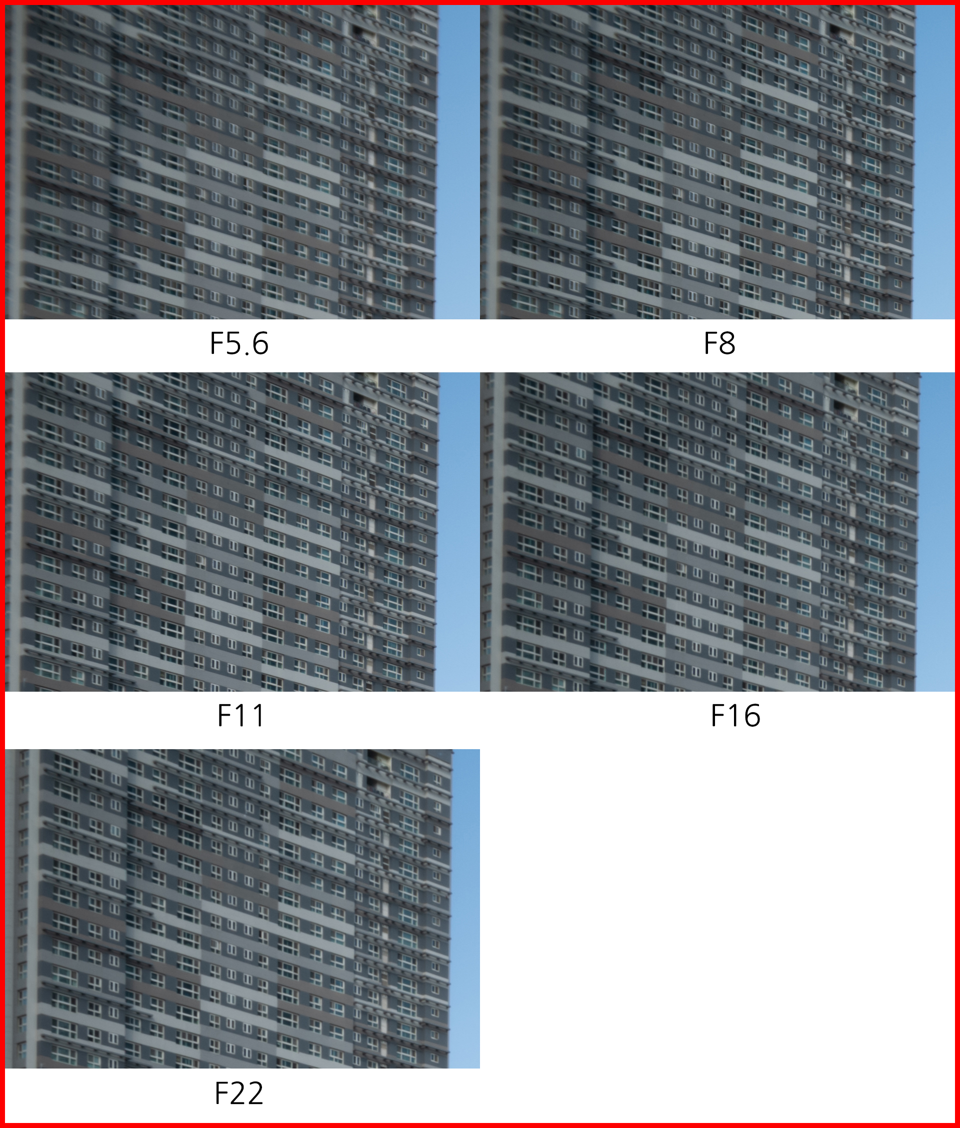 기대만큼의 뚜렷한 차이가 없습니다. 사실 렌즈의 크기를 감안하면 어느 정도 예상했던 결과입니다. 조리개 값에 따라 드라마틱하게 향상되는 구조보단 가장 많이 사용될 F5.6 최대 개방 조리개 값의 결과물 향상에 주력했는지 중심부 해상력에는 큰 차이가 보이지 않습니다. F5.6 최대 개방 촬영보다 F8 결과물이 미세하게 낫지만 큰 차이는 아닙니다. F11에서는 F8보다 해상력이 조금 떨어지고 이후 눈에 띄게 흐려집니다. 중심부 해상력 기준으로 F8에서 가장 좋은 결과물을 얻을 수 있겠네요.