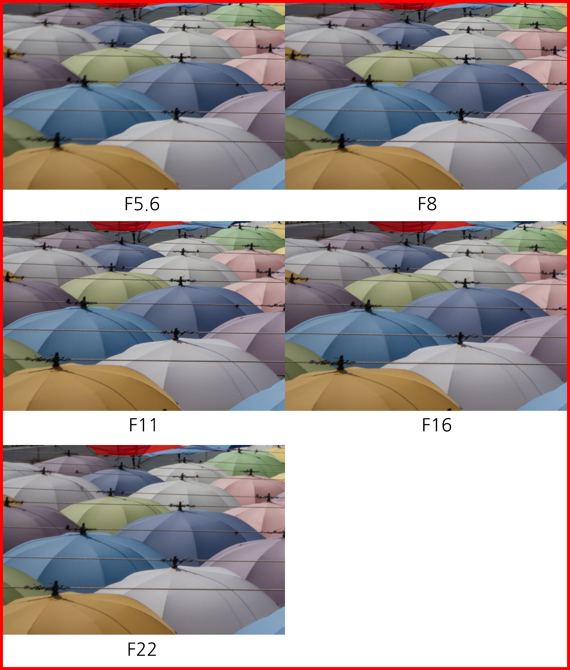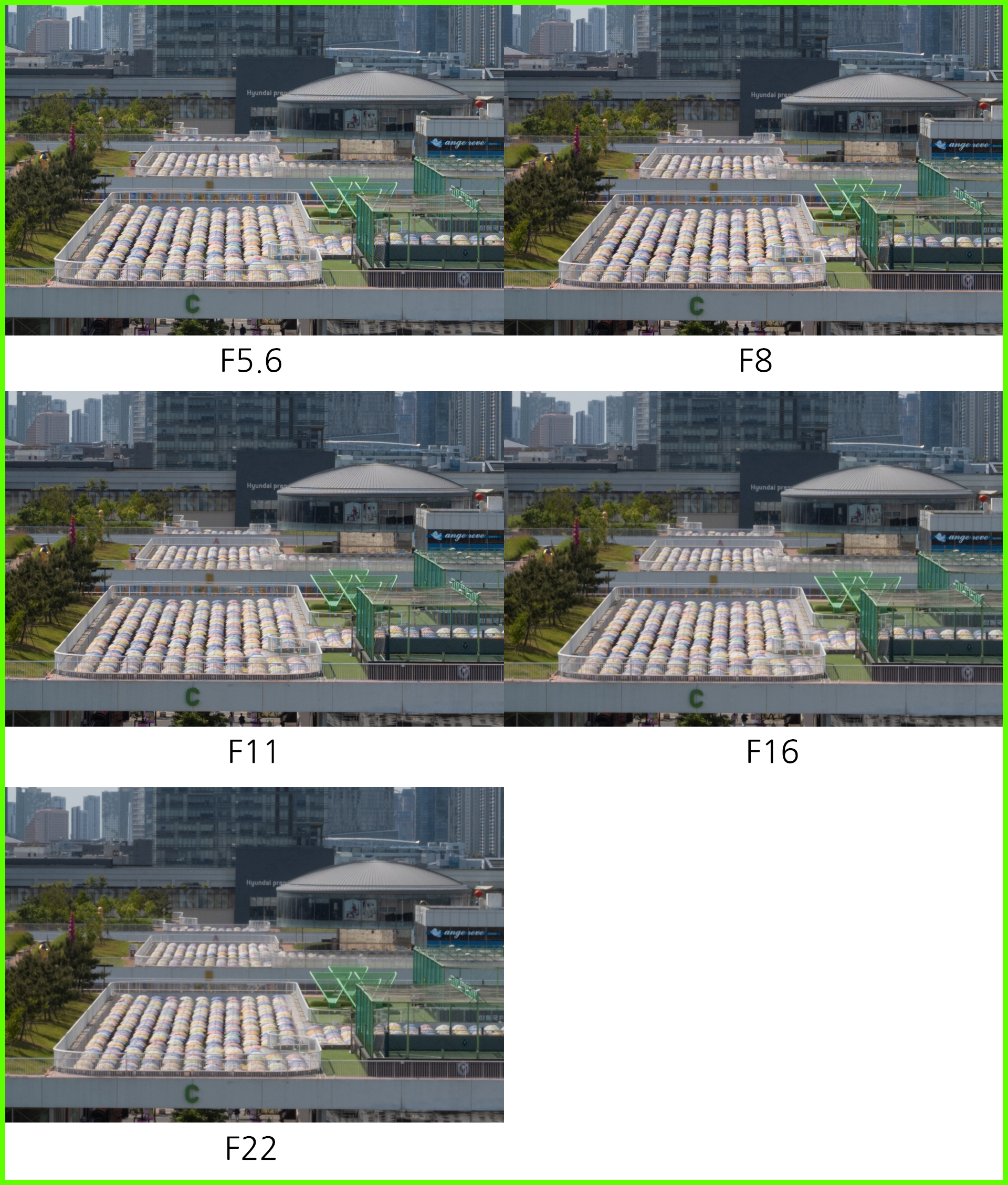 기대만큼의 뚜렷한 차이가 없습니다. 사실 렌즈의 크기를 감안하면 어느 정도 예상했던 결과입니다. 조리개 값에 따라 드라마틱하게 향상되는 구조보단 가장 많이 사용될 F5.6 최대 개방 조리개 값의 결과물 향상에 주력했는지 중심부 해상력에는 큰 차이가 보이지 않습니다. F5.6 최대 개방 촬영보다 F8 결과물이 미세하게 낫지만 큰 차이는 아닙니다. F11에서는 F8보다 해상력이 조금 떨어지고 이후 눈에 띄게 흐려집니다. 중심부 해상력 기준으로 F8에서 가장 좋은 결과물을 얻을 수 있겠네요.
