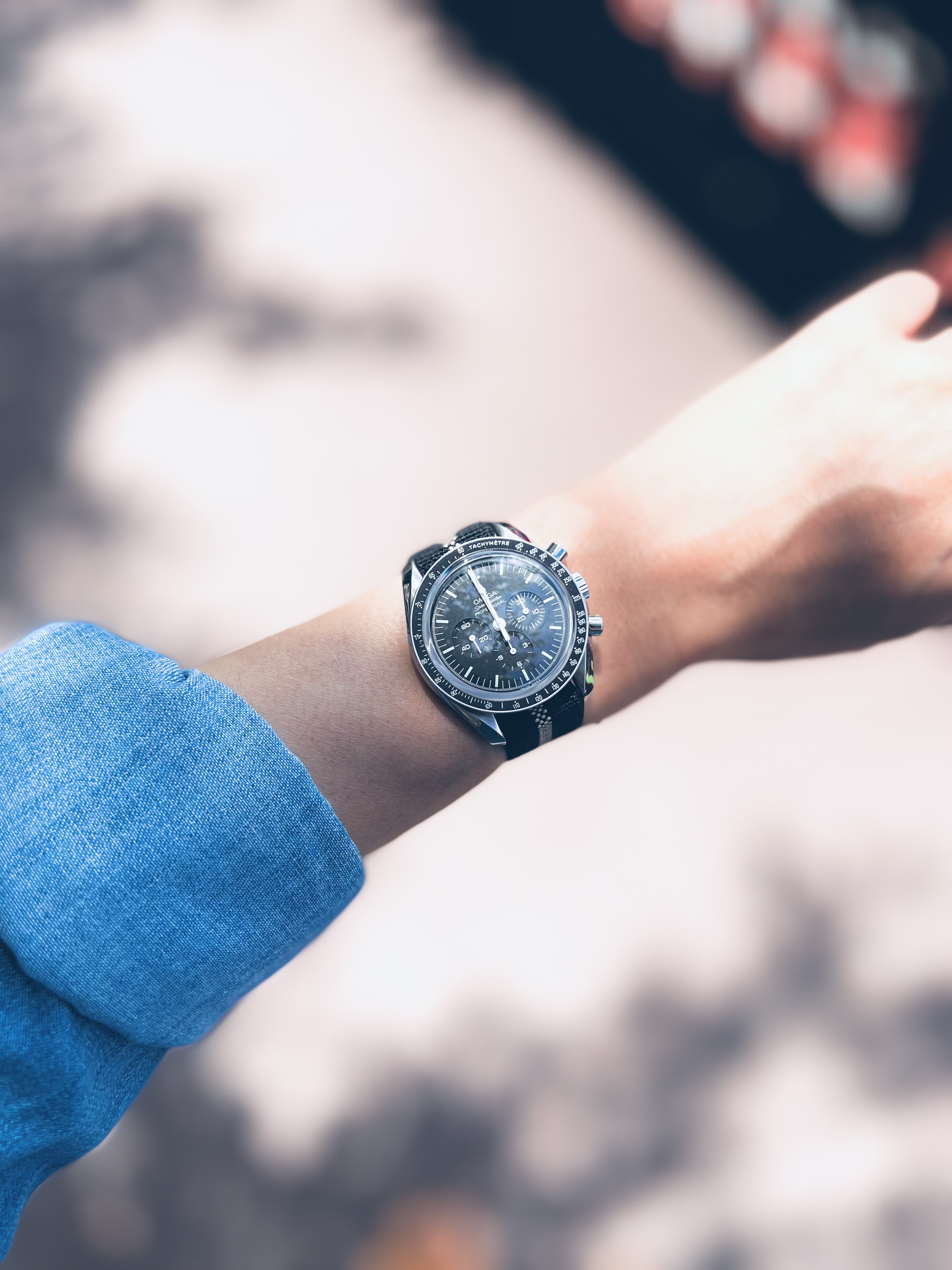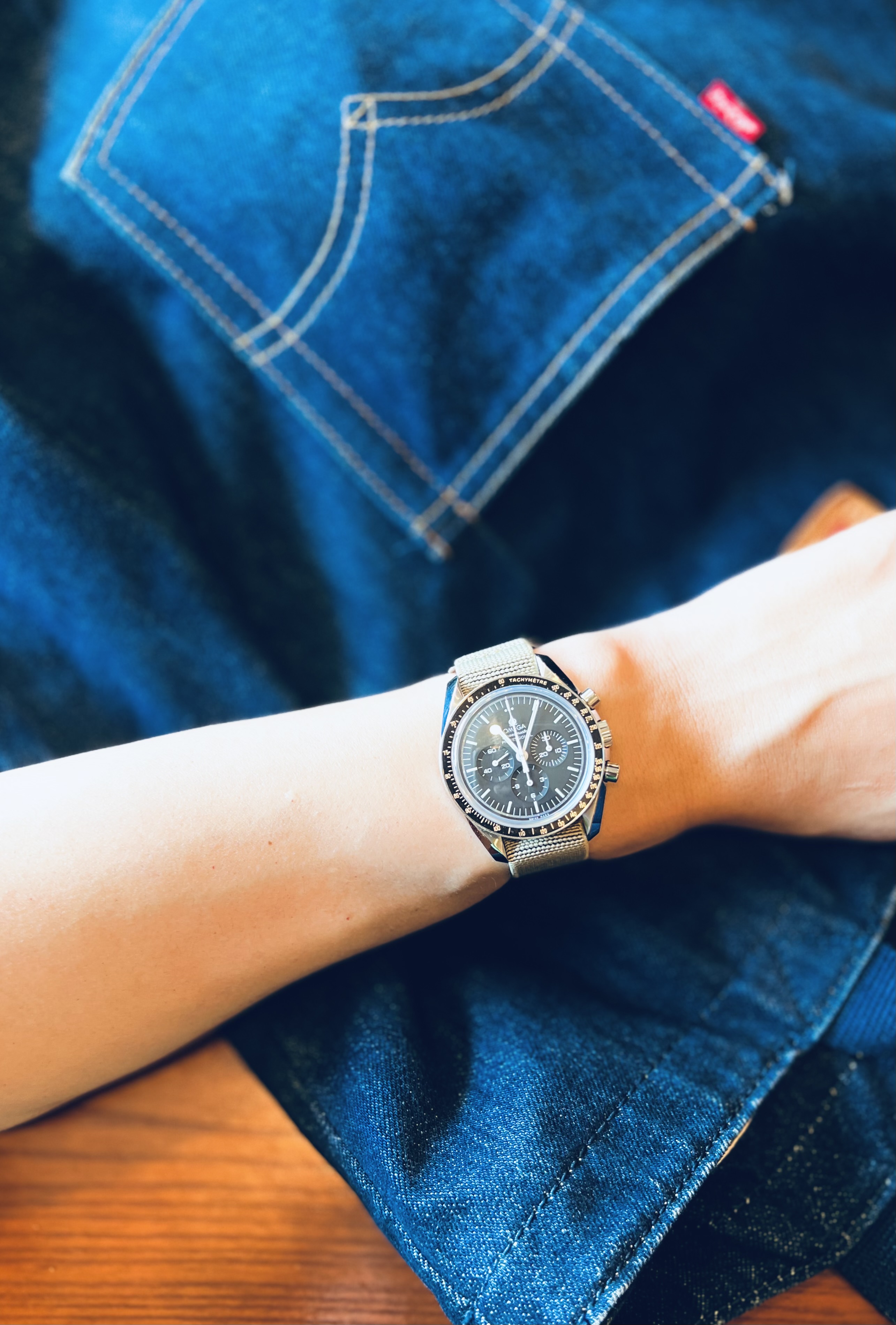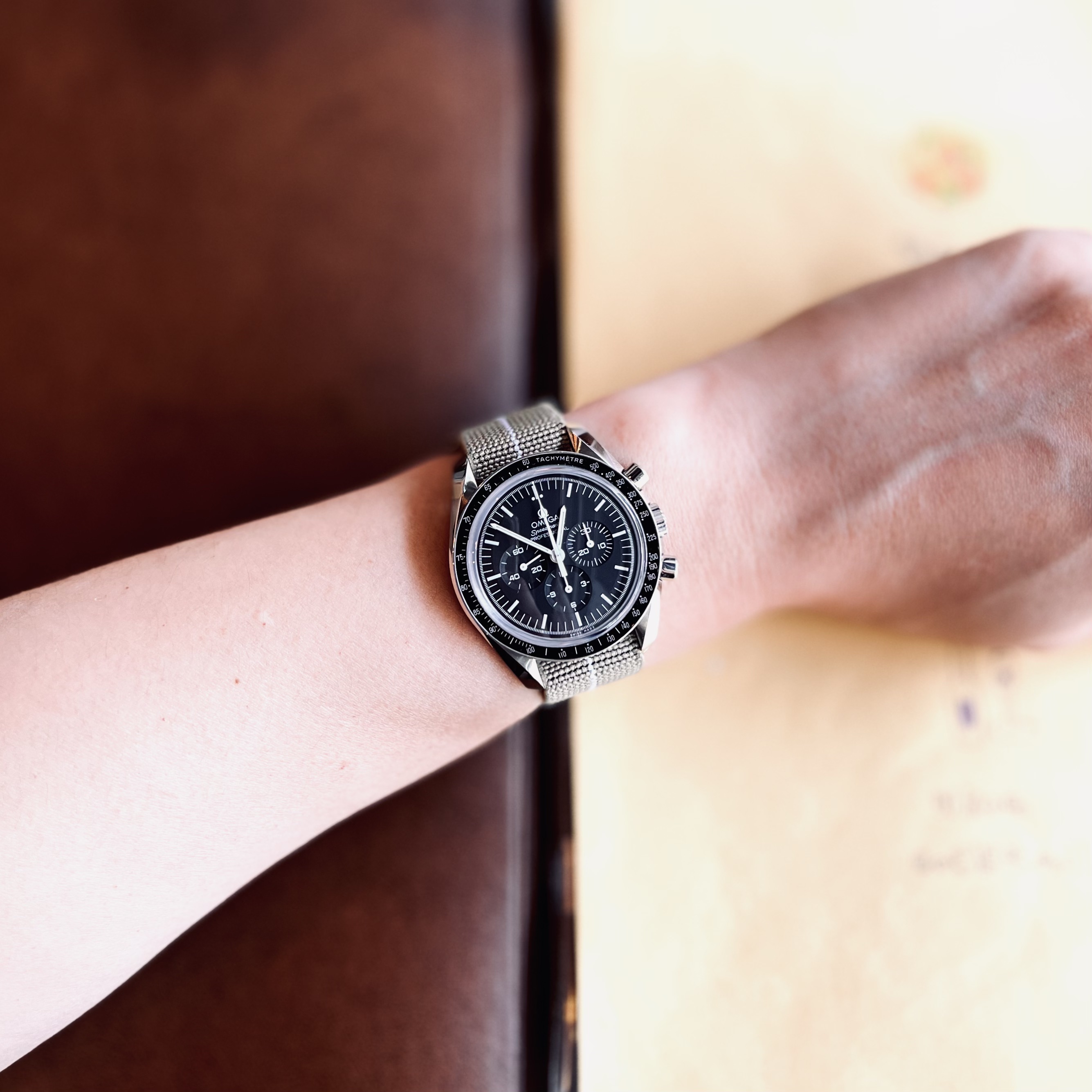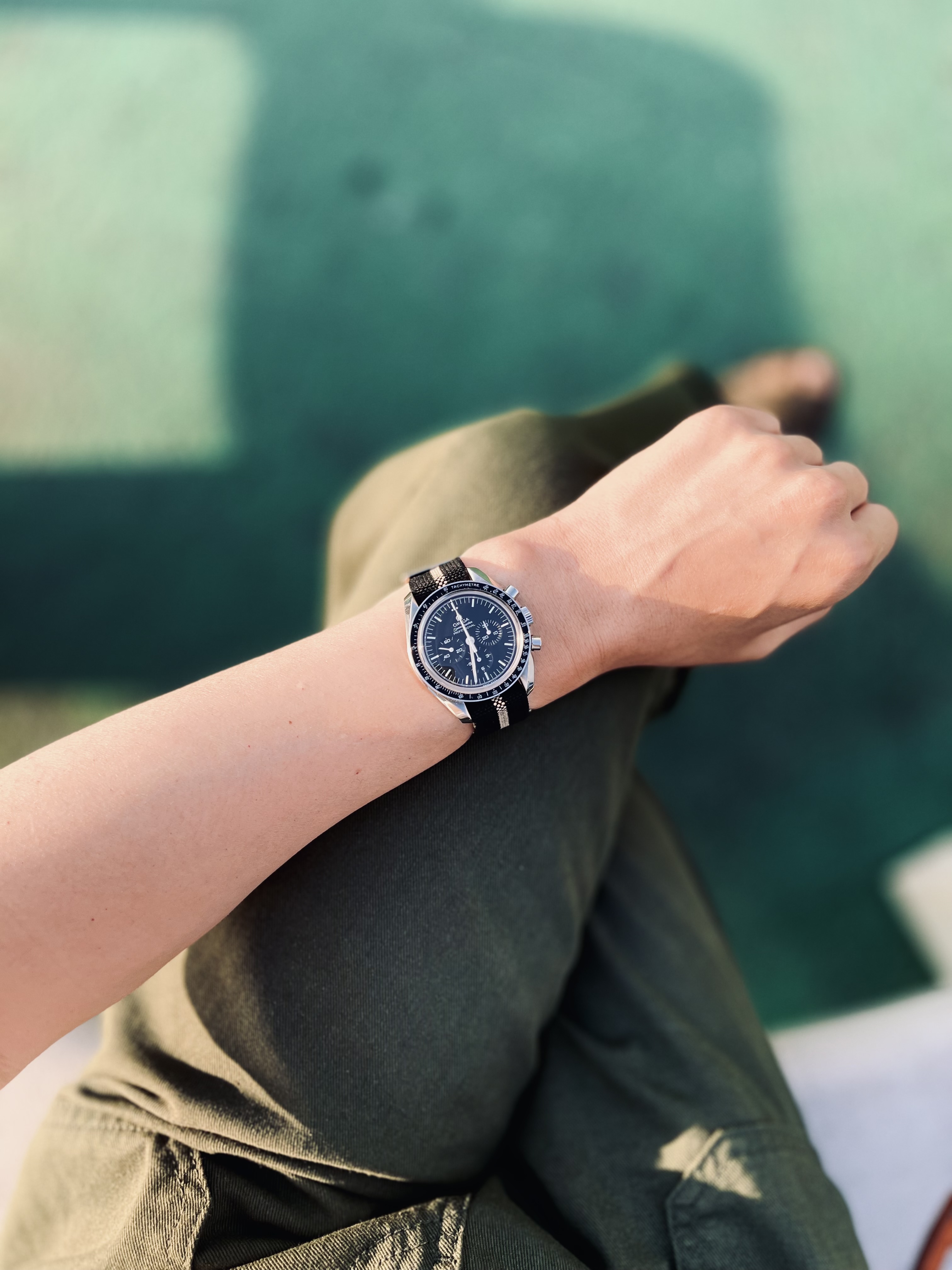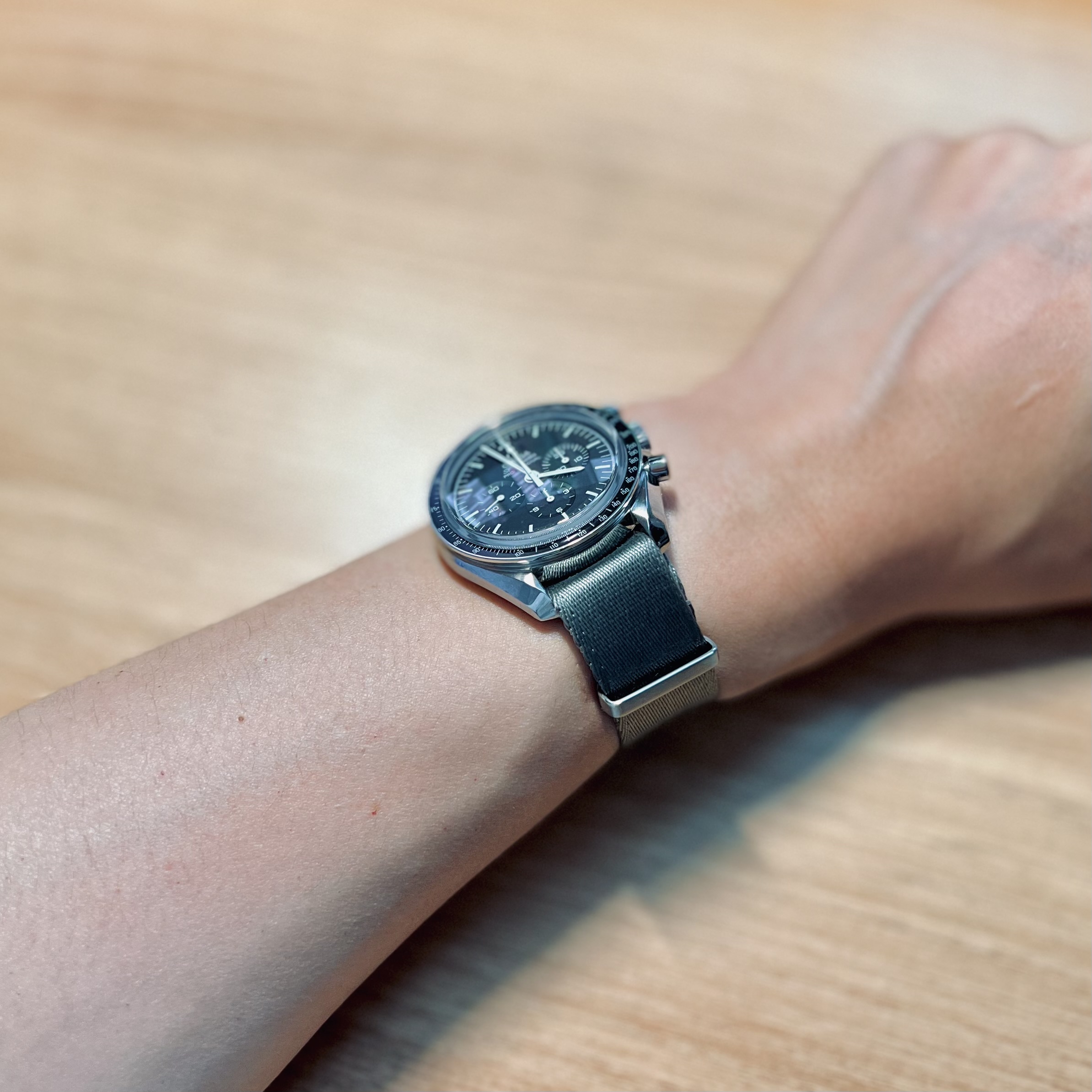 땀이 나는 여름에는 가죽 스트랩 대신 나토 스트랩을 사용합니다. 나일론 소재라 가격도 저렴하고 캐주얼한 느낌, 빈티지한 멋도 낼 수 있습니다. 오메가에서도 다양한 색상의 나토 스트랩을 직접 판매하고 있을만큼 문워치와 나토 스트랩의 조화는 검증이 돼 있죠. 저는 예전부터 알리익스프레스에서 다양한 나토스트랩을 구매해 봤는데 최근에는 안전벨트 소재로 만든 나토 밴드에 정착했습니다. 싸게는 1-2불 무료배송으로도 살 수 있는 일반적인 나토 밴드보다 가격이 몇 배 높습니다만 그만큼 고급스럽습니다.