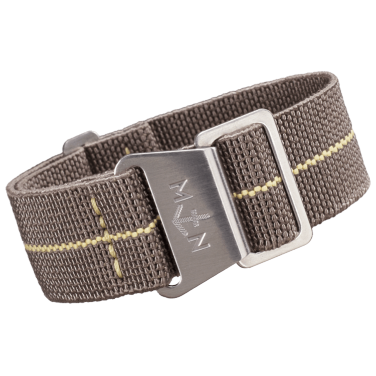 빈티지 워치에 잘 어울리는 패브릭 스트랩으로 MN 스트랩도 인기가 많습니다. 낙하산 체결용 끈을 잘라 만든 것이 그 시작이었다고 하는데 그만큼 소재의 내구도가 높고 특유의 빈티지한 멋이 있습니다. 중앙의 얇은 스트라이프, 일반적인 핀버클과 다른 버클이 특징입니다. 개인적으로는 남는 끈을 처리하기 곤란한 나토밴드보다 달리 길이 조절이 깔끔해서 좋아합니다.