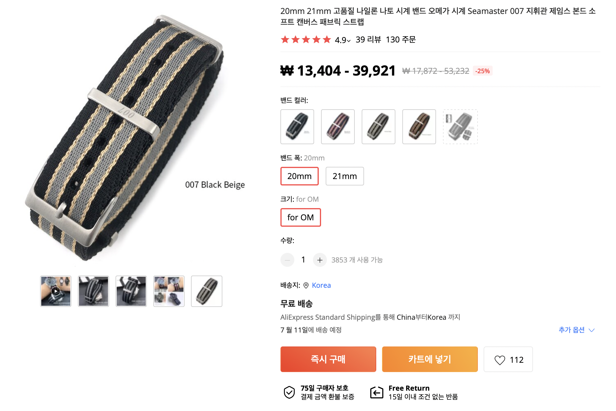 오메가 정품 나토 스트랩의 모조품(?)도 많은 알리익스프레스 판매자에게서 구매할 수 있습니다. 본래는 007 영화에 나오는 씨마스터 시계를 위해 출시됐지만 문워치와도 곧잘 어울립니다. 오메가 홈페이지에서 각 스트랩과의 매칭을 확인하시고 저렴한 비품을 구매해 보시는 것도 좋겠네요. 아예 버클에 로고까지 새긴 A급 짭(?)도 있습니다.