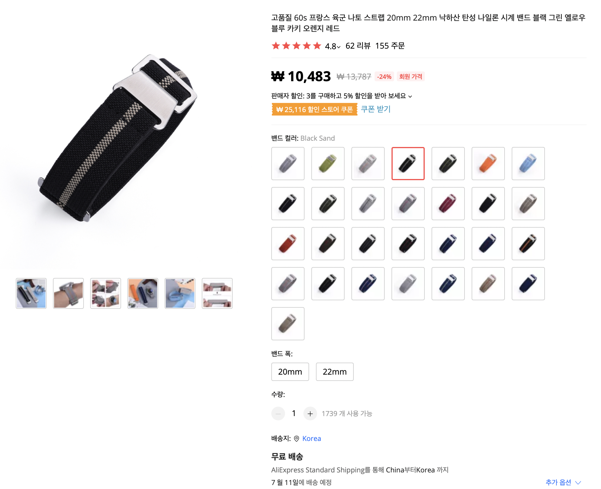 검판 시계에 가장 잘 어울리는 것은 역시 검정색입니다. 거기에 아이보리색 스트라이프가 있어 빈티지한 맛이 있어요. 나토 스트랩을 체결했을 때보다 시계 위/아래로 스트랩이 삐져 나오는 공간이 적어 조금 더 깔끔한 인상입니다. 덕분에 나일론 소재지만 가죽 스트랩처럼 단정해 보입니다. 2천원대부터 만원 이상까지 가격대가 넓게 분포돼 있는데, 배송비 포함 만원 내외 제품을 구매하시는 것을 추천합니다.