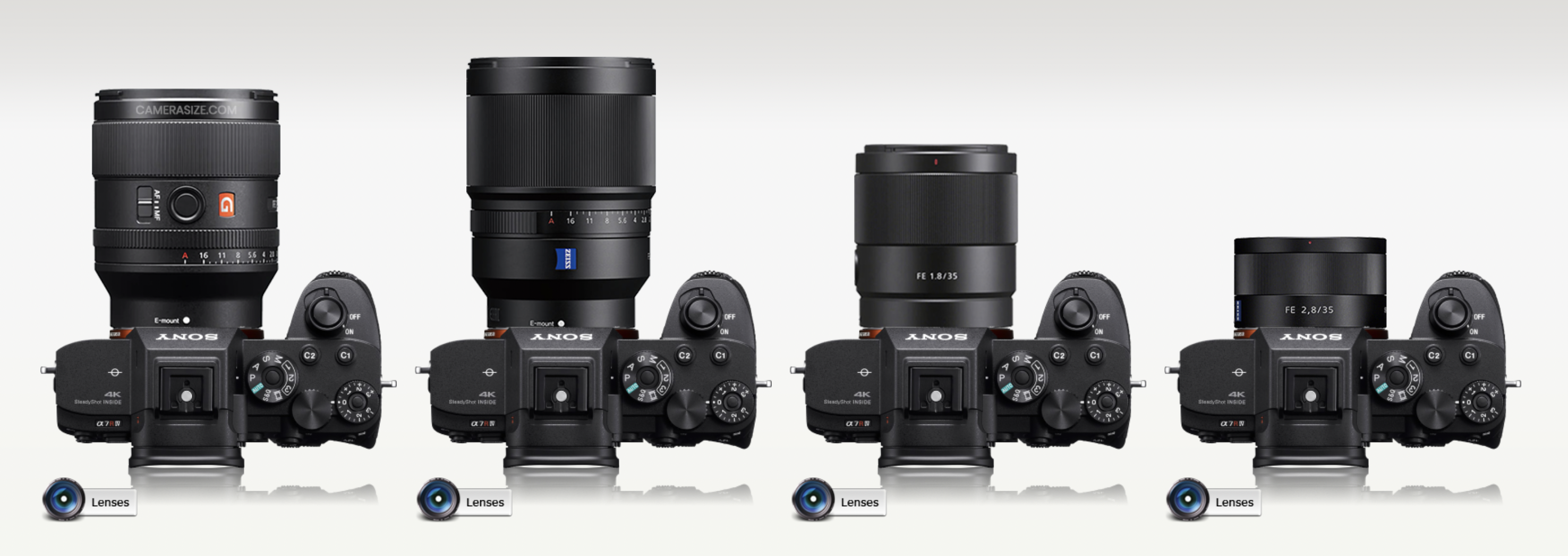 소니의 FE 마운트 35mm 렌즈의 크기를 비교한 것입니다. 35mm F1.4ZA와 비교하면 길이가 조금 짧습니다. 동일한 F1.4 개방 조리개 값을 갖고 광학 성능은 큰 폭으로 향상된 것을 감안하면 오히려 부피가 줄어든 것에 점수를 줄 수 있습니다. 사용자들의 평에 따르면 35.4GM과 비교했을 때 35.4ZA의 장점은 전혀 없는 수준이라죠. 그만큼 35mm F1.4ZA의 광학 성능이 자이스의 명성에 비해 좋지 못하다고 합니다. 물론 해상력만이 렌즈의 완성도를 대변하진 못합니다만. 그 외 35mm F1.8, 35mm F2.8ZA는 휴대성과 개방 조리개 값에서 각자의 특징과 장단점이 있습니다. 특히 35mm F2.8 ZA는 휴대용 바디캡 내지 팬케이크 렌즈로 늘 인기가 좋습니다.