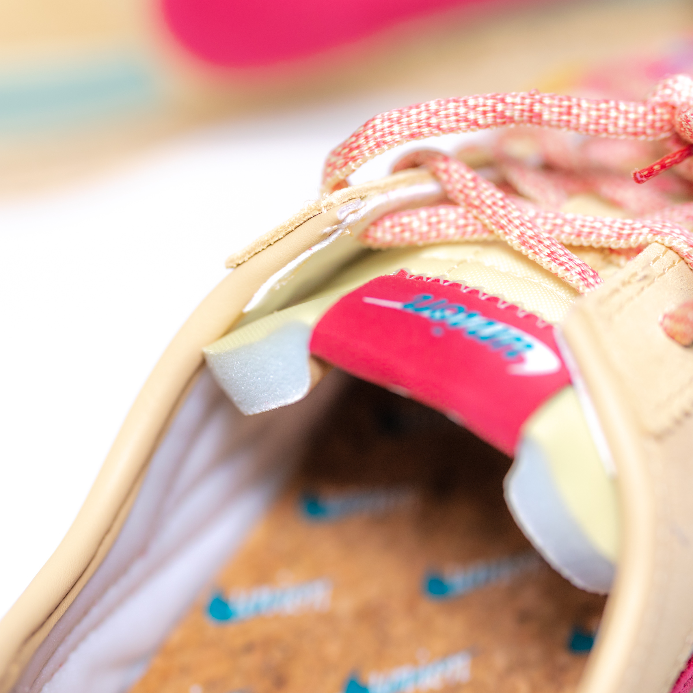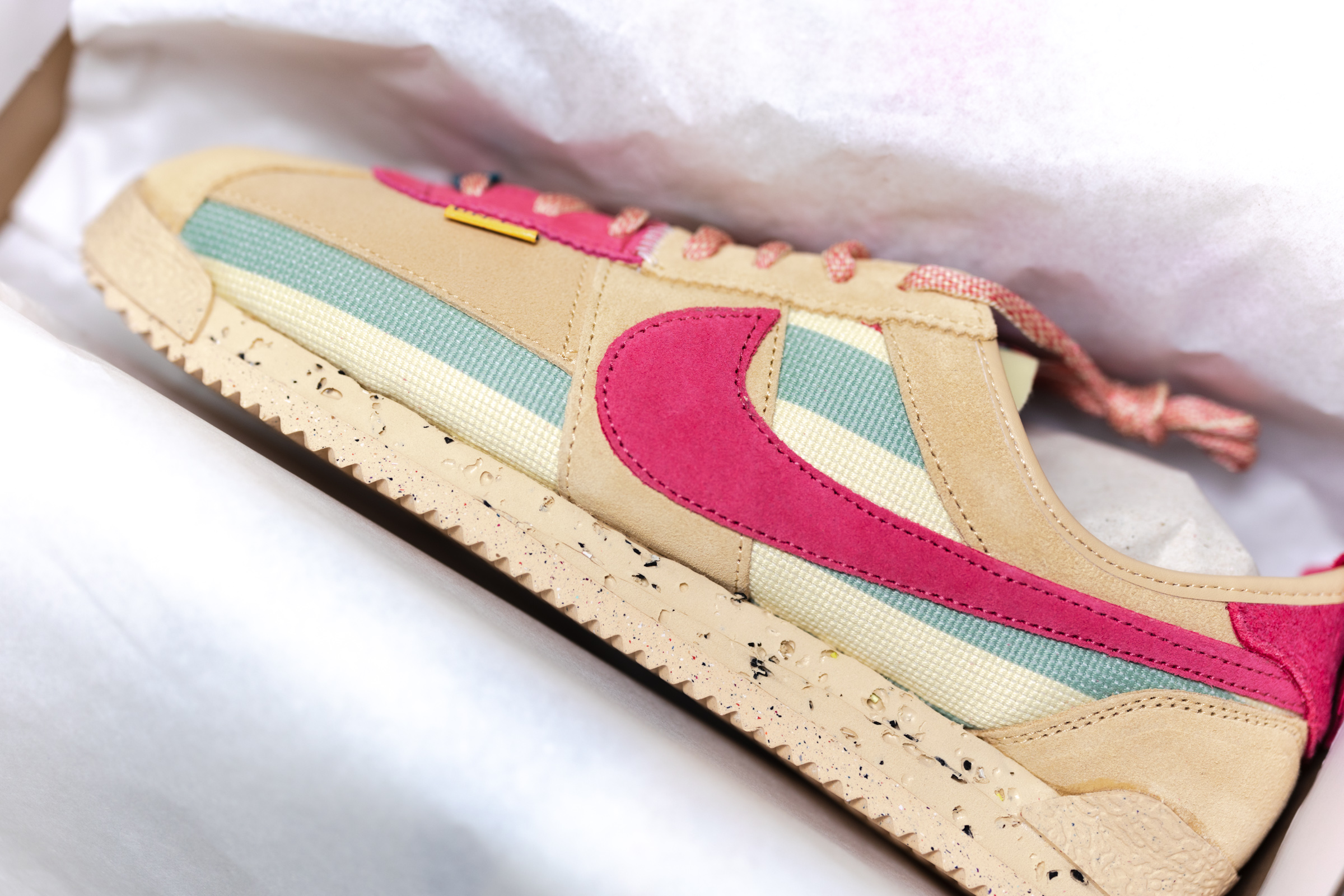 속지를 열면 고개를 내미는 본품 스니커즈. 강렬한 핫핑크 컬러의 나이키 스우시가 먼저 눈에 띄고 그 다음으로 수많은 디테일이 보입니다. 기존 코르테즈 슈즈의 심플함과는 다소 거리가 있습니다.
