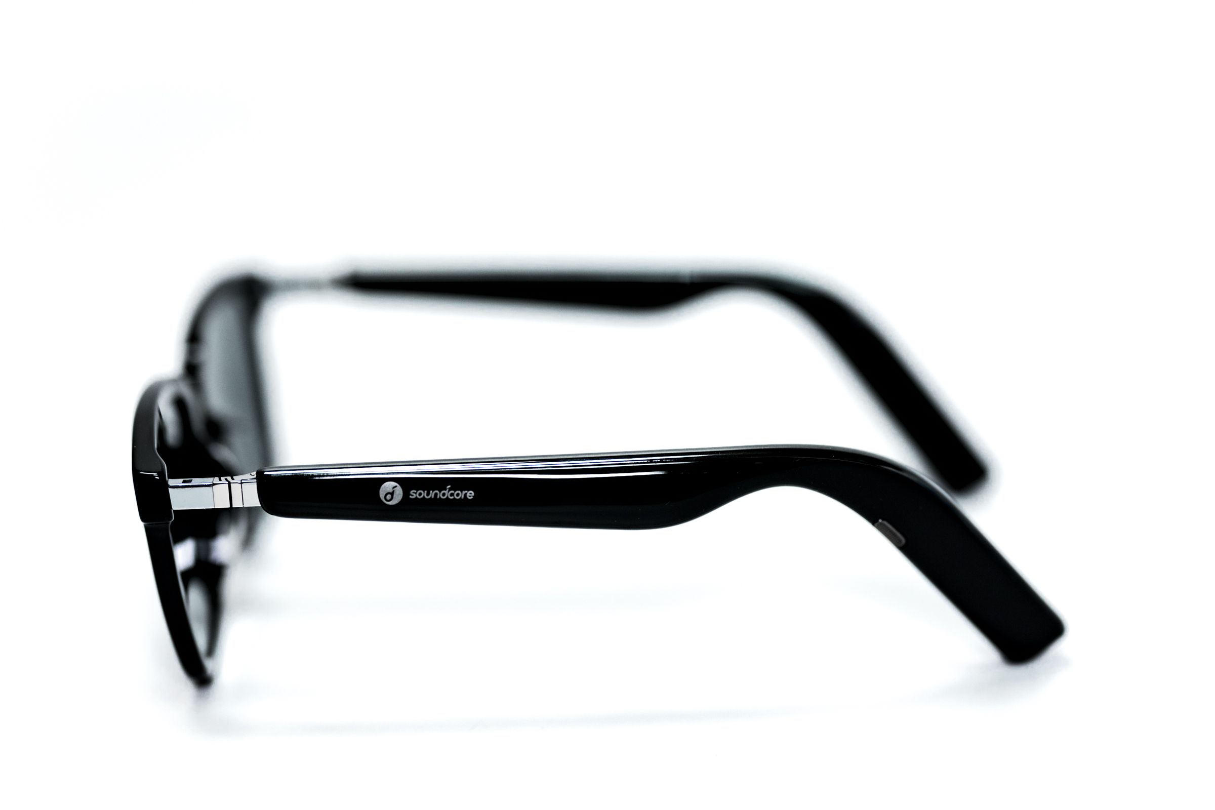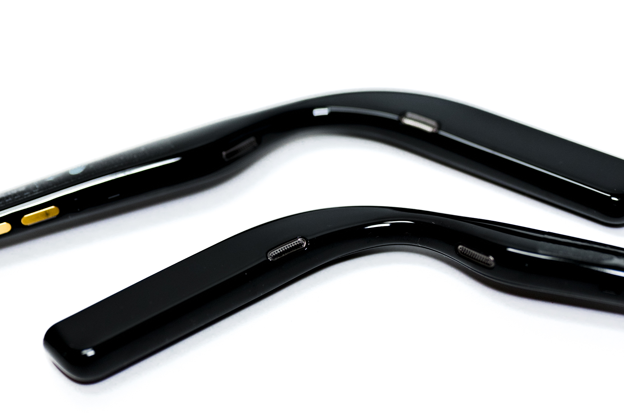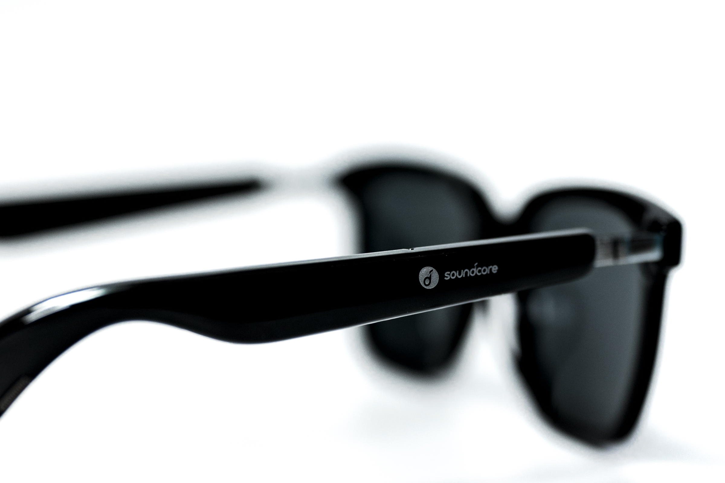 사운드코어 프레임의 본체는 바로 이 두 개의 안경 다리입니다. 부러진 뿔테 안경의 다리 같지만 이 안에 네 개의 스피커, 무선 통신 모듈, 배터리 등이 탑재돼 있습니다. 타사의 초창기 오디오+선글라스 제품들은 본체의 부피와 무게가 일반적인 안경에 비해 부담스러웠는데 이 정도면 큰 이질감 없이 착용할 수 있겠습니다.