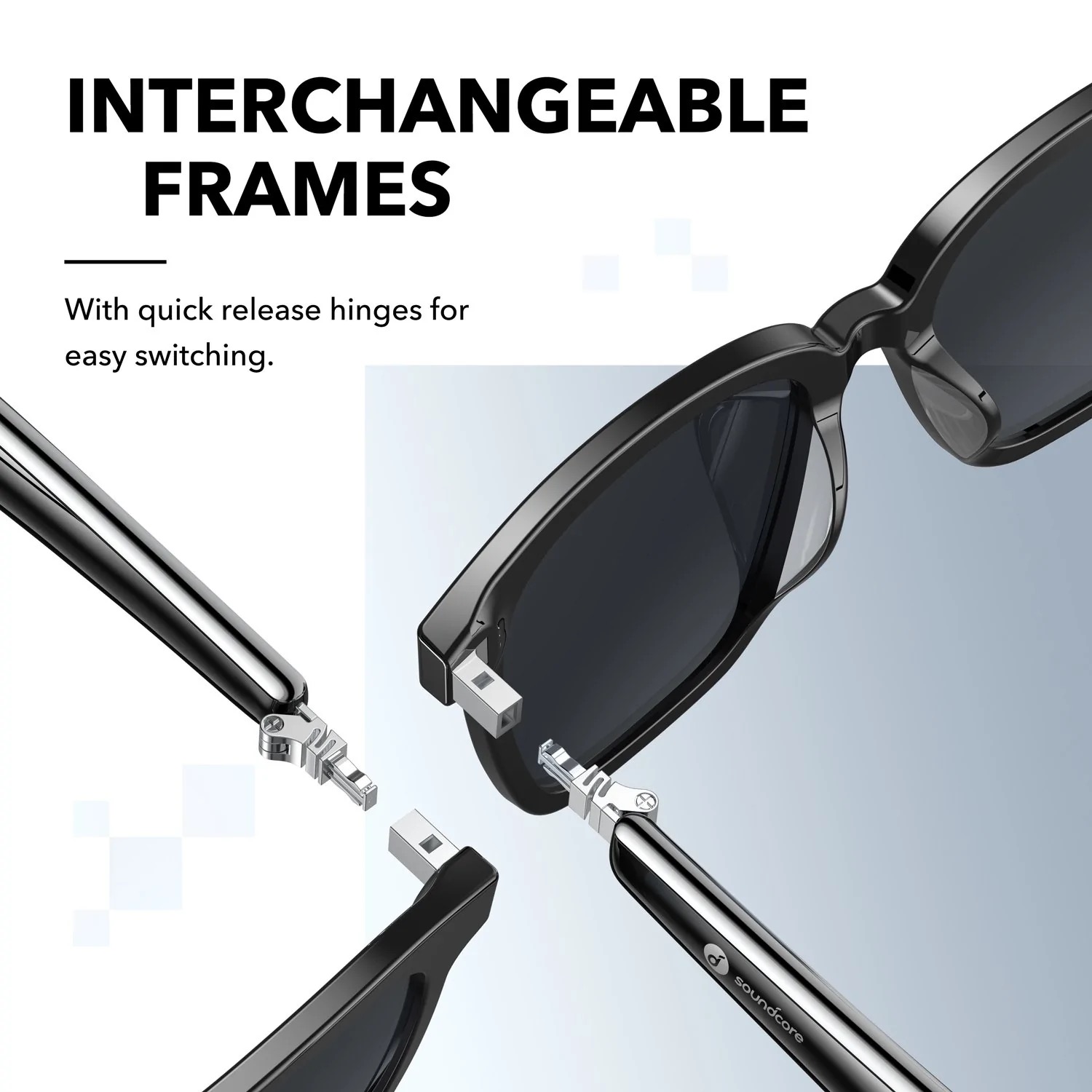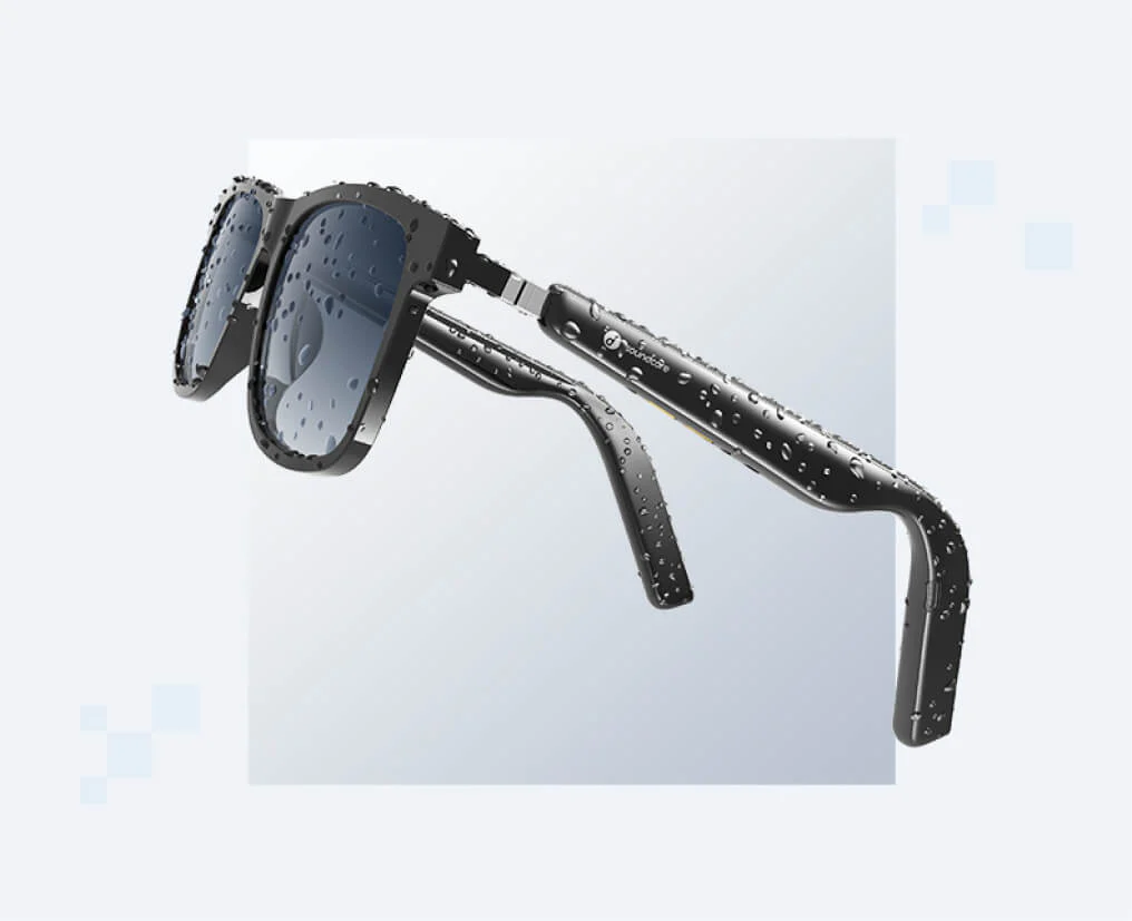 겉모습은 선글라스지만 양쪽 다리 부분에 4개의 스피커가 있는 오디오 디바이스입니다. 음악을 듣거나 마이크를 통해 음성 통화도 할 수 있습니다. 무선 이어폰을 대신하는 개인용 오디오 기기라고 할 수 있겠네요. 렌즈가 있는 프레임과 본체를 분리할 수 있어 다양한 형태의 선글라스/안경으로 교체할 수 있는 것이 장점입니다. 평소엔 안경으로, 야외 활동에서는 선글라스로 활용 폭이 넓습니다. 그에 맞춰 IPX4 등급 방수를 지원하고요.