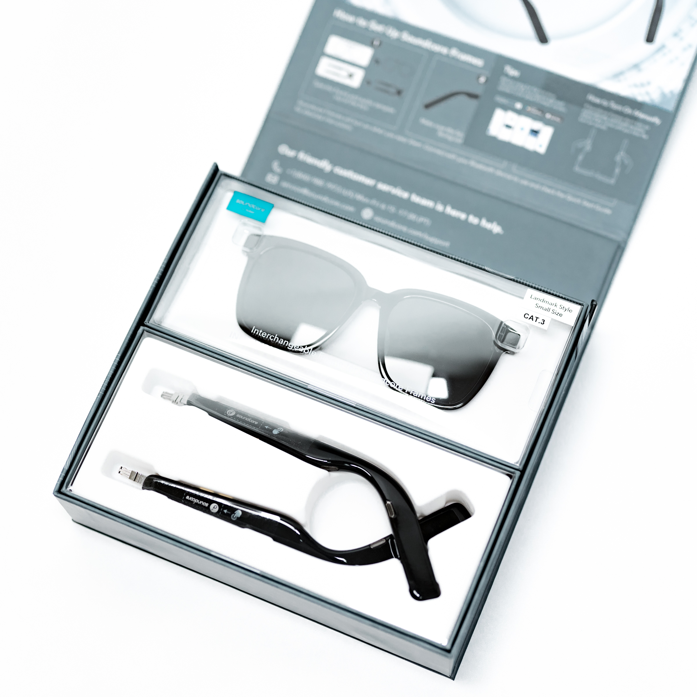 앤커의 상위 제품군은 패키지 구성이 깔끔하면서도 다른 브랜드와 차별화되어 있습니다. 자석으로 고정된 상자 덮개를 열면 프레임 본체와 교체 가능한 프레임이 별도 포장으로 담겨 있습니다. 제가 사용하는 프레임은 기본적인 형태의 선글라스 프레임인 Landmark - Black입니다.