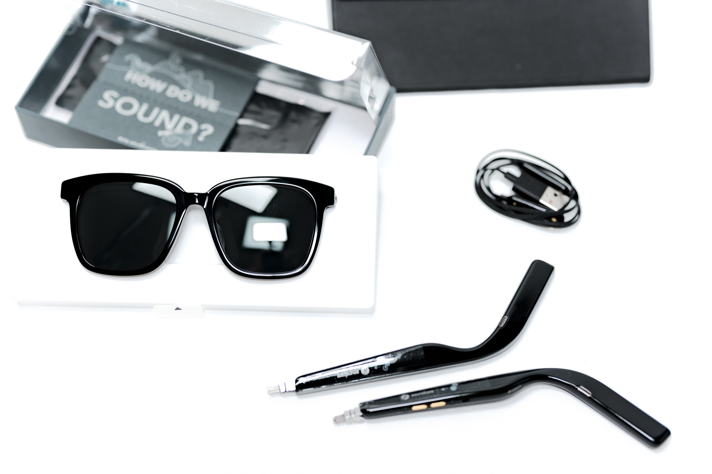 패키지는 오디오 디바이스의 그것 같기도, 선글라스의 포장 같기도 합니다. 충전 케이블과 퀵 스타트 가이드, 안경 닦는 천과 캐링 케이스가 있습니다. 아직은 생소한 제품군이다보니 박스 안쪽과 매뉴얼 등 곳곳에서 사용법을 설명하고 있습니다.