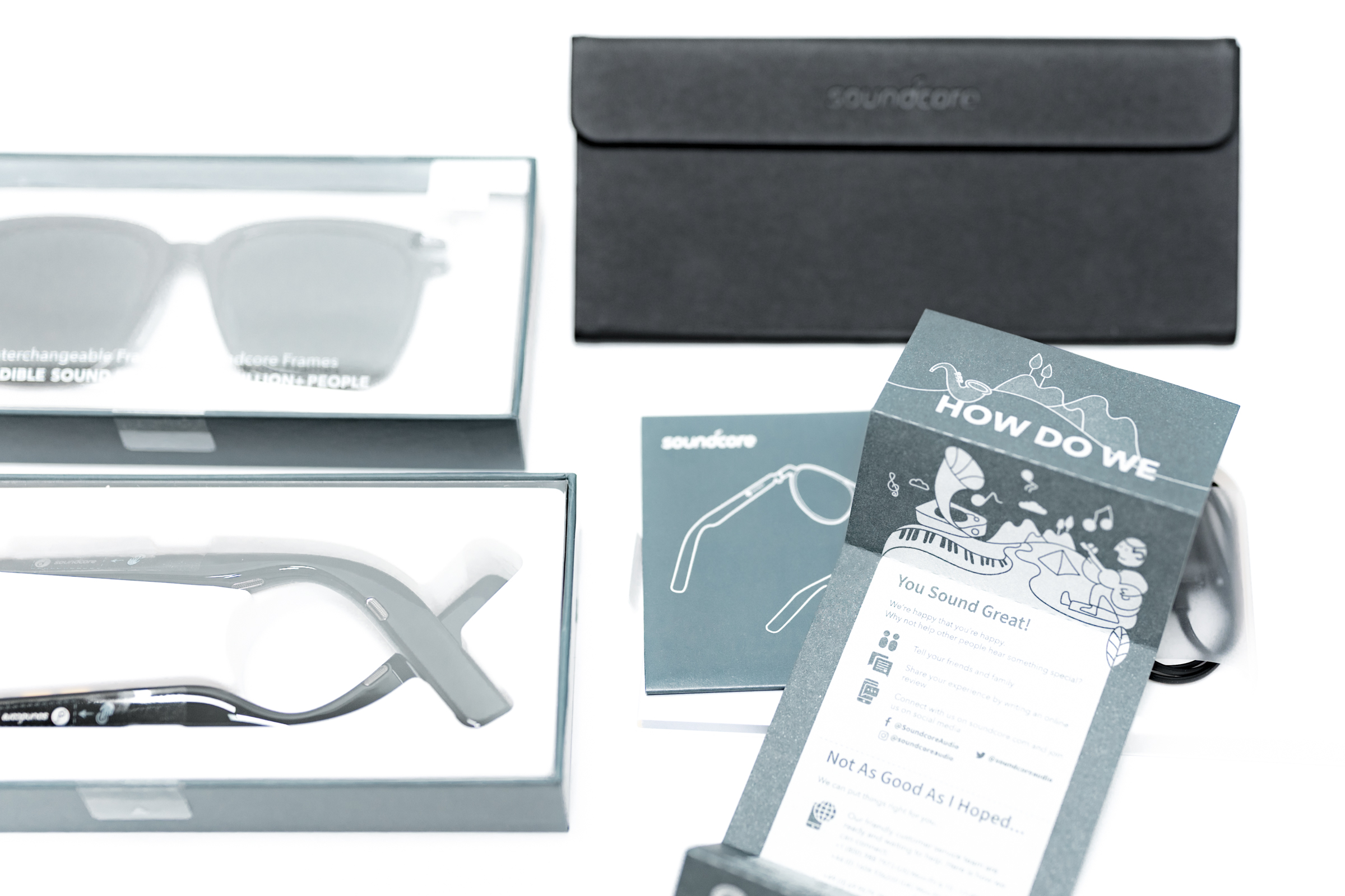 선글라스와 무선 스피커를 합친 사운드 코어 프레임. 앤커의 신제품 중 가장 기대했던 제품입니다. 왜 그런 거 있잖아요, 사도 자주 쓰지 않을 것 같은데, 나한테 유용할 지도 잘 모르겠는데 갖고는 싶은 제품. 겉모습만 보면 일반적인 선글라스와 차이가 없으면서도 음악 감상부터 음성 통화, 시리/구글 어시스턴트 기능 등을 이용할 수 있는 점이 호기심을 자극했습니다. 산책을 할 때, 자전거를 탈 때 유용하겠구나,라고 합리화를 했습니다.