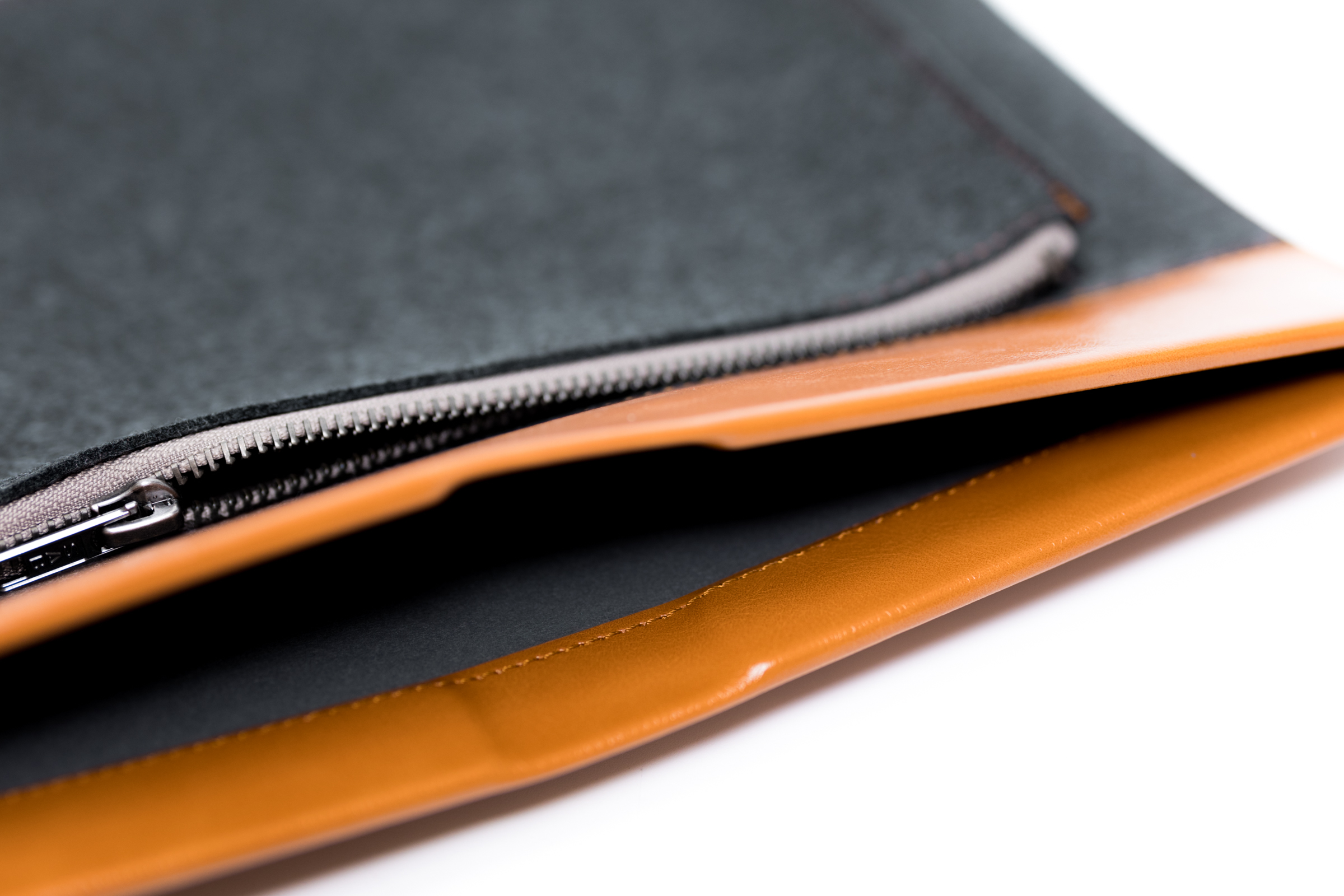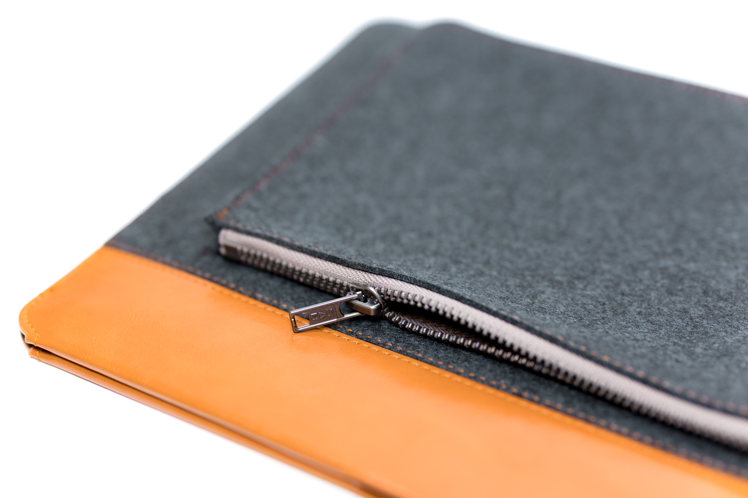소재는 고급 제품과 비교하면 아쉬움이 있는 것이 사실입니다. 아이패드 파우치 제품에 사용하기에 펠트 소재와 인조 가죽의 장점이 분명 있지만 질감 및 촉감이 고급스러움과는 다소 거리가 있는 것이 사실이라서요. 다만 마감과 디테일은 준수한 편입니다. 저가형 제품에서 느껴지는 인조가죽 특유의 싼티가 나지 않아서 자세히 보지 않으면 천연 가죽과 큰 차이를 느끼기 어렵습니다. 접합부 봉재와 포켓의 지퍼 등은 흠 잡을 데 없이 좋습니다.