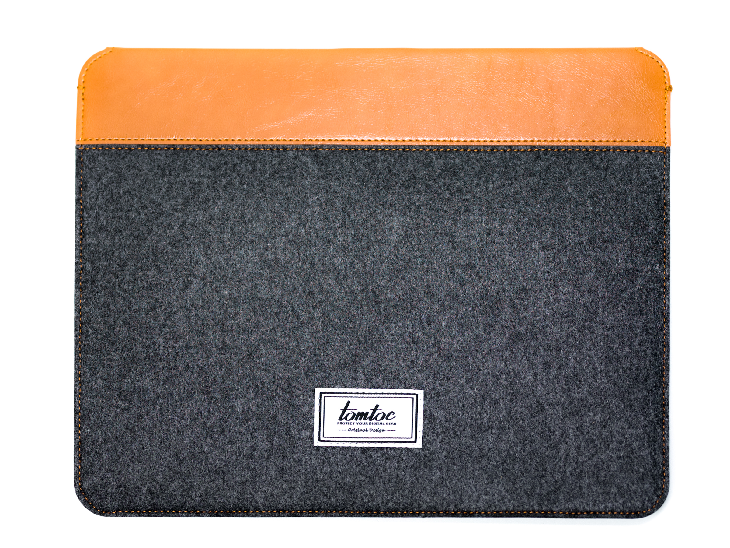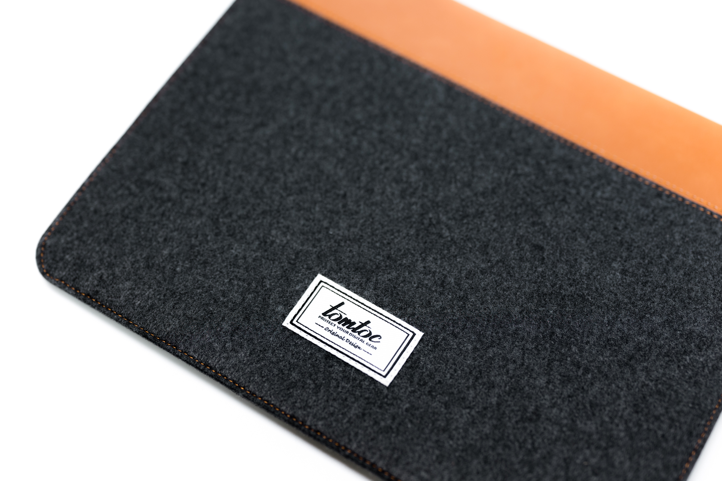 다소 거칠지만 가볍고 내구성 좋아서 펠트 소재 파우치 제품을 선호합니다. 충격 흡수 효과도 일정 부분이나마 기대할 수 있고요. 인조가죽 소재는 상단 약 20% 면적을 차지합니다. 접합부 스티치, 브랜드 라벨 때문인지 클래식한 인상이 강한 제품입니다.