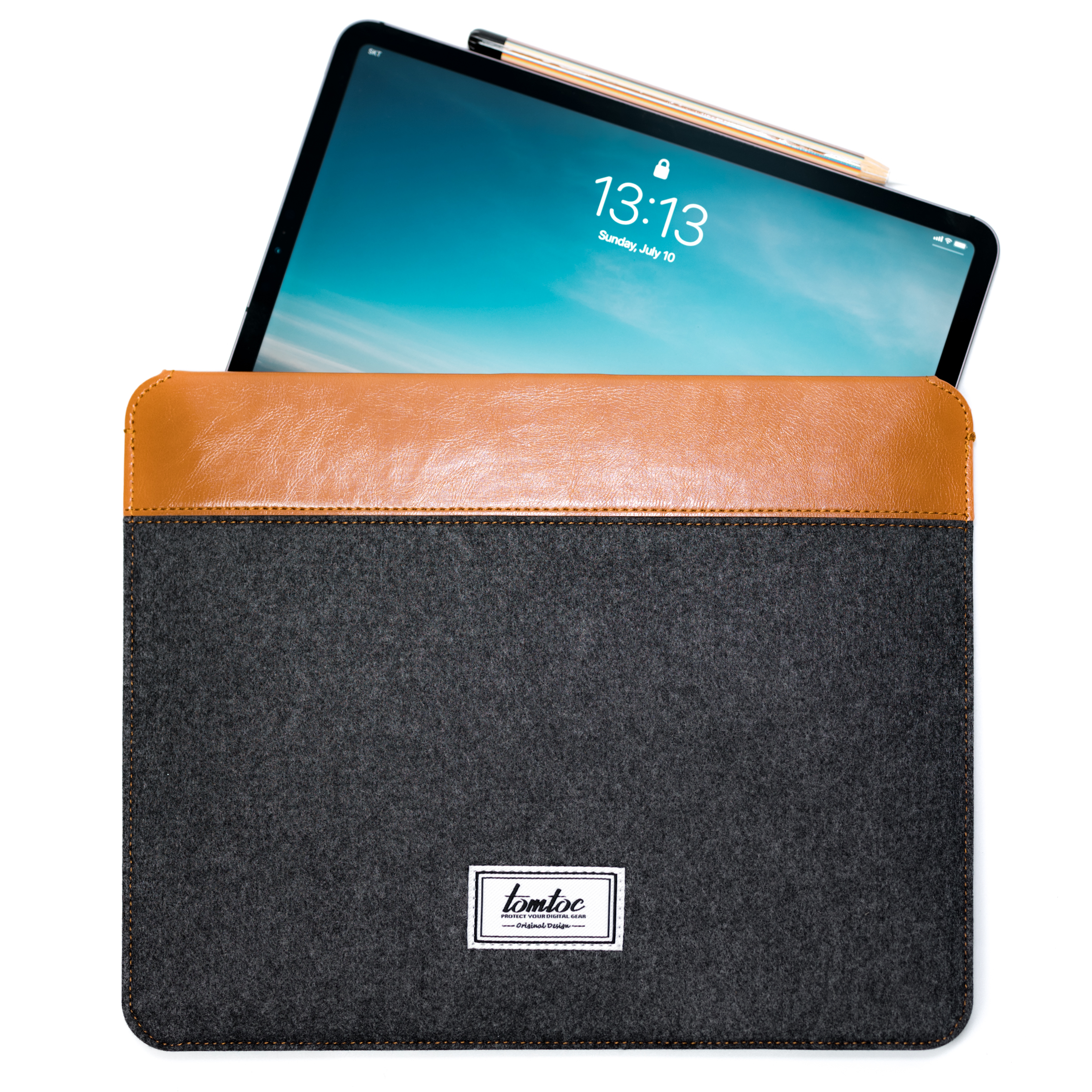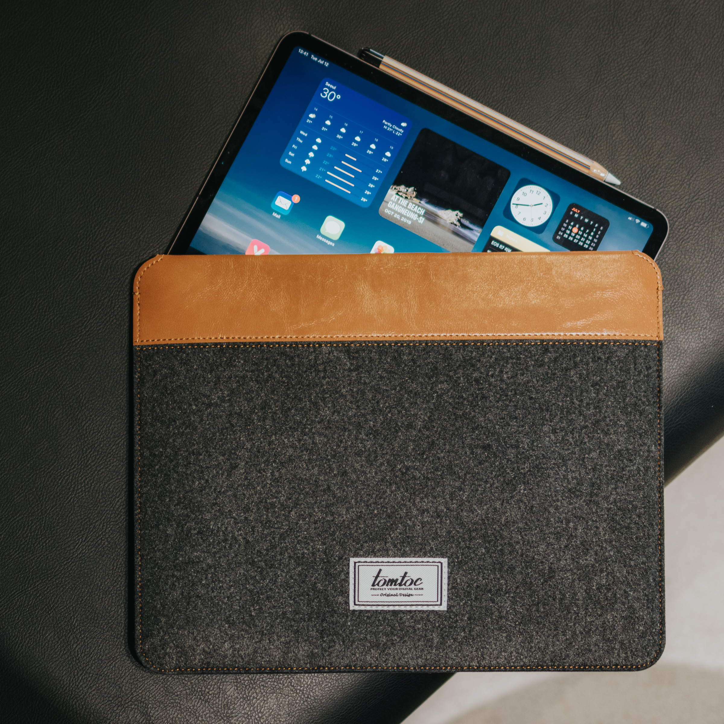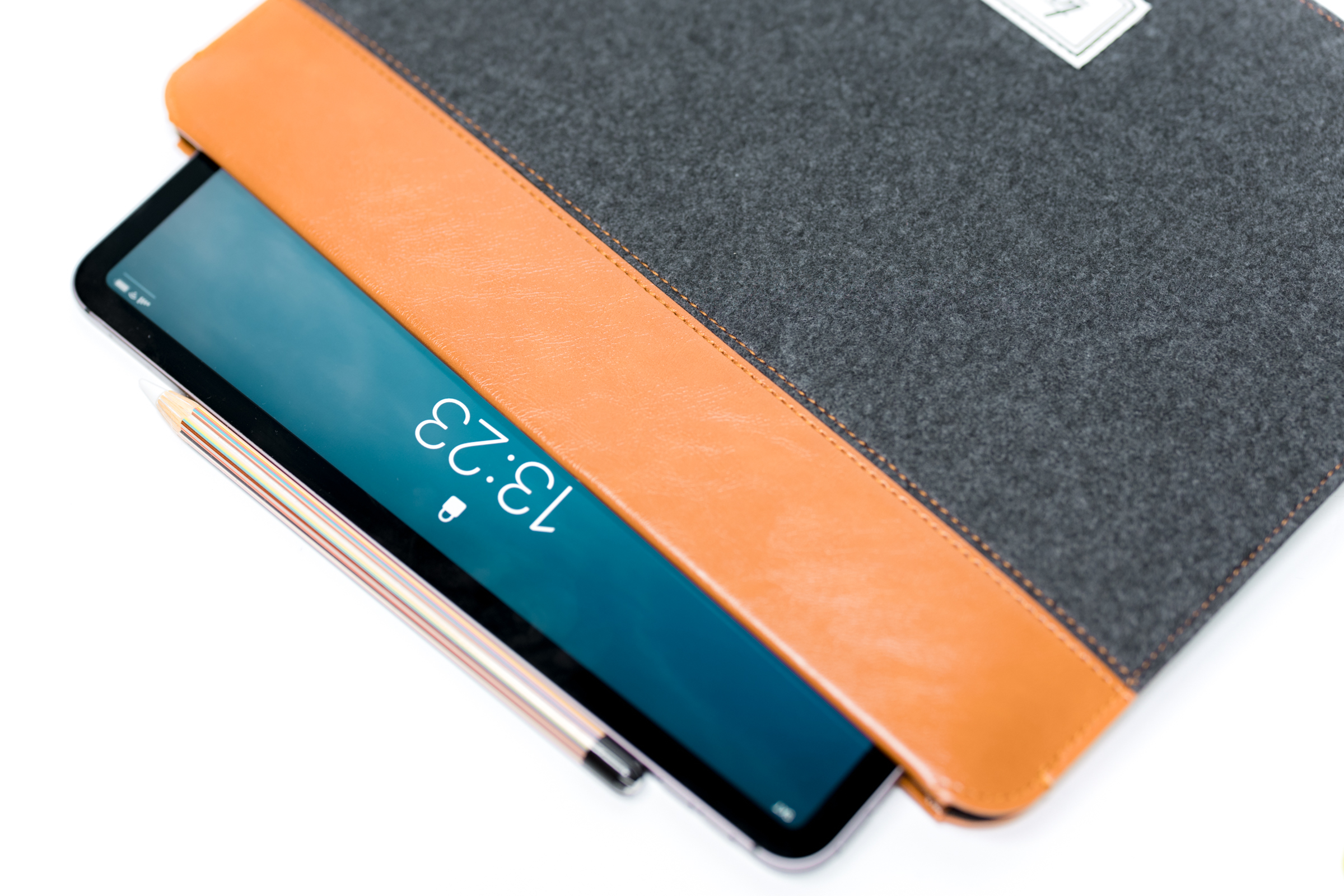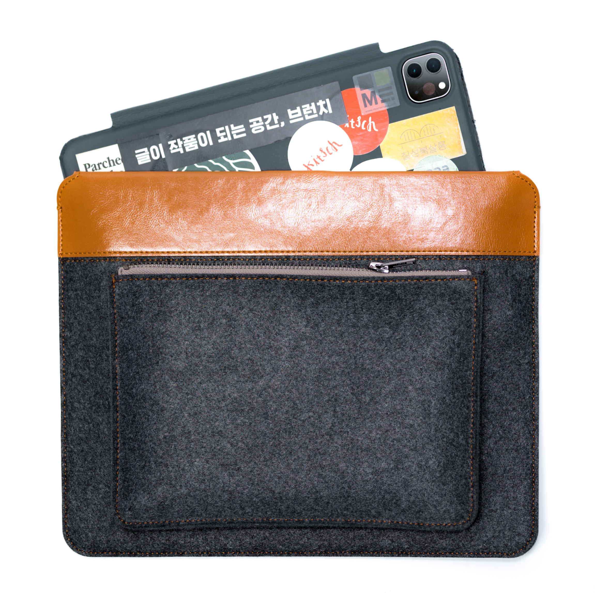 펠트 소재에 자주 여닫는 입구를 인조가죽으로 덧댄 구성입니다. 천연가죽이 아닌 것이 아쉽긴 해도 과거 천연 가죽 제품을 사용했을 때를 돌아보면 태닝과 수분/유분에 강한 인조가죽이 내구성 면에서는 나을 수 있겠습니다. 가격 역시 그만큼 저렴하고요. 제품을 수납하는 내부 크기는 약 257 x 193mm로 아이패드 프로 11인치 크기 247.6 x 178.5 mm 보다 여유있게 제작됐습니다. 덕분에 웬만한 케이스류는 결합한 채로 파우치에 보관할 수 있습니다.