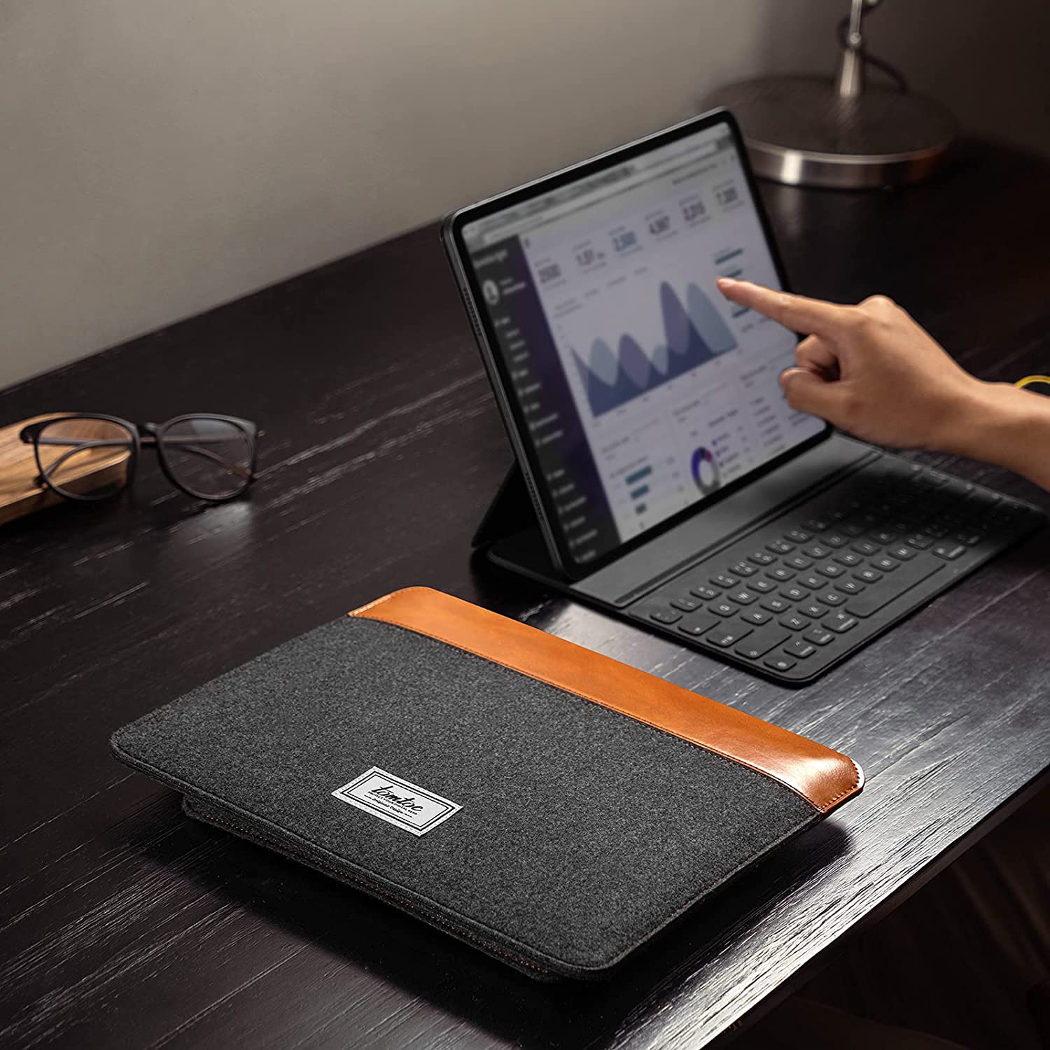 펠트 소재에 자주 여닫는 입구를 인조가죽으로 덧댄 구성입니다. 천연가죽이 아닌 것이 아쉽긴 해도 과거 천연 가죽 제품을 사용했을 때를 돌아보면 태닝과 수분/유분에 강한 인조가죽이 내구성 면에서는 나을 수 있겠습니다. 가격 역시 그만큼 저렴하고요. 제품을 수납하는 내부 크기는 약 257 x 193mm로 아이패드 프로 11인치 크기 247.6 x 178.5 mm 보다 여유있게 제작됐습니다. 덕분에 웬만한 케이스류는 결합한 채로 파우치에 보관할 수 있습니다.