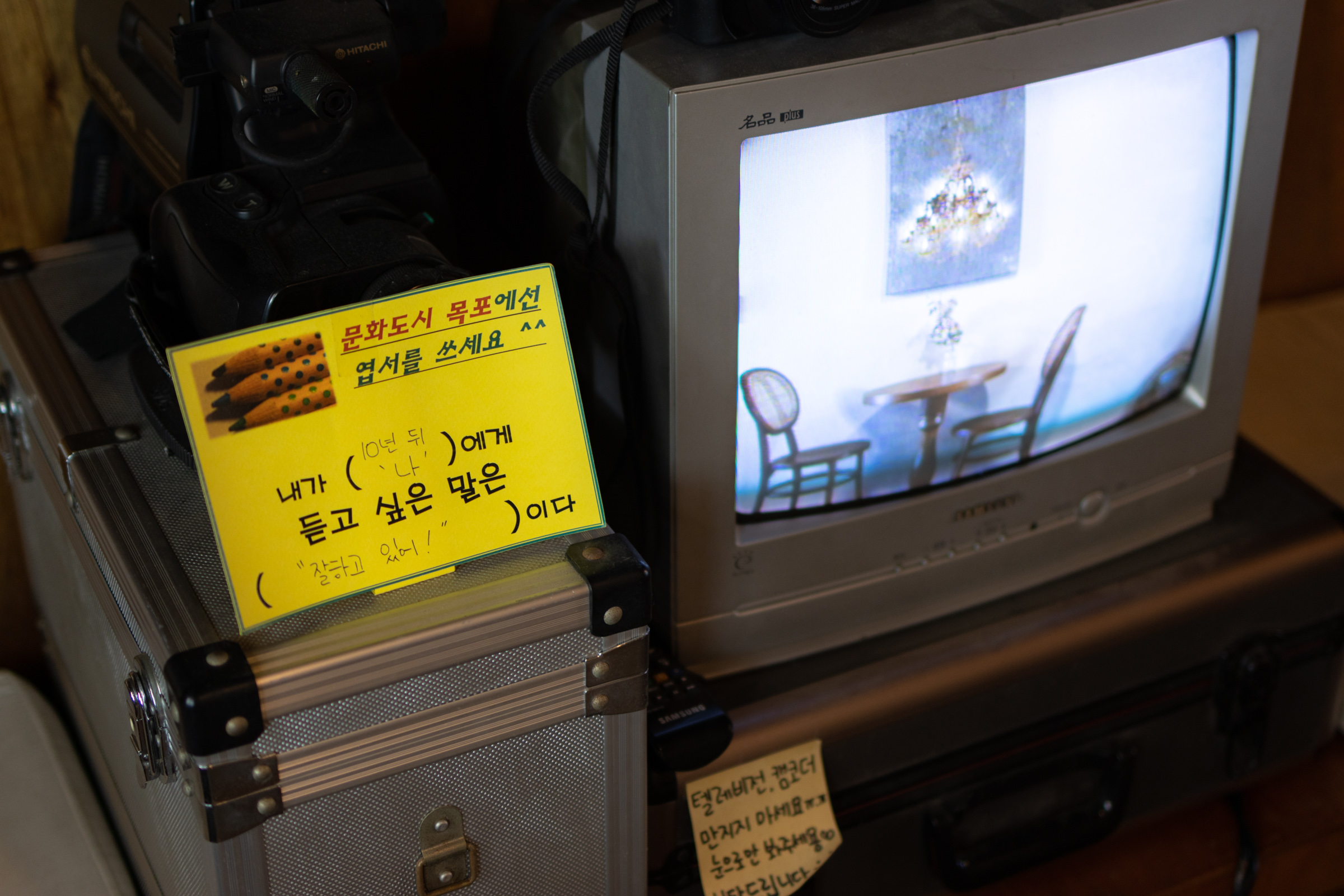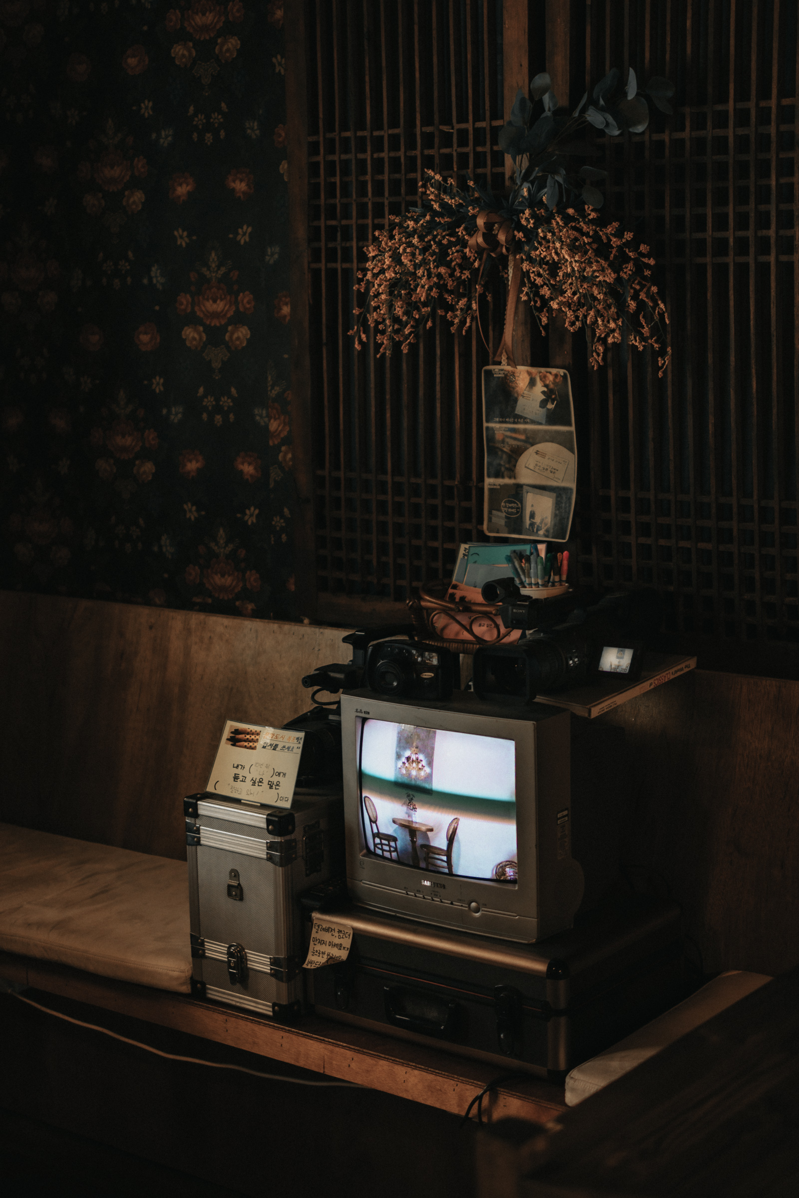 오래된 소니 캠코더를 브라운관 TV에 연결한 재미있는 공간. 건너편 테이블에 앉으면 TV에 내 모습이 보입니다. 기억에 남을 포토존 중 한 곳이 되겠네요.