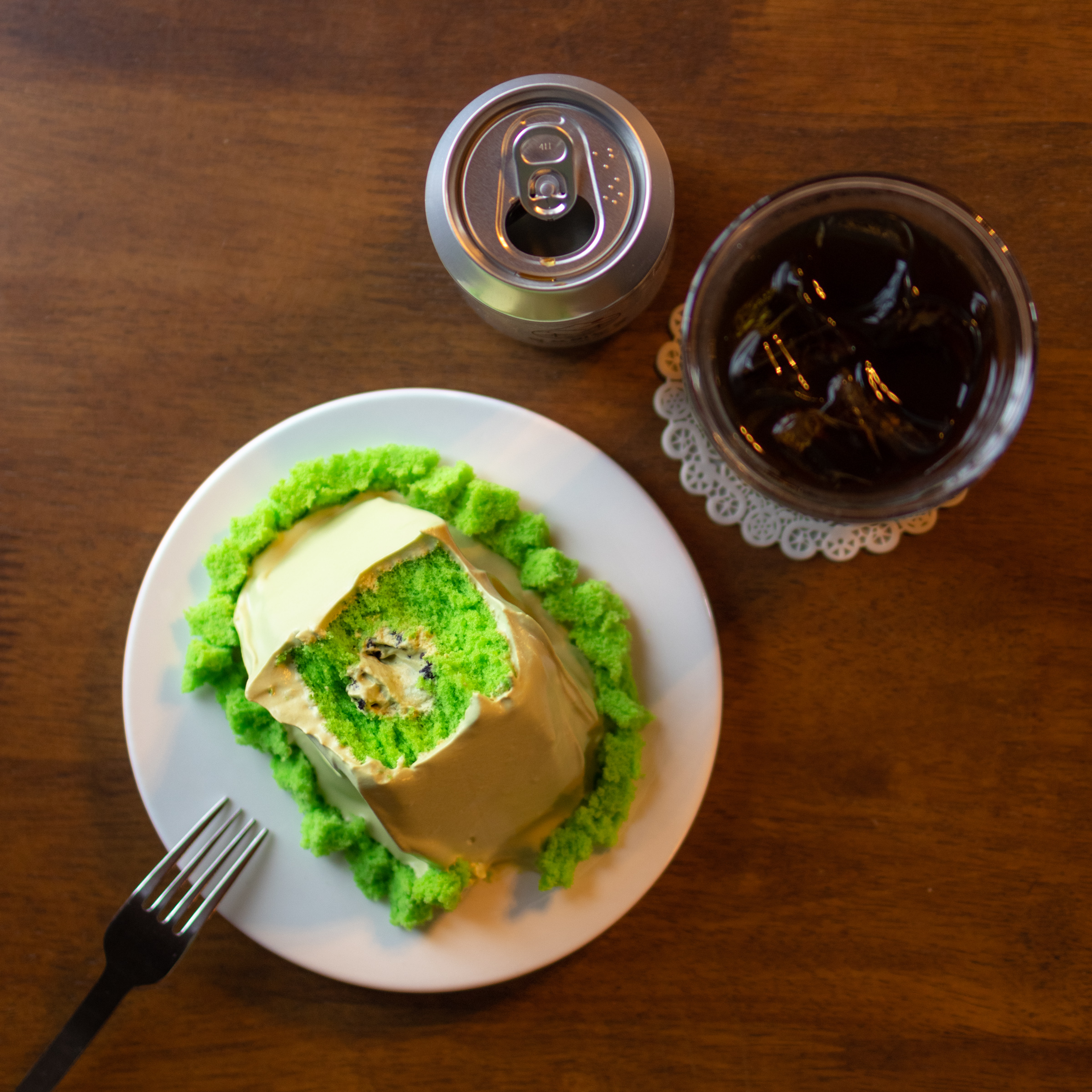 이 집 시그니처인 유달산 케이크와 목포의 눈물 커피를 시켰습니다. 목포 유달산을 형상화 한 케이크로 녹차, 딸기, 로터스 쿠키 맛 세 가지가 있습니다. 삼각형 산 모양에 윗쪽에 얹은 크림은 구름을 표현한 것 같네요. 주변엔 녹색 빵 조각을 둘렀는데 그 모양이 숲처럼 보여서 재미있습니다.