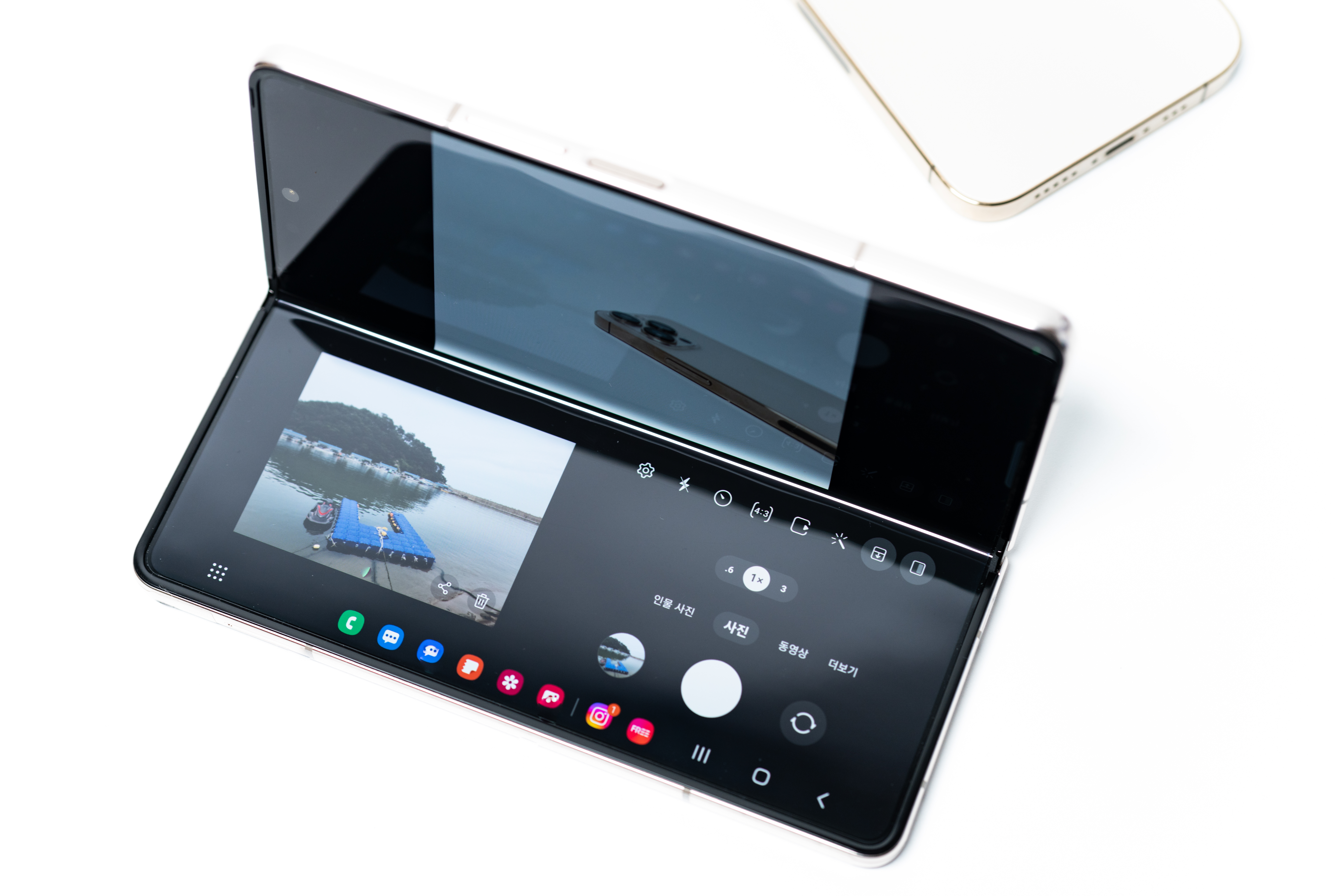 아, 폴드 시스템에 맞춘 플렉스 모드를 카메라 앱에서 지원합니다. 윗쪽엔 촬영 화면, 아랫쪽엔 UI와 기존 촬영 이미지가 표시됩니다. 이건 다른 폰과 매우 큰 차이가 있네요.