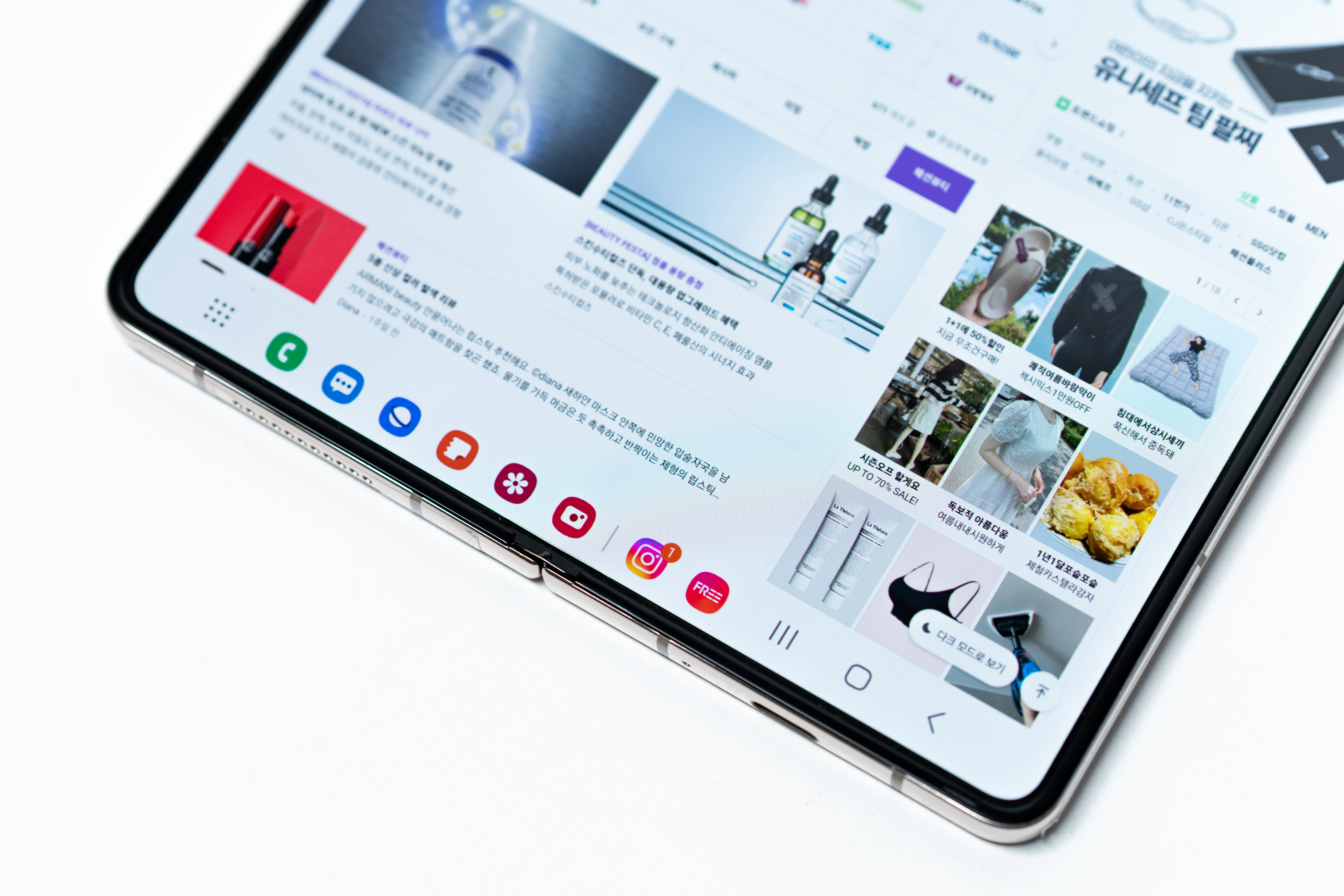 화면 하단에 마치 PC 운영 체제의 작업 표시줄처럼 앱 아이콘을 배치한 것은 매우 영리한 선택입니다. 넓은 화면을 효과적으로 활용한 것도, 멀티 태스킹 효율이 크게 높아진 것을 실감할 수 있었습니다. 이번 폴드 4가 전작 대비 디자인 변화가 적은 것이 약점으로 꼽히기도 하는데, 이런 소프트웨어, 편의 장치 보강이 실사용자들에게는 오히려 더 크게 다가올 수도 있겠습니다. 사실 이쯤 되면 화면 크기를 조금 더 키우는 것은 큰 의미가 없으니까요.