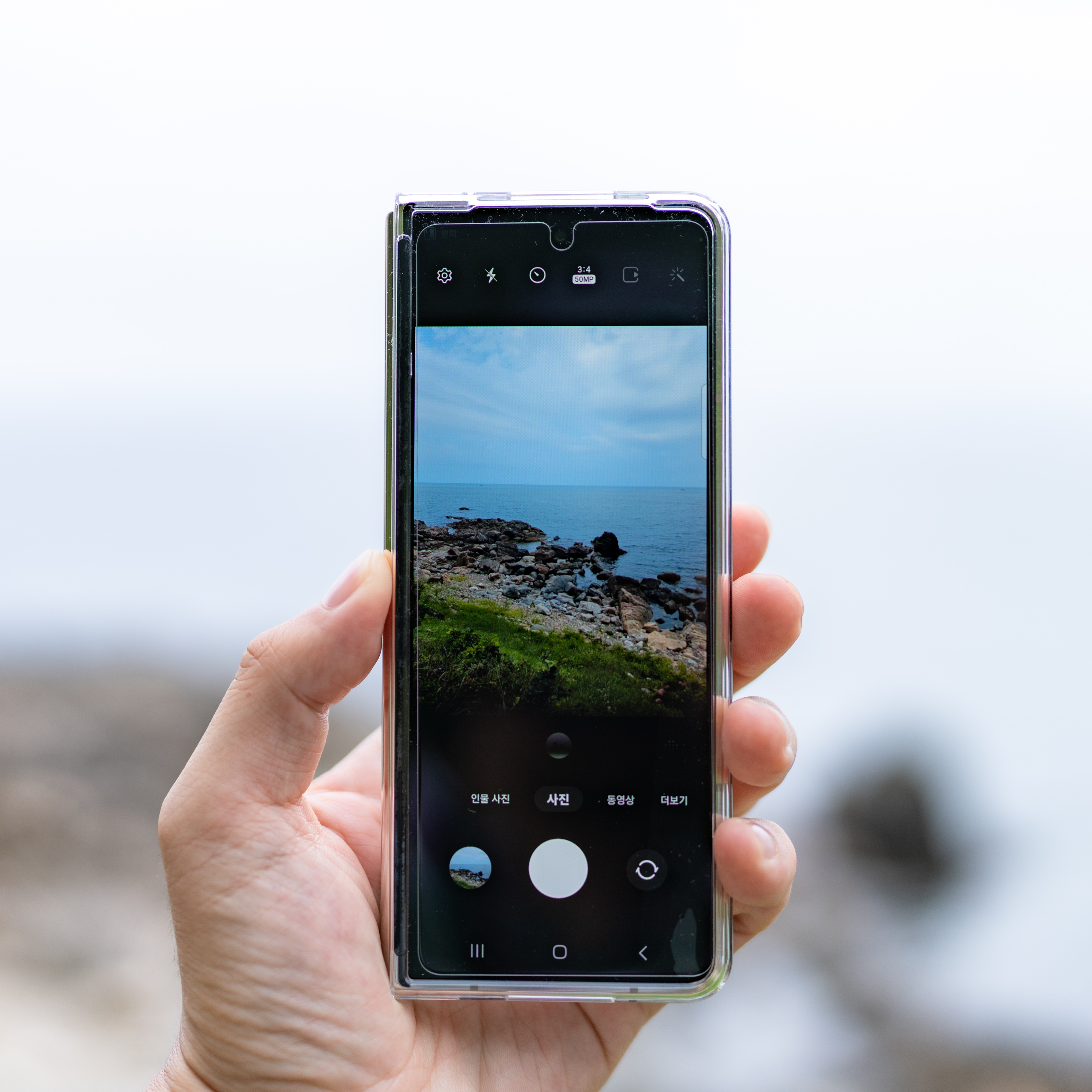 아, 폴드 시스템에 맞춘 플렉스 모드를 카메라 앱에서 지원합니다. 윗쪽엔 촬영 화면, 아랫쪽엔 UI와 기존 촬영 이미지가 표시됩니다. 이건 다른 폰과 매우 큰 차이가 있네요.