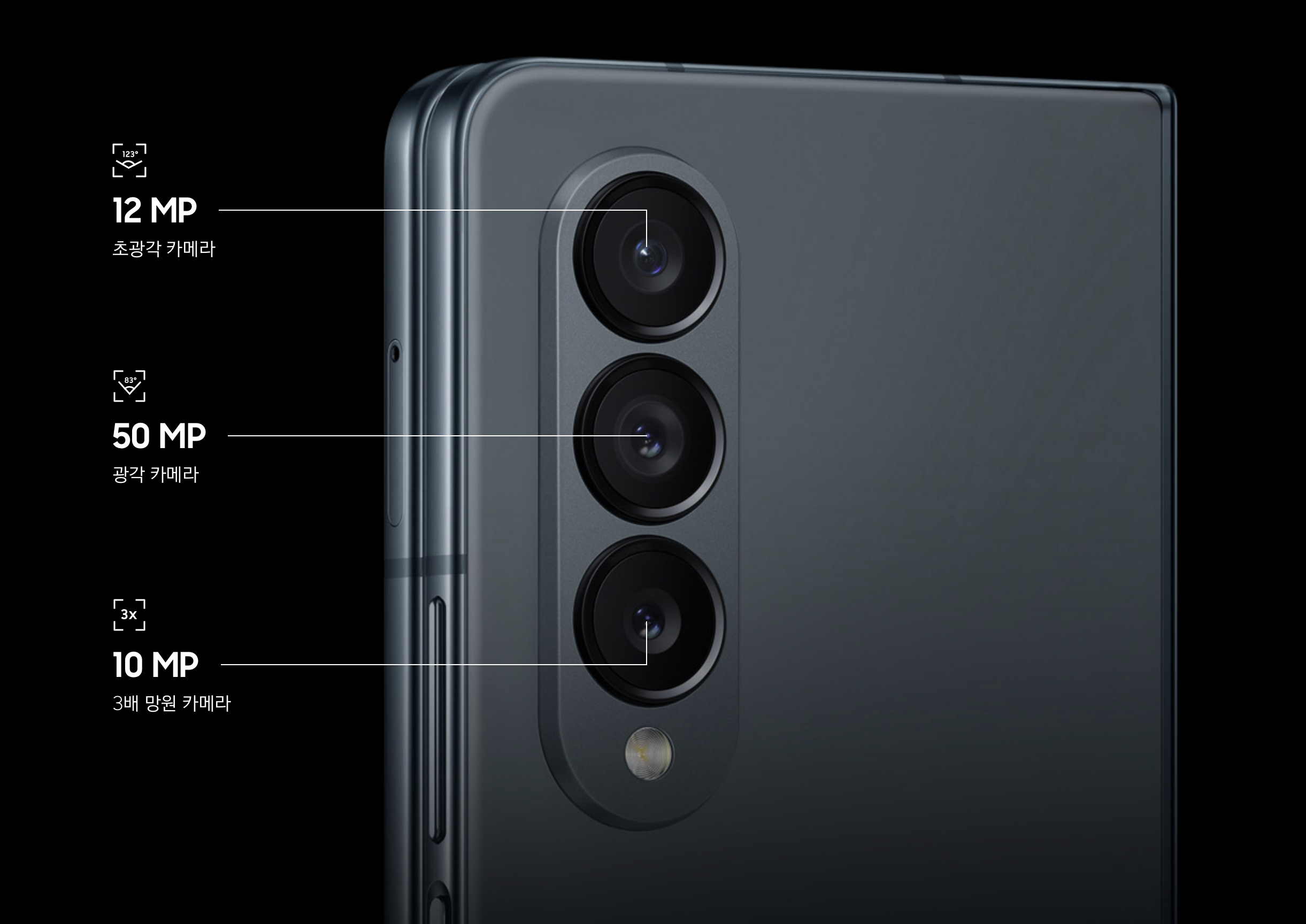 다양한 장치와 기능들 중 카메라에 대해 중점적으로 이야기하려고 합니다. 사흘간의 대여 기간이 이 제품을 제대로 경험하기에는 너무 짧기도 했고, 업무상 스마트폰 카메라에 관심이 많아서요. 예전 시리즈에서도 그랬는지 모르지만, 이번 Z 폴드 4에서는 '프로급 카메라'를 제품 소재의 중요한 키워드로 내세웠습니다. 그간 Z 시리즈는 S 시리즈보다 카메라는 한 세대 이전 또는 한 단계 낮은 등급의 모듈을 사용한 것으로 알고 있는데 이번엔 달라졌을지 궁금했어요. 갤럭시 Z 폴드 4의 카메라 사양은 아래와 같습니다.