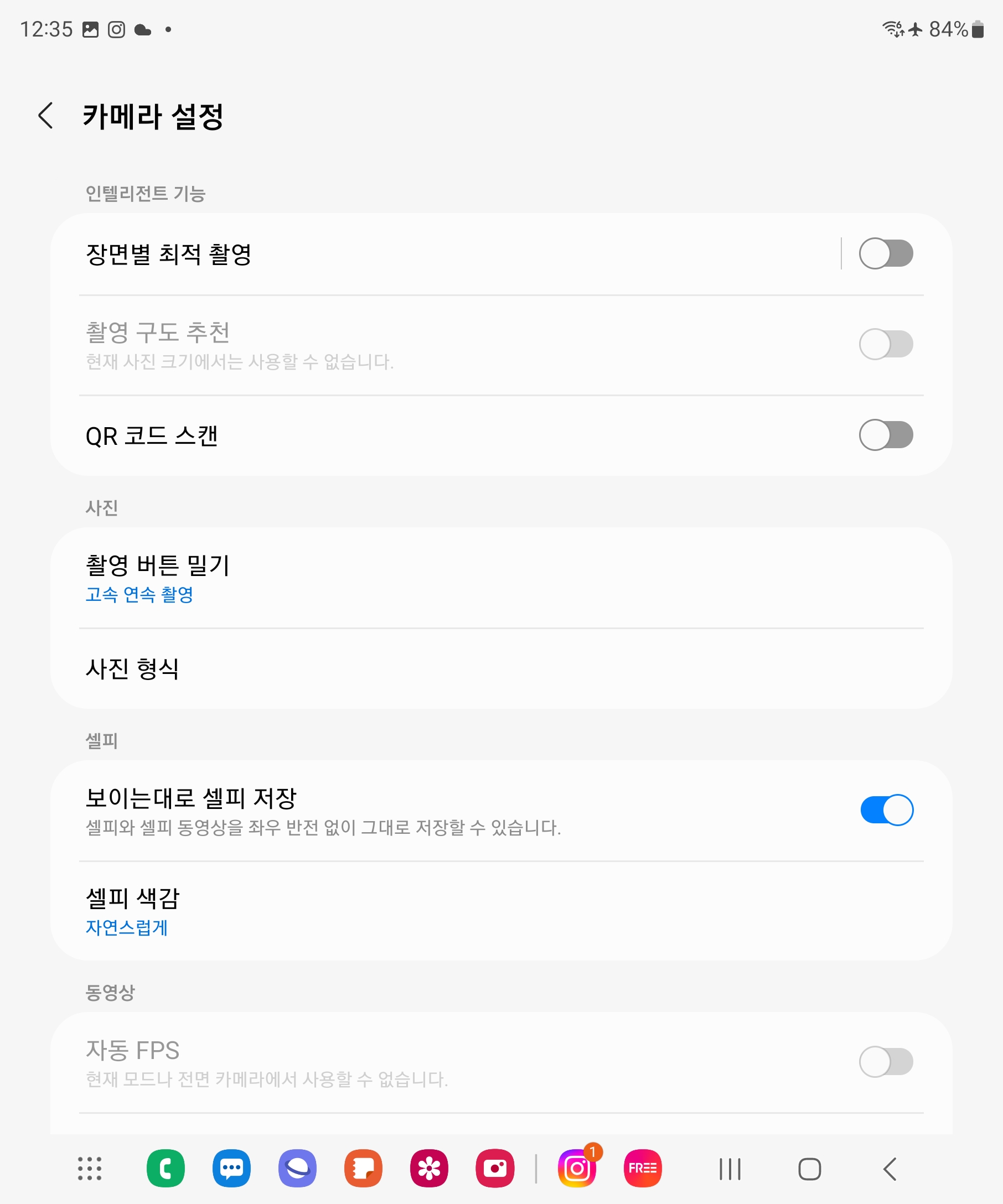 카메라 앱은 제가 최근까지 테스트했던 S21, S22 모델과 거의 동일합니다. 디지털 카메라의 인텔리전트 자동 모드에 해당하는 장면별 최적 촬영, HEIF/RAW 촬영 지원, GIF 즉시 촬영, 야간 촬영 모드 등이 새롭게 보였습니다. 하지만 신규/특화 기능을 제외하면 전반적인 UI는 기존 갤럭시 폰과 동일합니다.