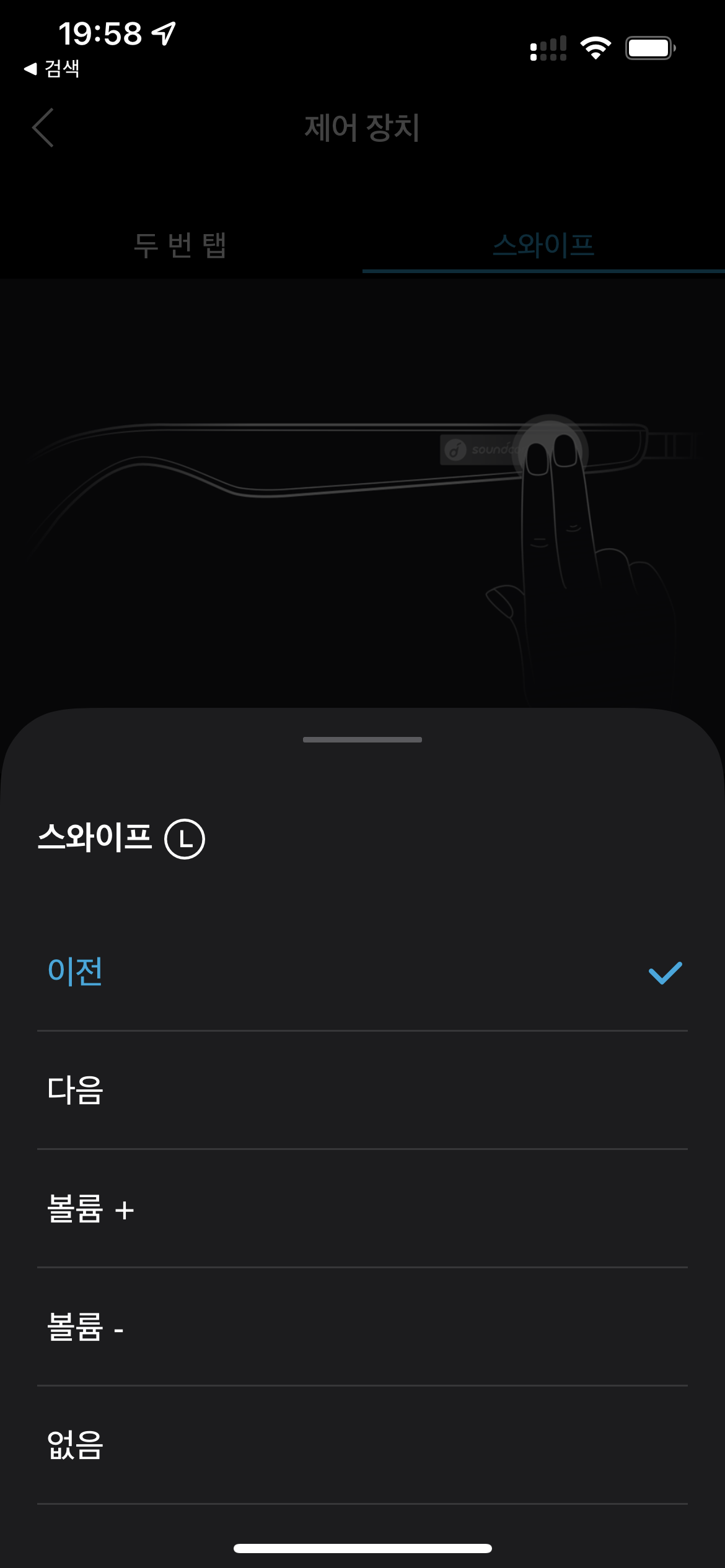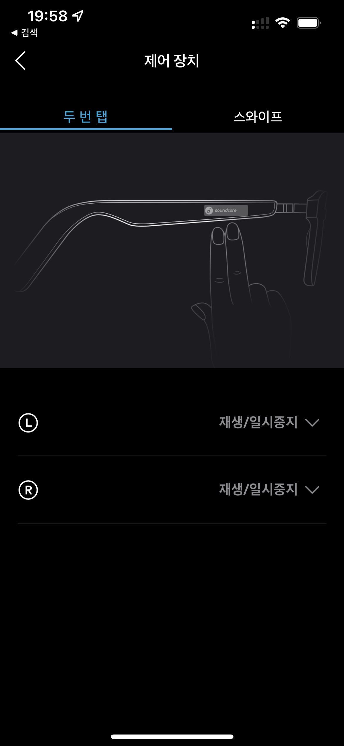 각각의 동작에 원하는 작업을 지정할 수 있습니다. 재생 제어부터 볼륨 조절, Siri 호출 등 무선 이어폰에서 사용하는 주요 동작을 대부분 지원합니다. 다만 처음엔 안경을 착용한 상태에서 터치를 인식하는 부분을 찾는 데 다소 시간이 필요하겠더라고요. 몇 번 해 보면 익숙해지지만요. 사운드코어 로고가 있는 부분으로 대략 눈과 관자놀이 중간쯤입니다.