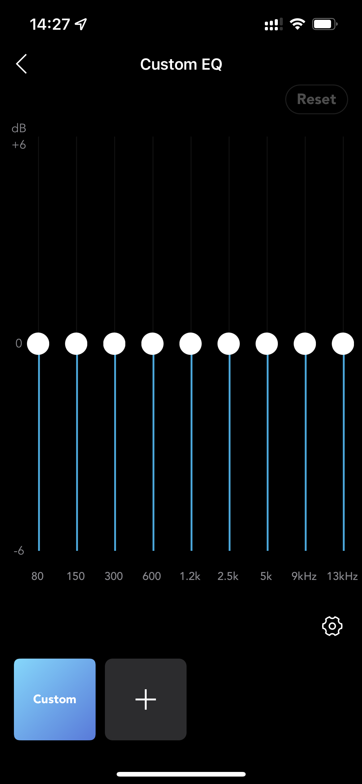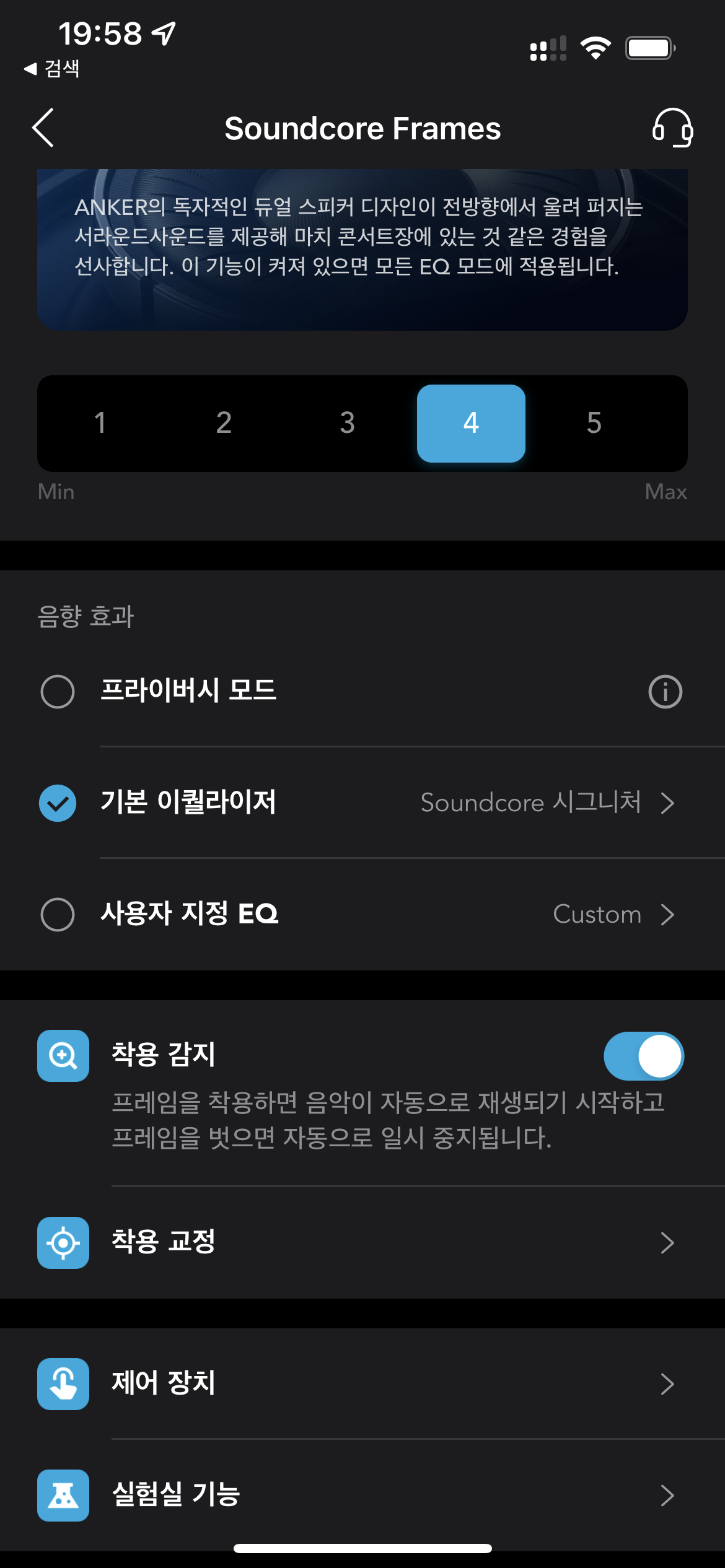 사운드코어 프레임의 가장 중요한 기능은 내장 스피커를 통한 음악 감상과 음성 통화인 만큼 사운드 관련 기능과 옵션이 다양합니다. 특히 양쪽에 두개씩 총 4개의 스피커로 스테레오 사운드를 구성하는 오픈 서라운드 기능은 조용한 실내에서 음악을 감상할 때 생각보다 좋은 소리를 들려줍니다. 아무래도 드라이버 구경 등 전문 사운드 제품보다 음질이 떨어지는 프레임에서 괜찮게 음악 감상을 할 수 있는 방법으로 추천합니다. 거기에 EQ 설정도 웬만한 무선 이어폰과 동급으로 지원됩니다. 몇 가지 프리셋을 제공하고 커스텀 EQ를 설정할 수도 있습니다.