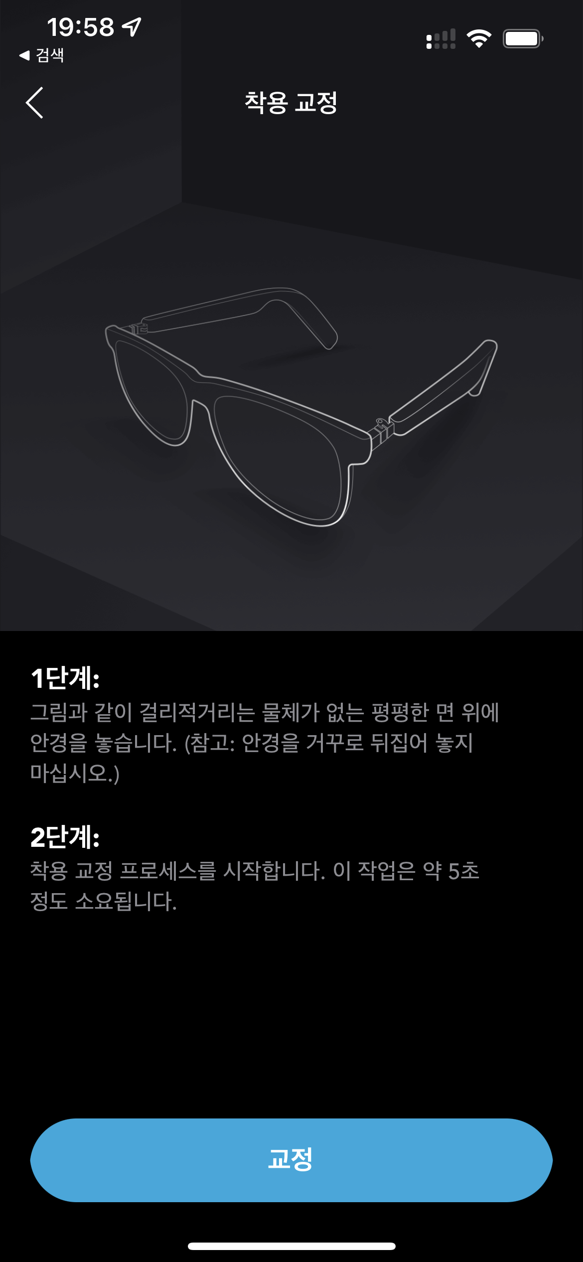 안경 착용을 인식해 음악을 재생/정지하는 착용 감지 옵션이 제공되는 것도 무선 이어폰 제품과 동일합니다. 착용 교정은 인이어 이어폰의 그것을 연상 시킵니다. 착용 감지의 정확도를 높이고 제품이 보다 정확하게 동작하기 위해 필요한 과정이겠죠. 방법이 무척 간단해서 처음 연결할 때 한 번 실행하는 게 좋겠습니다.
