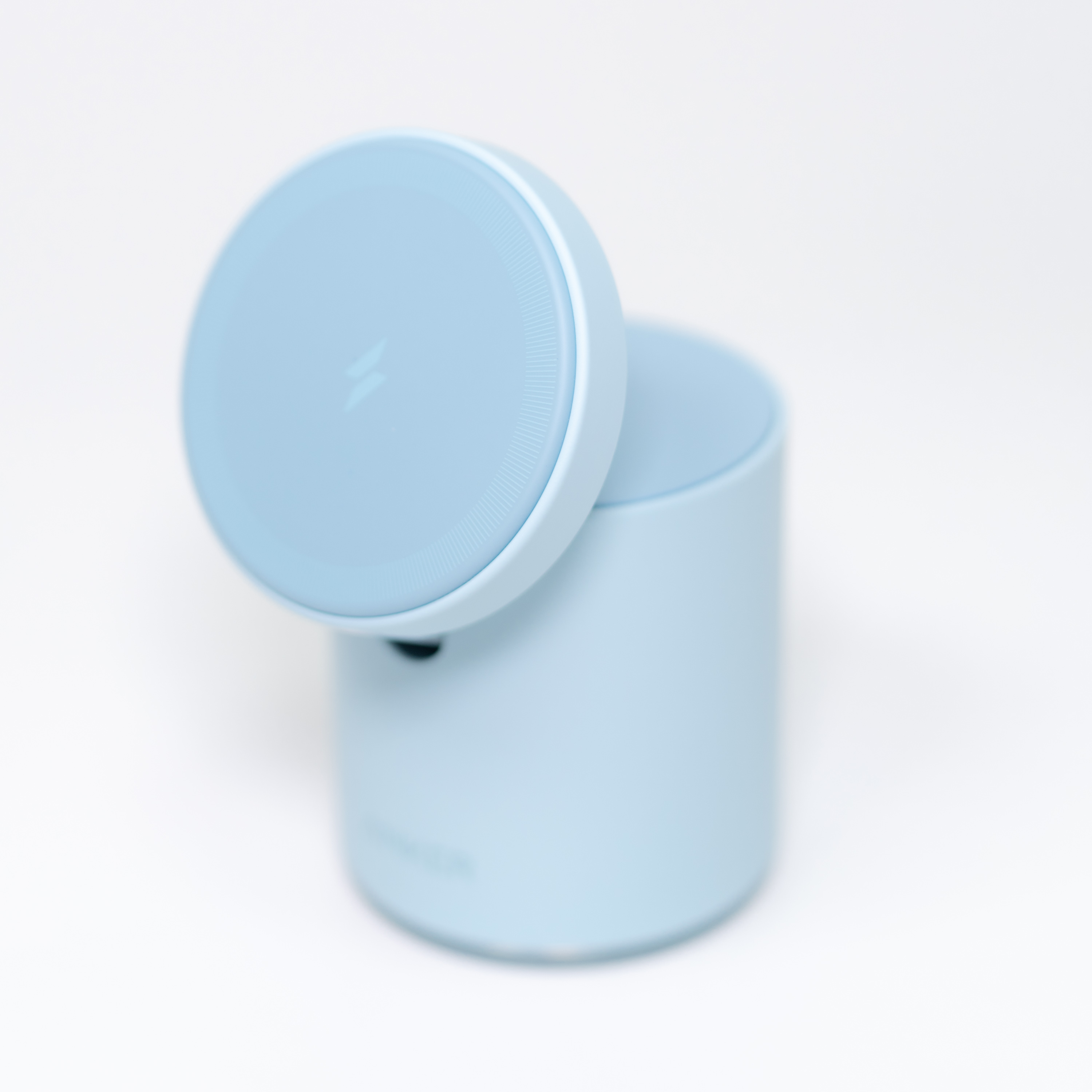 기존 스탠드형 무선 충전기보다 모양이 귀여워서 책상 위에 놓은 모습이 마음에 들었습니다. 필요할 때만 듀얼 충전기로 사용하고 평소에는 앙증맞은 원통형 디자인으로 유지할 수 있는 점도 마음에 들었고요. 충전이 시작되면 켜지는 LED 램프는 기분을 좋게 합니다. MFI 미지원이 아쉽지만 그만큼 가격이 합리적이니 맥세이프 호환 충전기가 필요하신 분들은 고려해 보시는 것도 좋겠습니다.