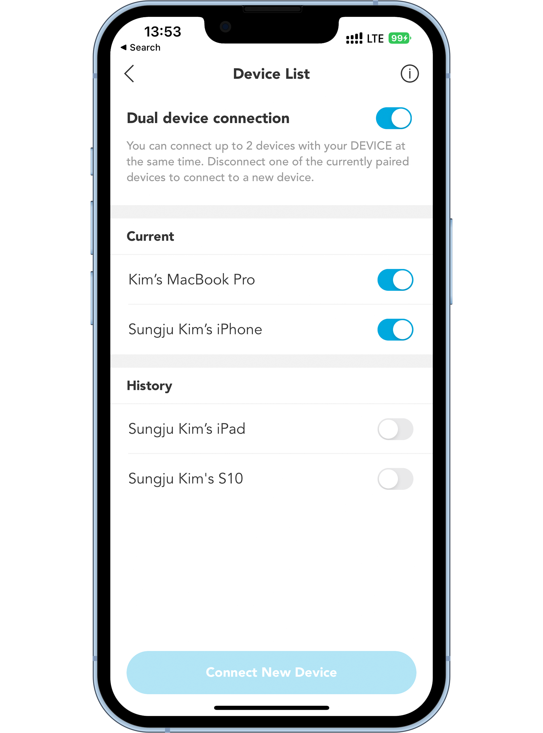 멀티 포인트 기능으로 2대의 기기를 동시 연결할 수 있습니다. 매일 사용하는 QCY의 저가형 이어폰 T13이 멀티 포인트를 지원하지 않아 매번 페어링을 다시 설정해야 하는 번거로움에서 해방된 것이 좋습니다. 동시 연결은 두 대지만 기기 등록은 여러 대가 가능해서 필요에 따라 해제-연결해 사용하고 있습니다. 저는 아이폰,아이패드,맥북 세 장비에 주로 연결하는데 아이폰에 고정, 맥북과 아이패드를 필요에 따라 전환해서 연결합니다.