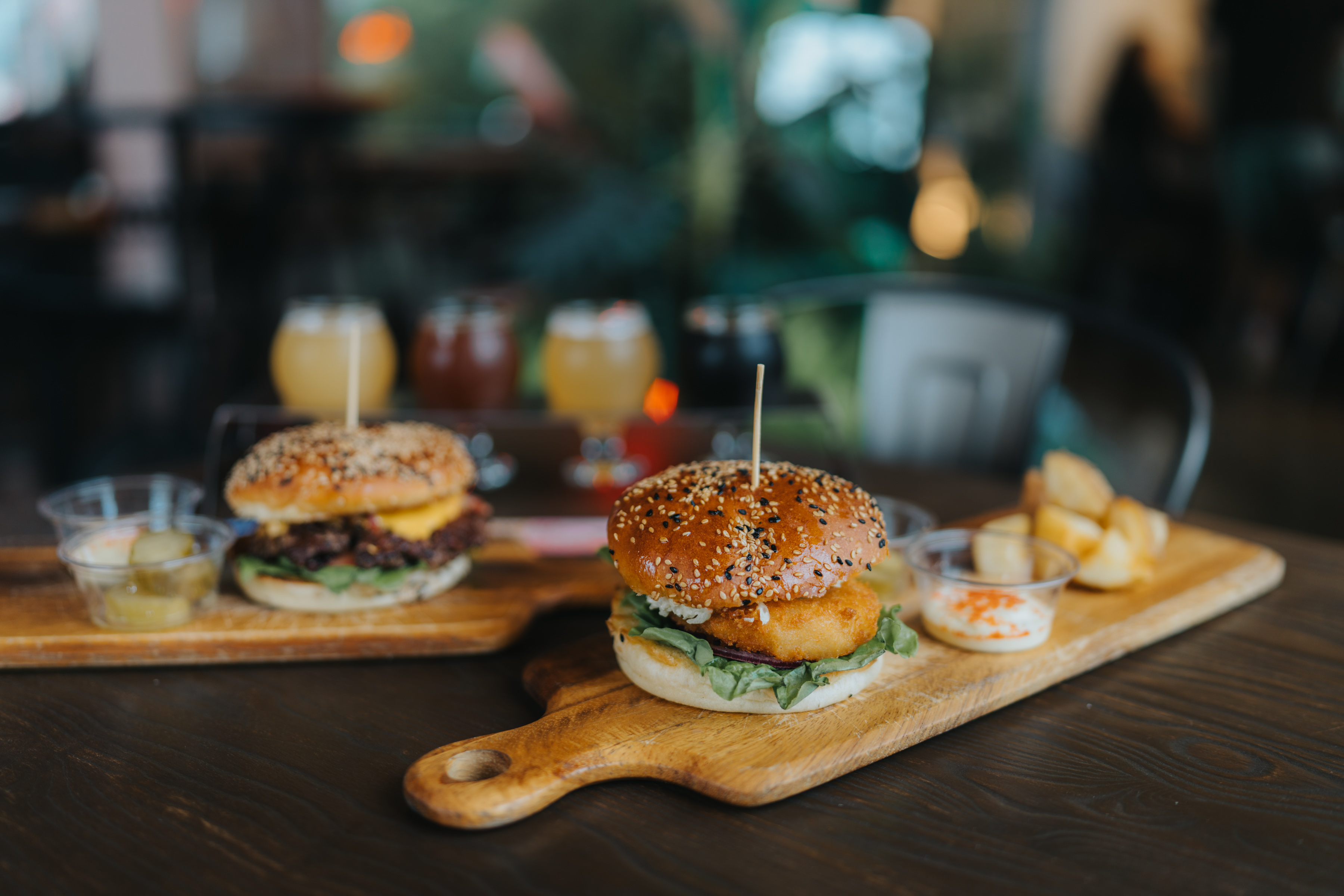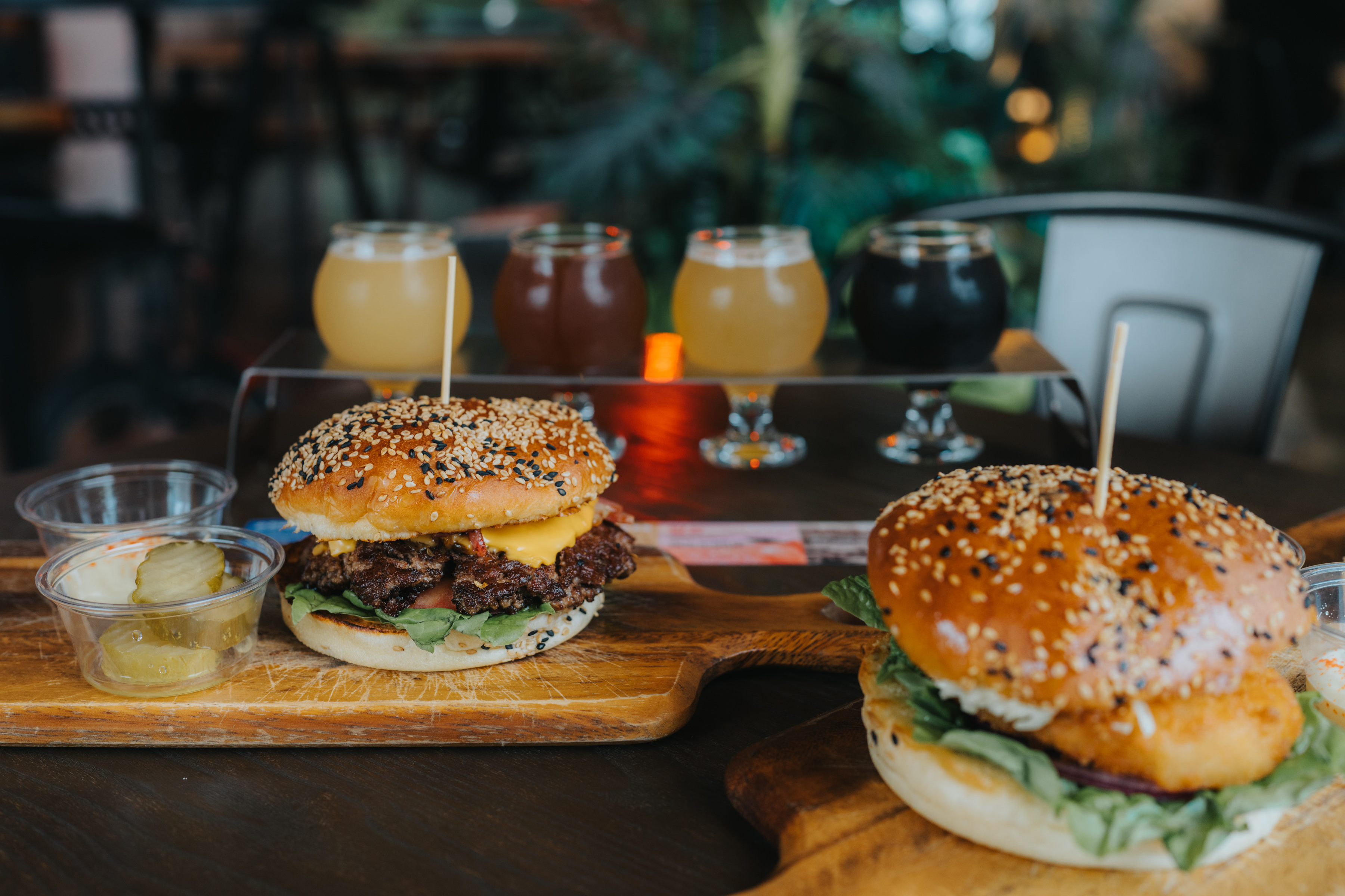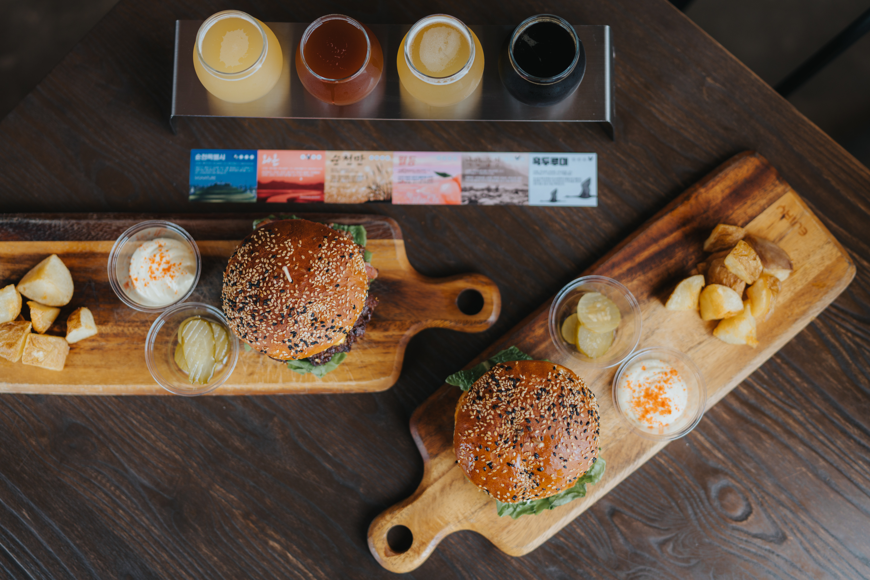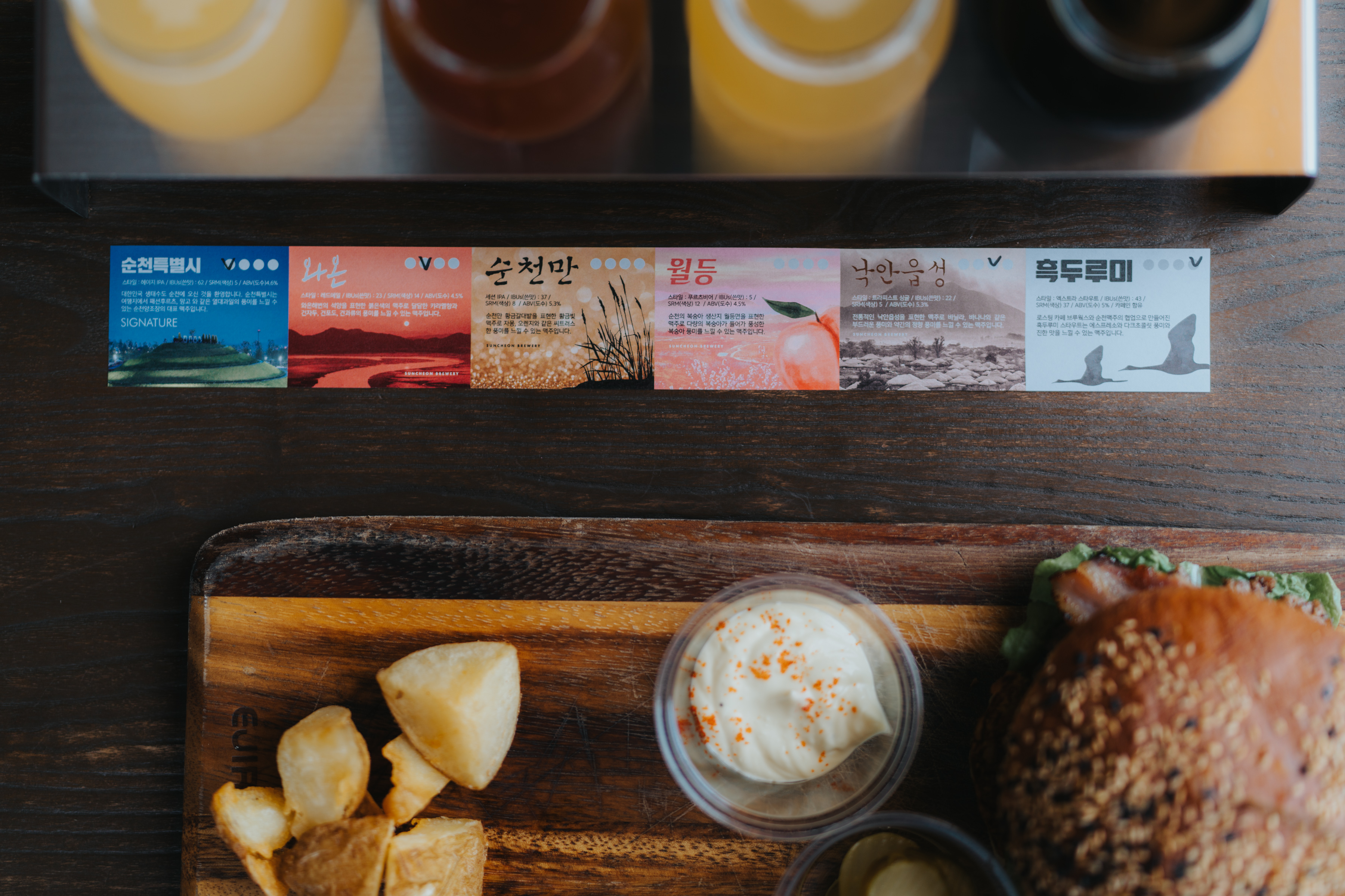 시그니처 버거인 크레인 버거 그리고 쉬림프 버거를 시켰습니다. 맥주 샘플러는 네 가지를 고를 수 있습니다. 주문하면 각 맥주의 특징을 정리한 메뉴얼을 함께 줍니다. 제가 고른 건 순천특별시, 와온, 낙안읍성, 흑두루미.