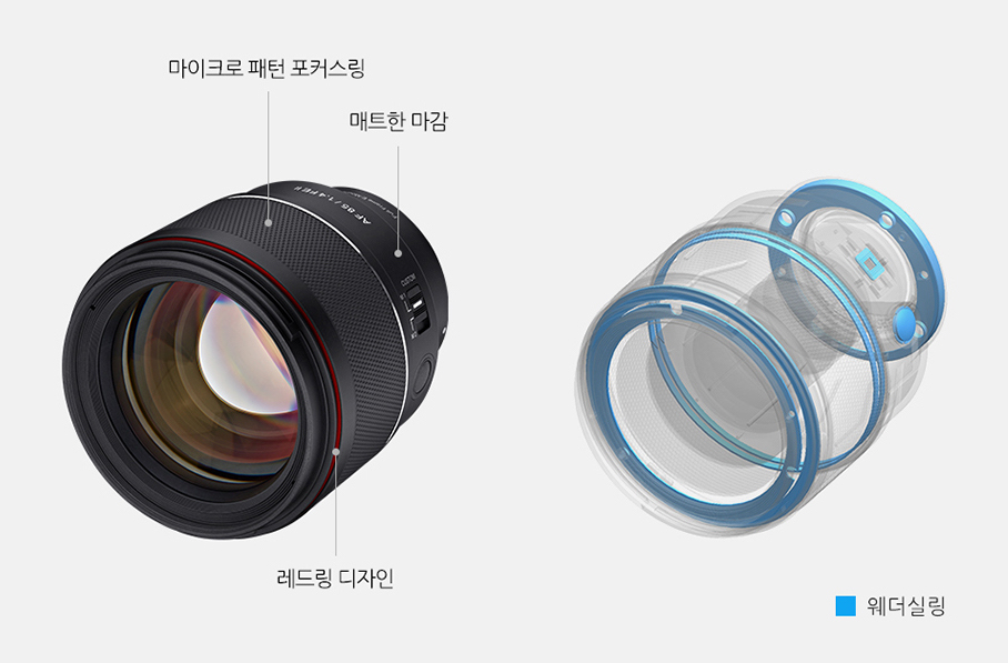 좋은 평을 받지 못했던 빨간색 링을 경통 끝쪽에 배치했습니다. 전면에서는 잘 보이지만 옆면에서는 은은하게 보이는 절묘한 위치인데 그만큼 렌즈 디자인이 깔끔해졌습니다. 많은 분들이 긍정적으로 생각할 것이라 생각합니다. 85mm F1.4 렌즈인만큼 대물렌즈가 굉장히 큽니다.