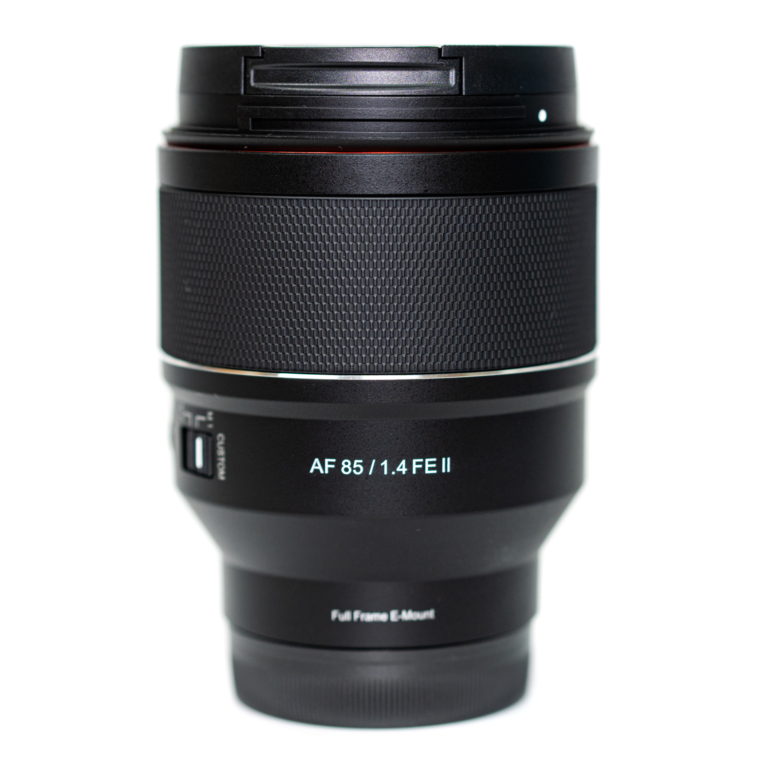 디자인이 크게 바뀌었습니다. 기존 삼양 AF 렌즈들이 경통의 실루엣을 최대한 간결하게 유지했다면 AF 85mm F1.4 FE II를 포함한 AF II 버전 렌즈들은 네이티브 렌즈 디자인에 조금 더 가까워졌습니다. 초점링의 표면 마감도 전작이 곧은 스트라이프 형태였다면 이번 버전은 작은 쌀알이 모여있는 듯한 형태로 바뀌었습니다. 개인적으로는 새 버전이 밀착도와 조작감에서 조금 더 낫다고 생각합니다. 전면에는 렌즈 명이 인쇄돼 있습니다.