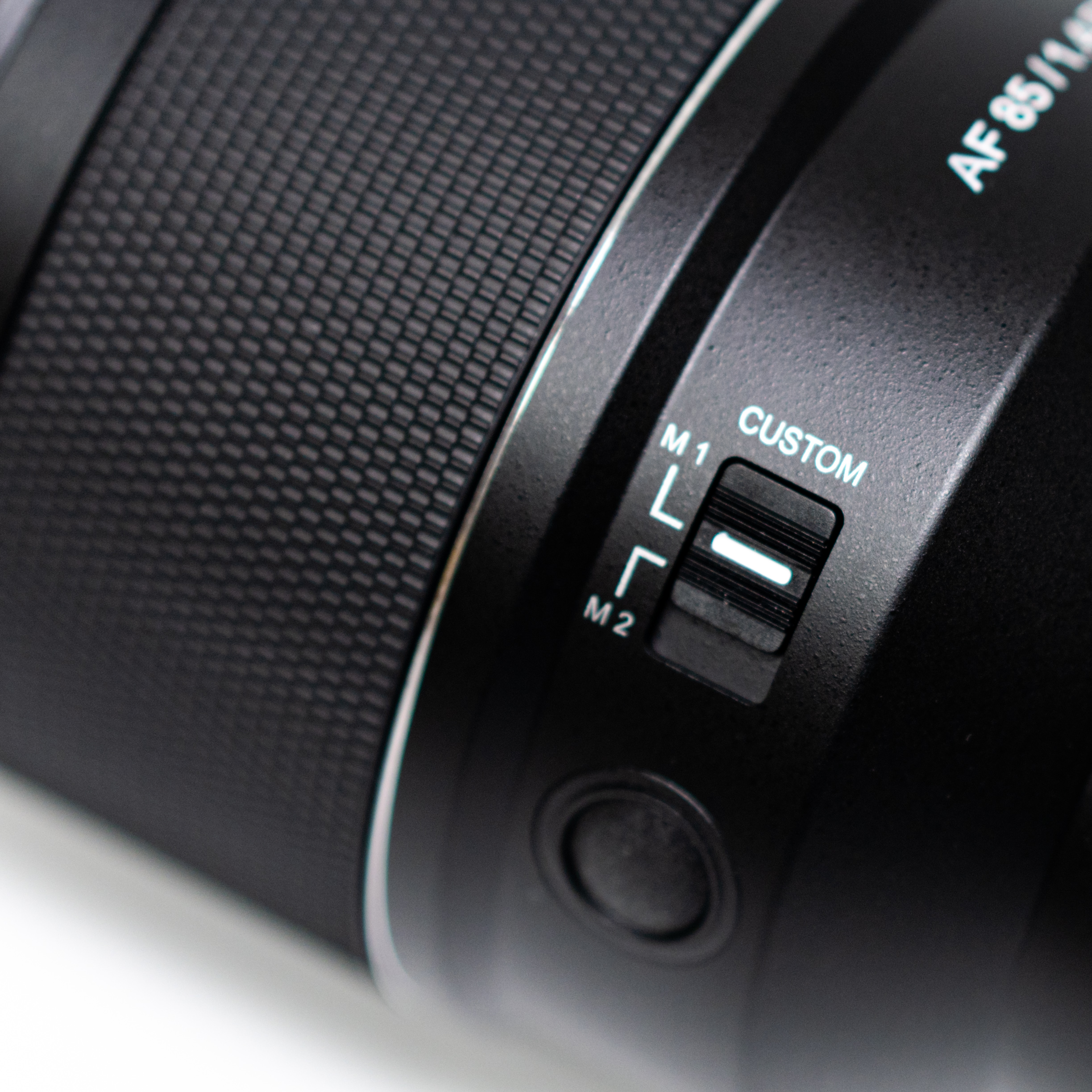 측면에는 조작계가 배치돼 있습니다. 렌즈의 초점링을 두 가지 기능으로 사용할 수 있는 커스텀 스위치 그리고 최신 삼양 렌즈의 중요한 인터페이스인 초점 고정 버튼입니다. 초점 고정 버튼은 예전 AF 24mm F1.8 FE 렌즈를 사용할 때 야경 및 별사진 용으로 좋은 인상을 받았는데 스튜디오 인물/정물 촬영에서도 유용하게 활용될 것으로 생각합니다.