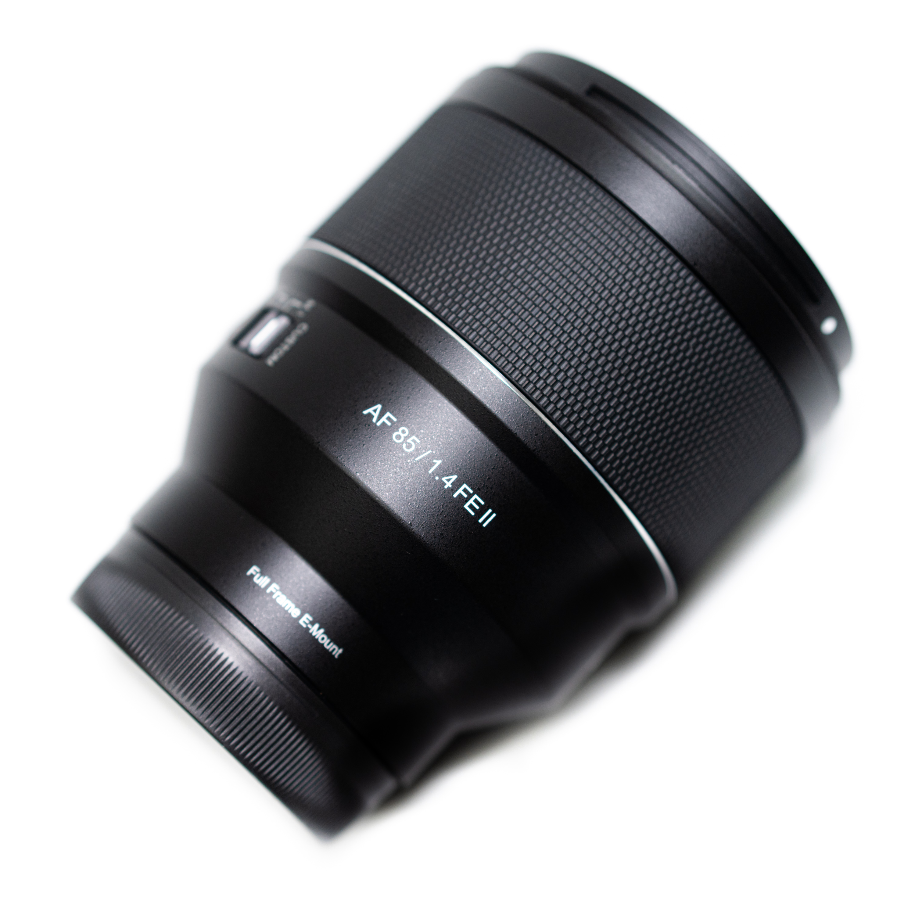 디자인이 크게 바뀌었습니다. 기존 삼양 AF 렌즈들이 경통의 실루엣을 최대한 간결하게 유지했다면 AF 85mm F1.4 FE II를 포함한 AF II 버전 렌즈들은 네이티브 렌즈 디자인에 조금 더 가까워졌습니다. 초점링의 표면 마감도 전작이 곧은 스트라이프 형태였다면 이번 버전은 작은 쌀알이 모여있는 듯한 형태로 바뀌었습니다. 개인적으로는 새 버전이 밀착도와 조작감에서 조금 더 낫다고 생각합니다. 전면에는 렌즈 명이 인쇄돼 있습니다.