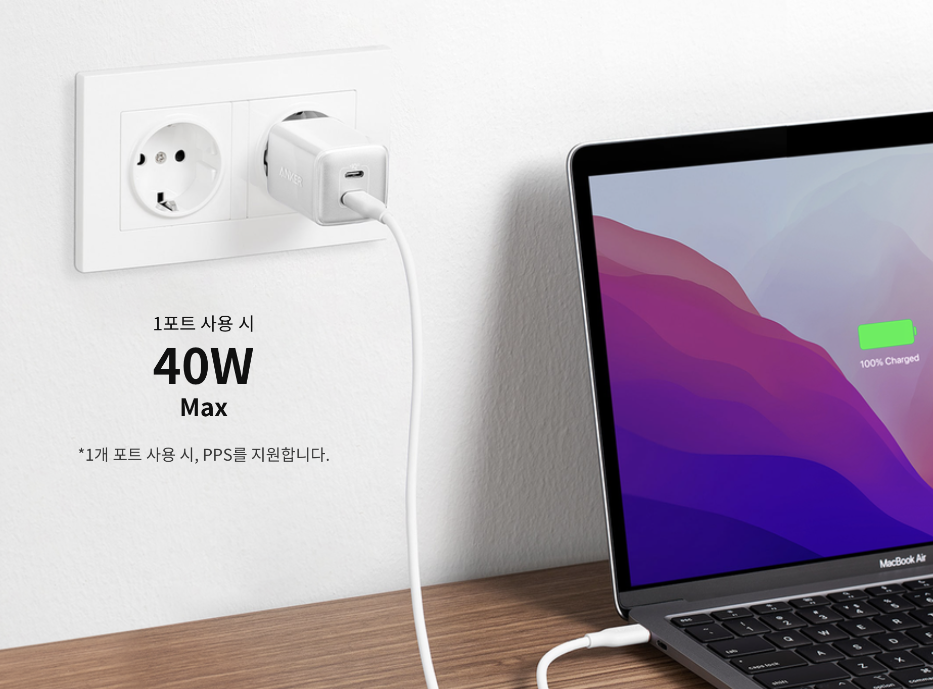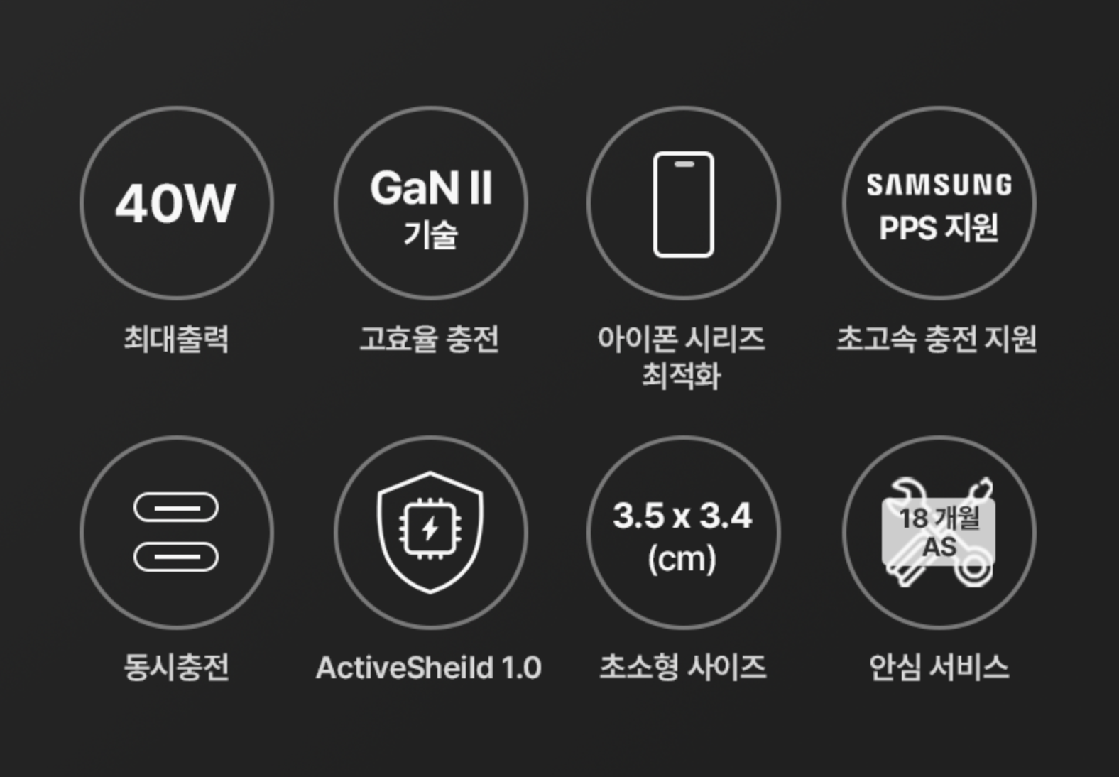 출력이 최대 40W로 높아져 스마트폰뿐 아니라 노트북, 태블릿, 카메라, 닌텐도 스위치 등도 함께 충전할 수 있는 사양입니다. 삼성의 고속 충전 규격인 PPS를 지원하고 기기 내부 온도에 따라 출력을 조정하는 Active Sheild 기술이 적용됐습니다.