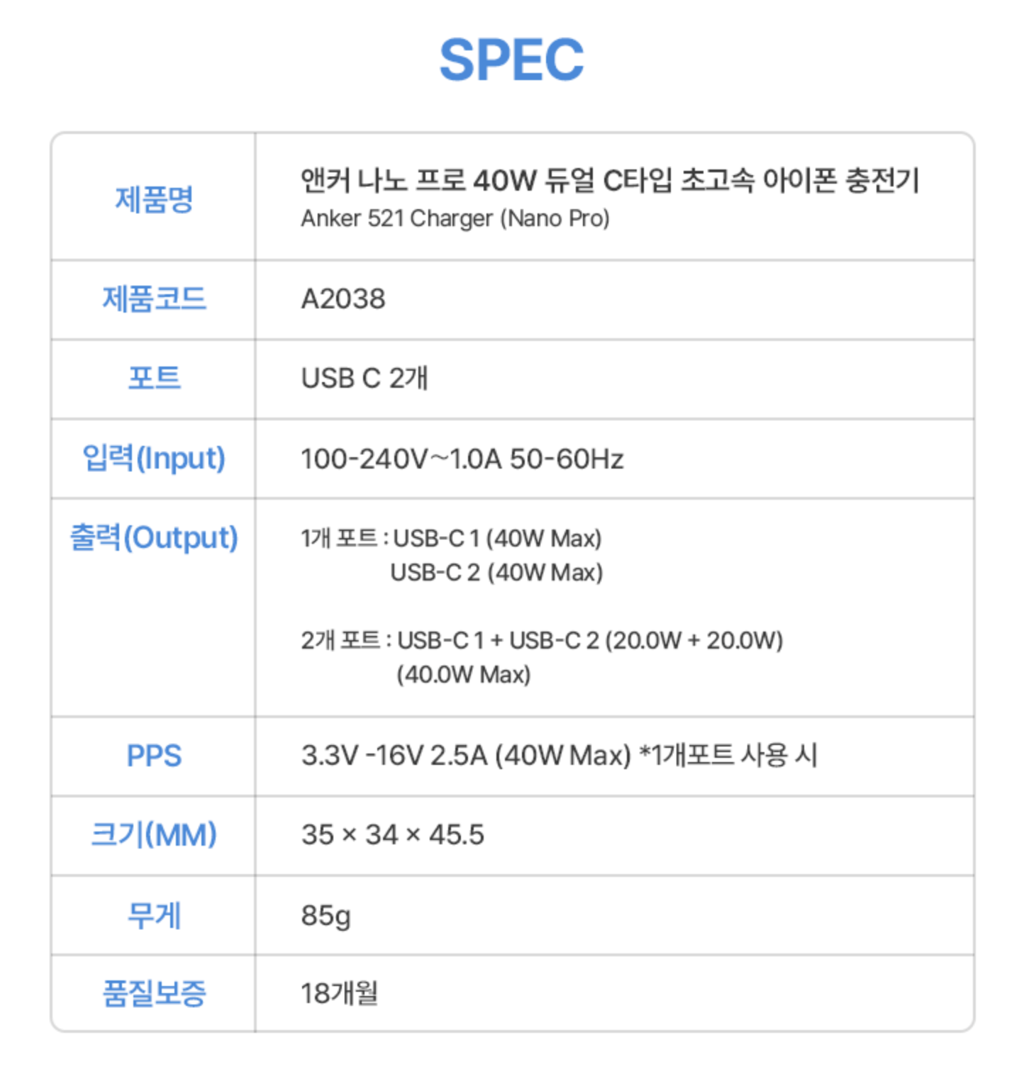 이번에 성능을 두 배로 끌어 올린 신제품 나노 프로 40W 2포트가 출시됐습니다. 기존 나노 20W 대비 포트가 두 개로 늘었고 최대 출력이 40W로 두 배 충전했습니다. 크기가 기존 나노 대비 약간 커졌지만 여전히 사양 대비 매우 작습니다. 무엇보다 앤커 나노 20W 두 개를 사용하는 효과를 볼 수 있다는 것이 반갑습니다. 아래는 제품 사양입니다.