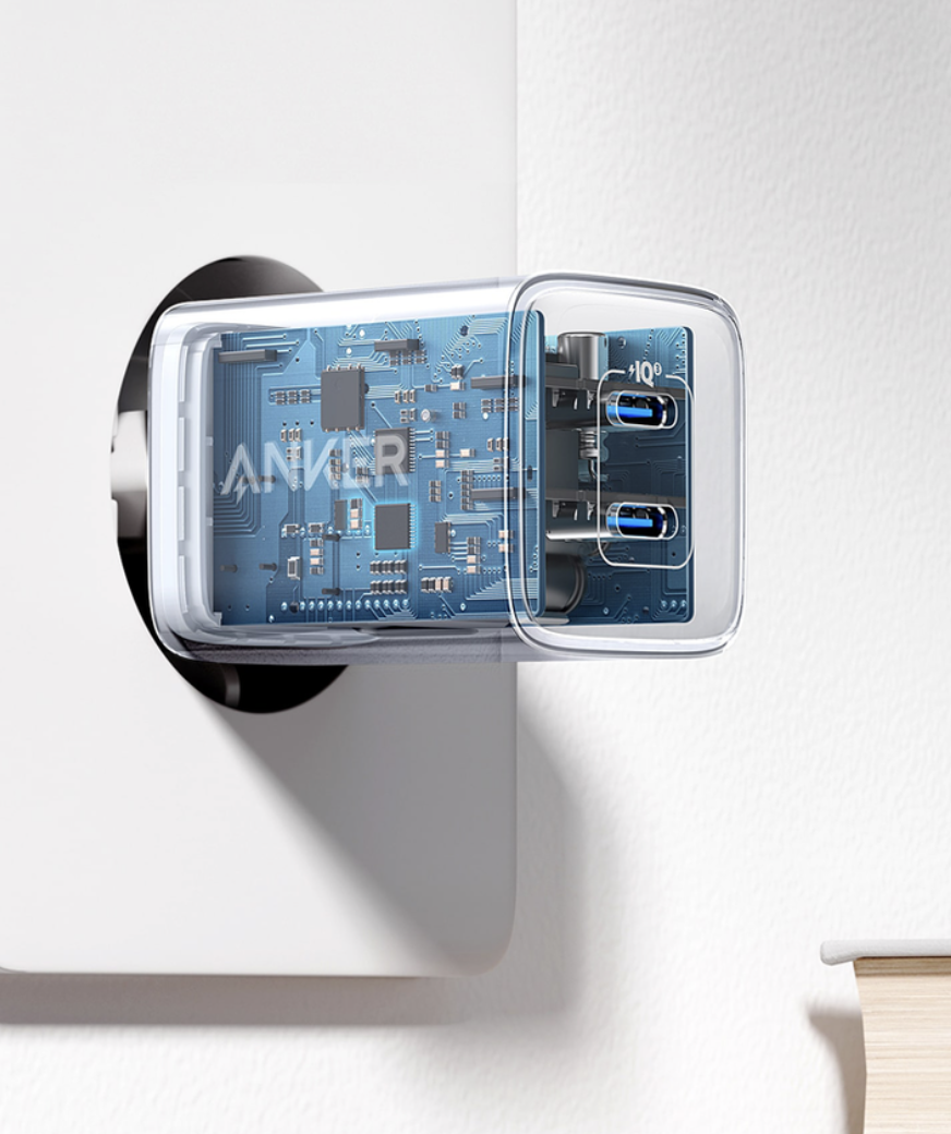 기존 나노 모델이 가벼운 무게를 위해 소재와 만듦새 등을 타협했다면 나노 프로 충전기는 소재와 마감이 눈에 띄게 좋아졌습니다. 증가한 무게도 묵직하고 단단하게 느껴지고요. 흰색 플라스틱 위에 반투명한 케이스가 덧씌워진 형태고 측면에 브랜드 로고가 각인돼 있습니다. 두 개의 USB-C 포트가 있는 부분은 매트한 은색으로 마감했습니다. 본체가 작다보니 220V 플러그가 도드라지는 편입니다. 110V 모델보다 휴대성에 손해를 보는 것이 못내 아쉽습니다.