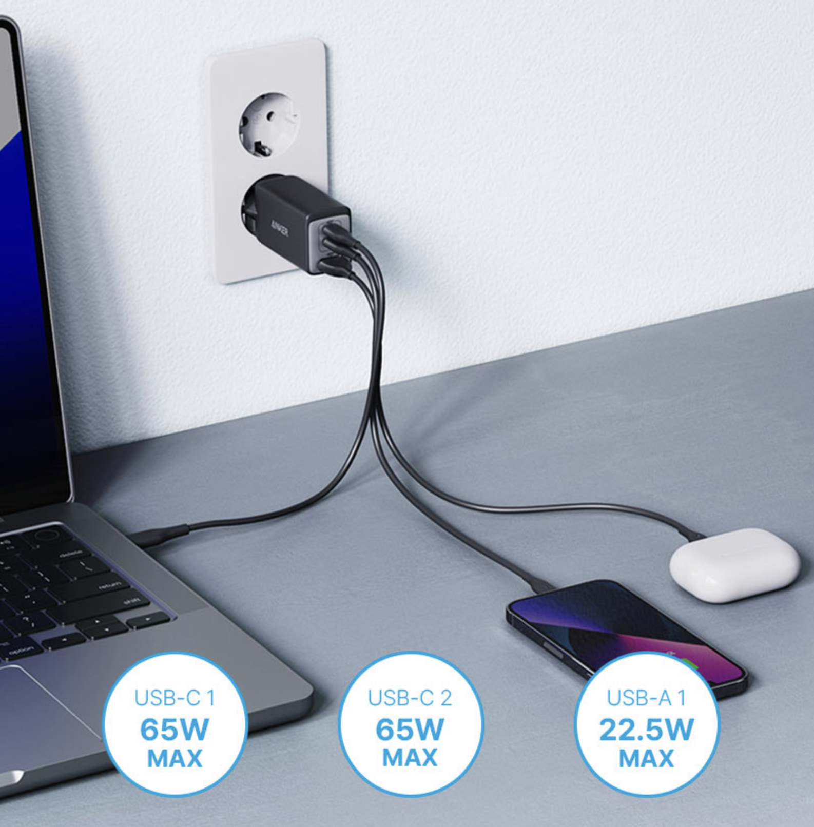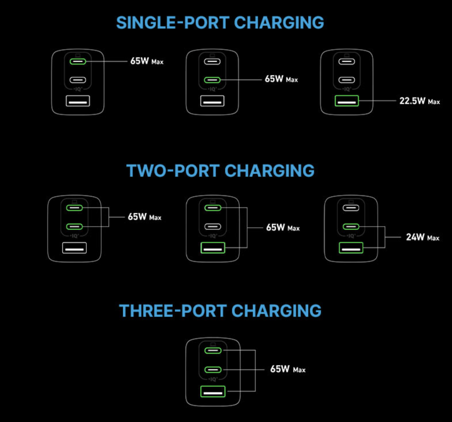 65W(USB-C 단독) / 45W+20W(USB-C1,C2) / 40W+22.5W(USB-C1,USB-A 동시) / 12W+12W(USB-C2, USB-A 동시), 40W+12W+12W(3포트 동시) 출력