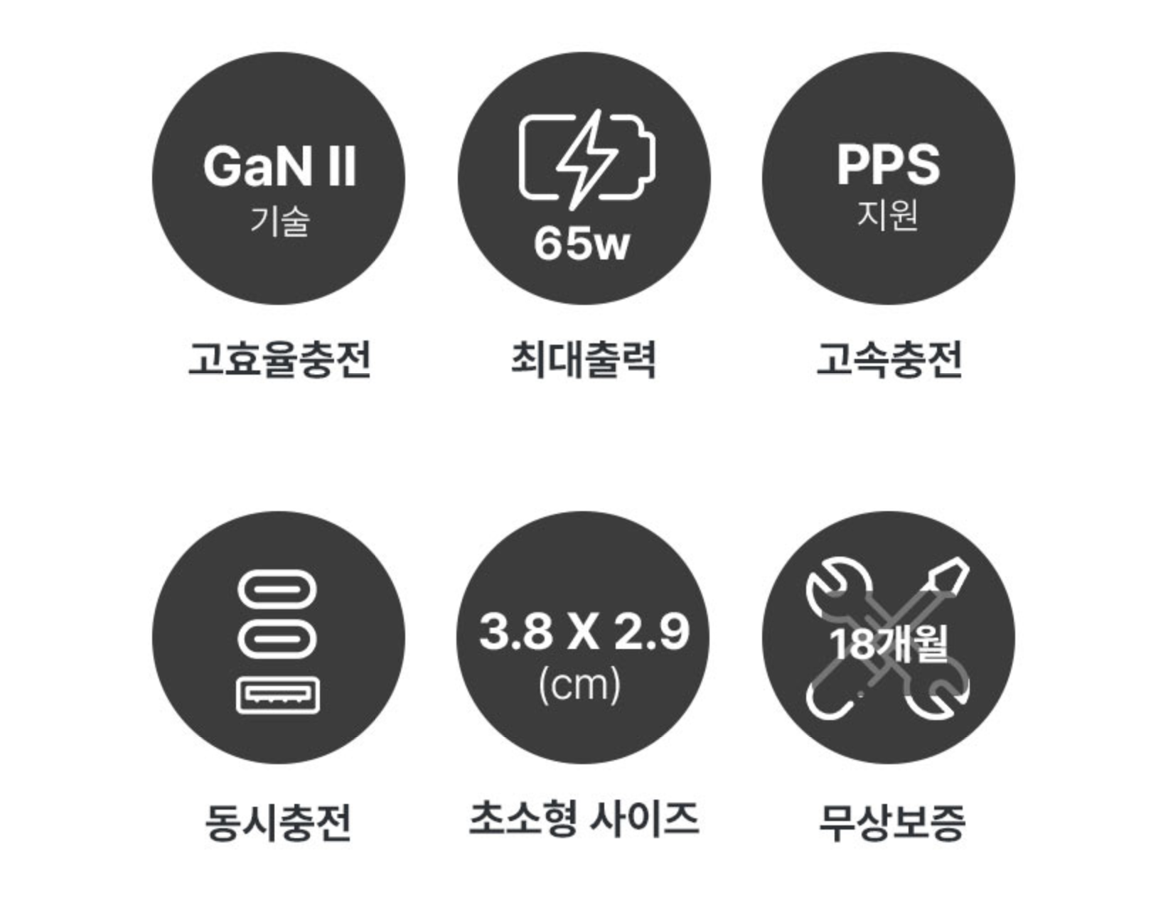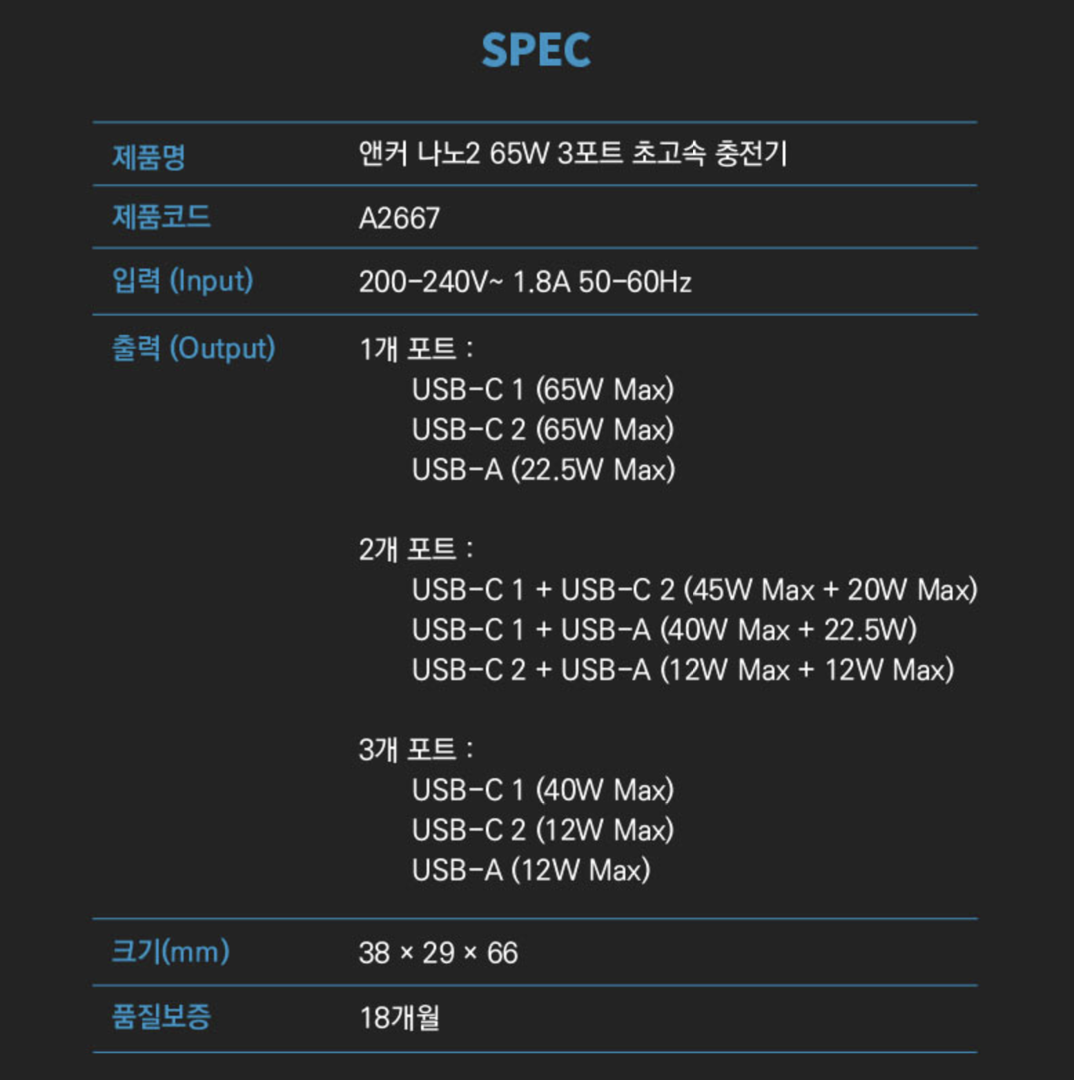 하지만 노트북, 미러리스 카메라를 함께 챙겨야 할 때는 20W 출력이 부족합니다. 포트 하나로 번갈아 충전하는 것도 여간 번거로운 게 아니죠. 이 때 필요한 것이 높은 출력, 멀티 포트를 지원하는 충전기. 몇 년 전 구매한 3포트 모델이 있지만 GaN 기술 이전이라 크기/무게에 대한 아쉬움이 있었습니다. 그러던 중에 앤커 나노 시리즈의 3포트 충전기를 사용하게 됐습니다. 제품명은 나노2 65W 3포트. 제품 사양은 아래와 같습니다.