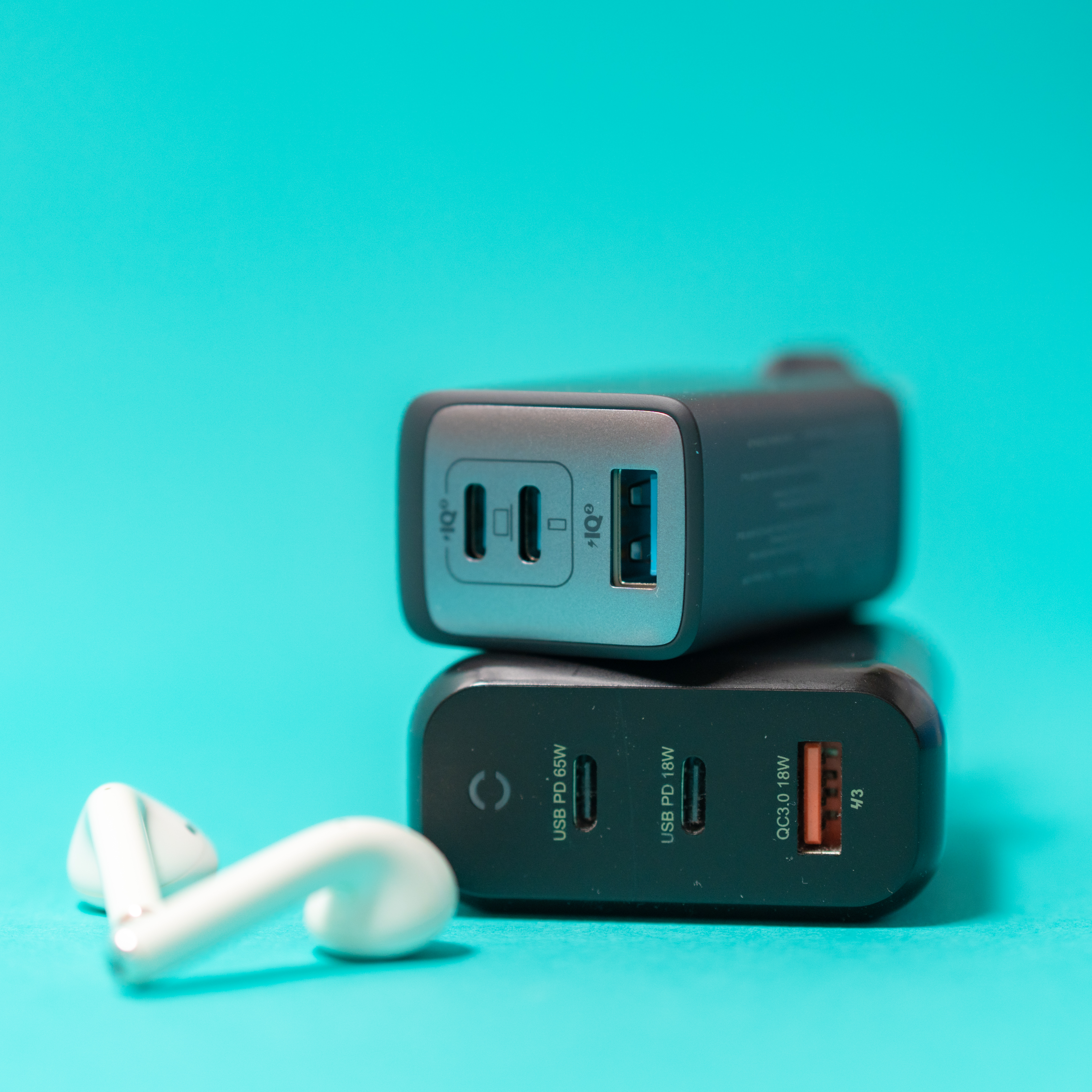 기존에 사용하던 65W 3포트 충전기와의 비교. 부피 차이가 체감상 두 배 가까이 납니다. 장기간 출장/여행에서 이 작은 차이도 크게 느껴질 수 있겠죠.