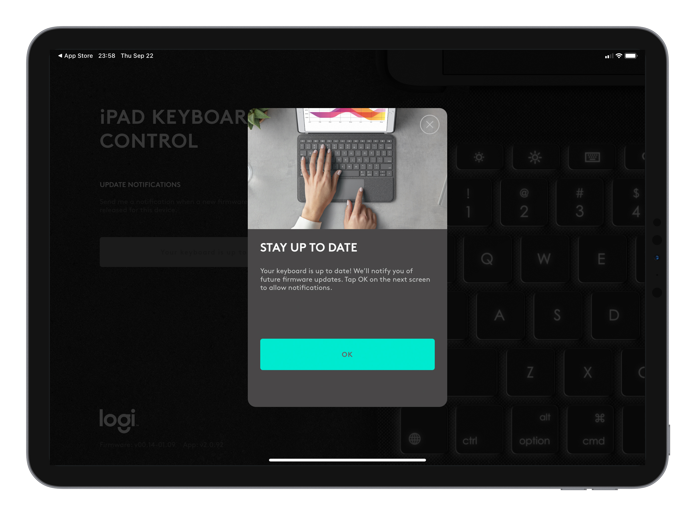 둘을 연결하면 전용 앱을 설치하라는 팝업이 뜹니다. 앱스토어에서 해당 앱을 설치하면 완료. 앱의 역할은 두 장치의 연결 그리고 펌웨어 확인/업데이트 정도가 전부인 것으로 보입니다. 커스텀 버튼, 매크로 설정 그런 거 당연히 없습니다. 개인적으로 esc 버튼 할당 정도는 있어도 좋겠는데 아쉽습니다.