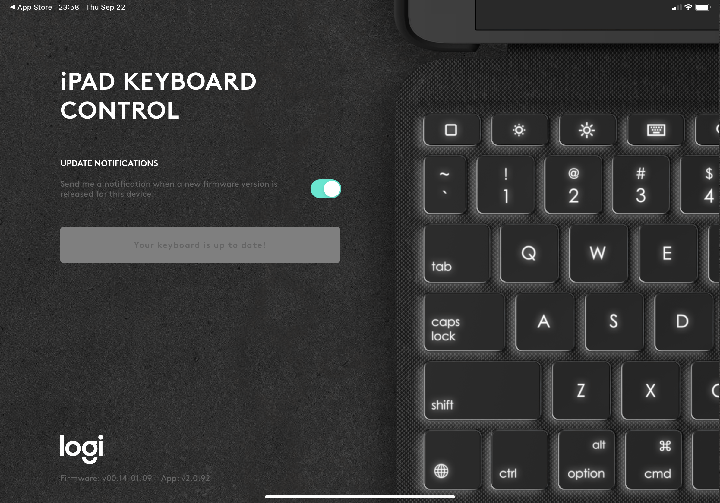 둘을 연결하면 전용 앱을 설치하라는 팝업이 뜹니다. 앱스토어에서 해당 앱을 설치하면 완료. 앱의 역할은 두 장치의 연결 그리고 펌웨어 확인/업데이트 정도가 전부인 것으로 보입니다. 커스텀 버튼, 매크로 설정 그런 거 당연히 없습니다. 개인적으로 esc 버튼 할당 정도는 있어도 좋겠는데 아쉽습니다.