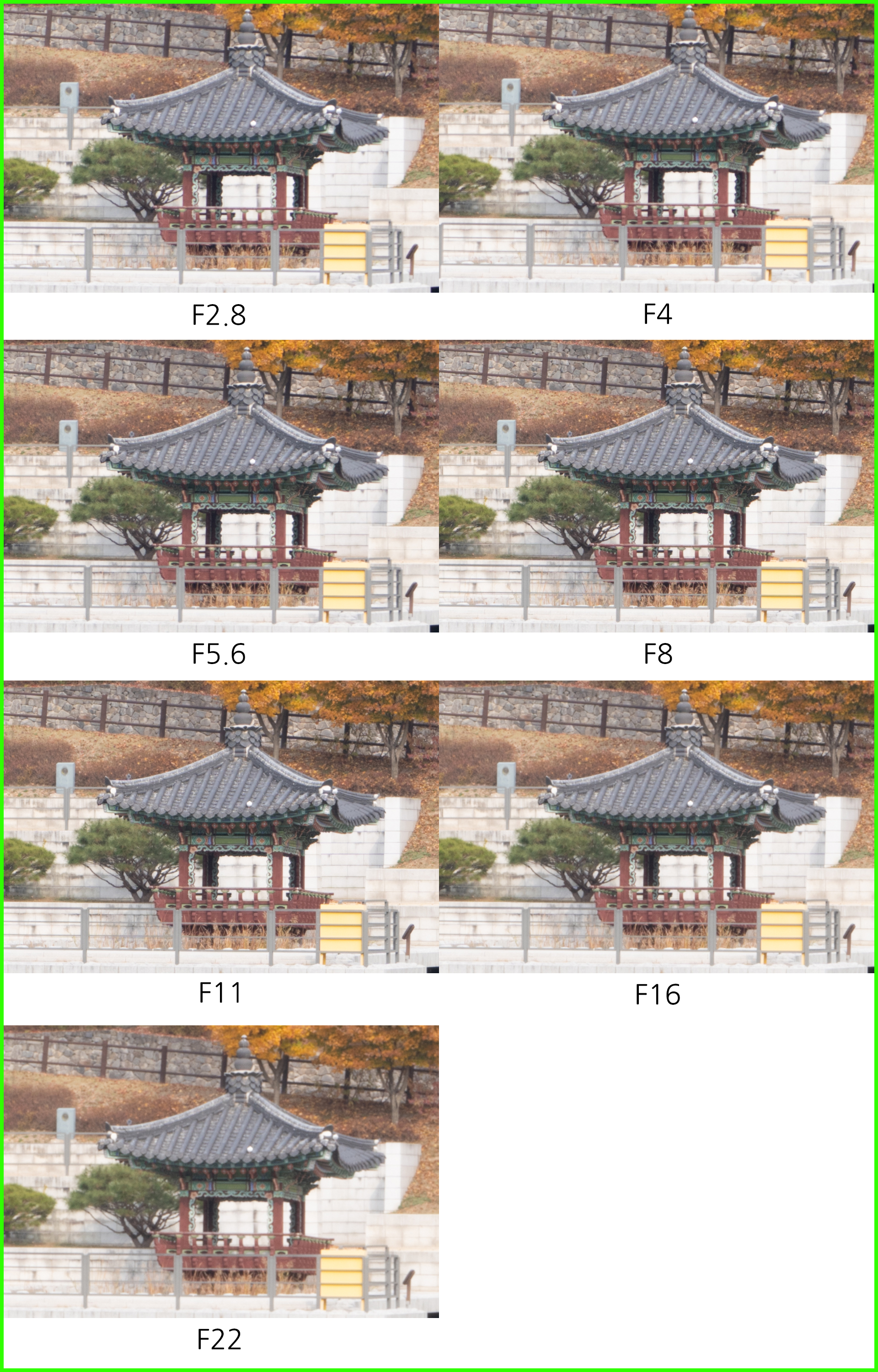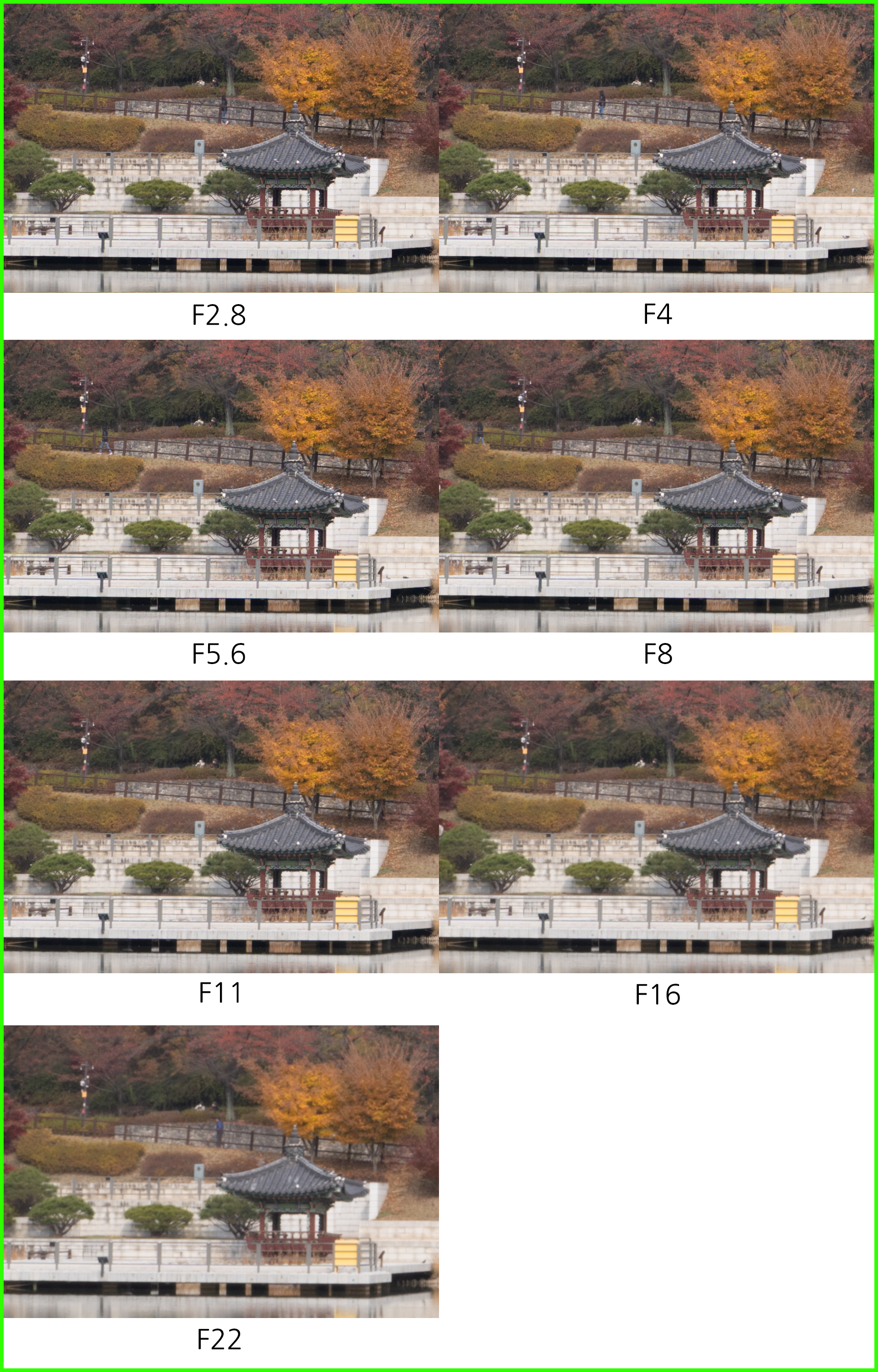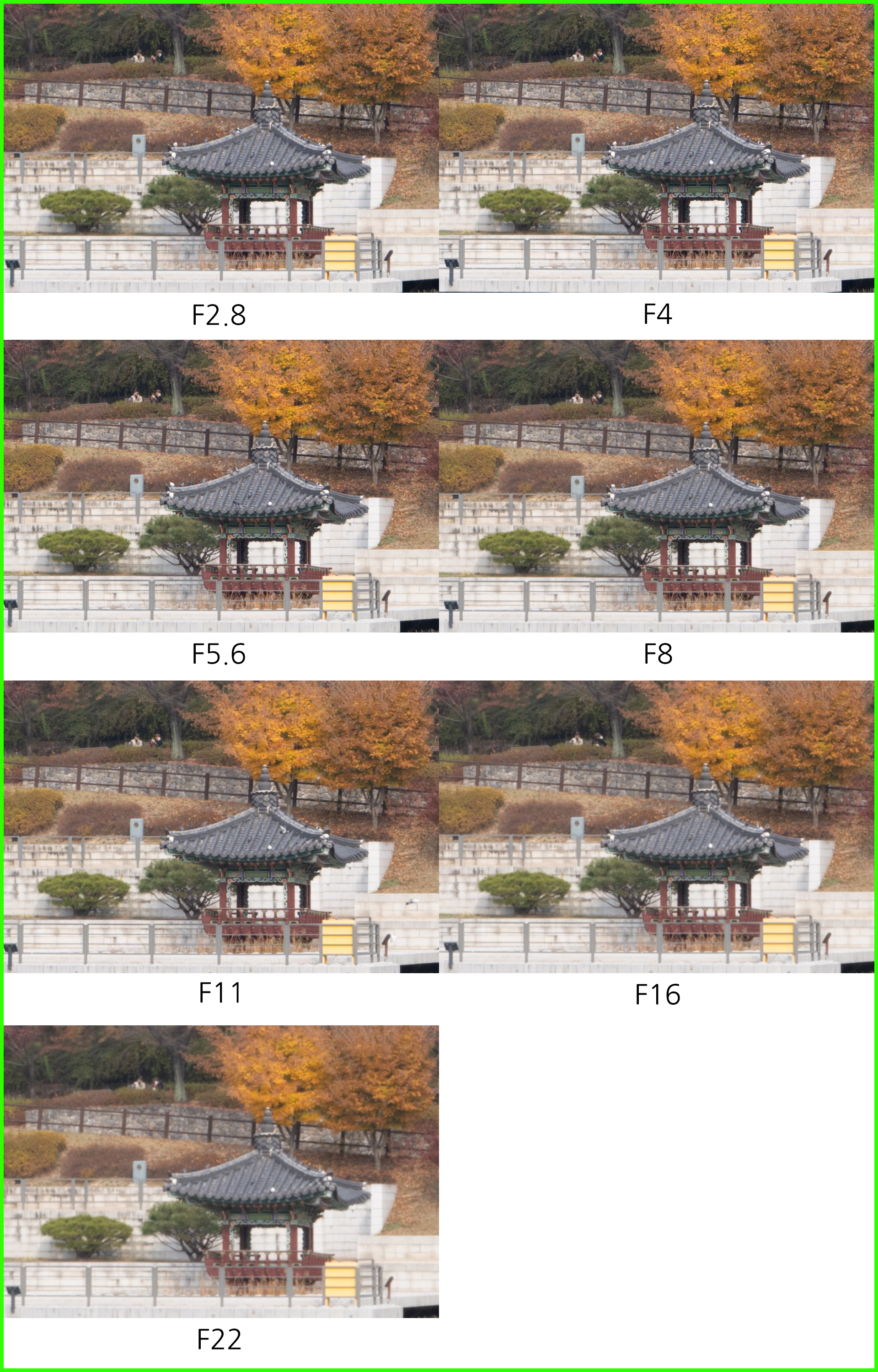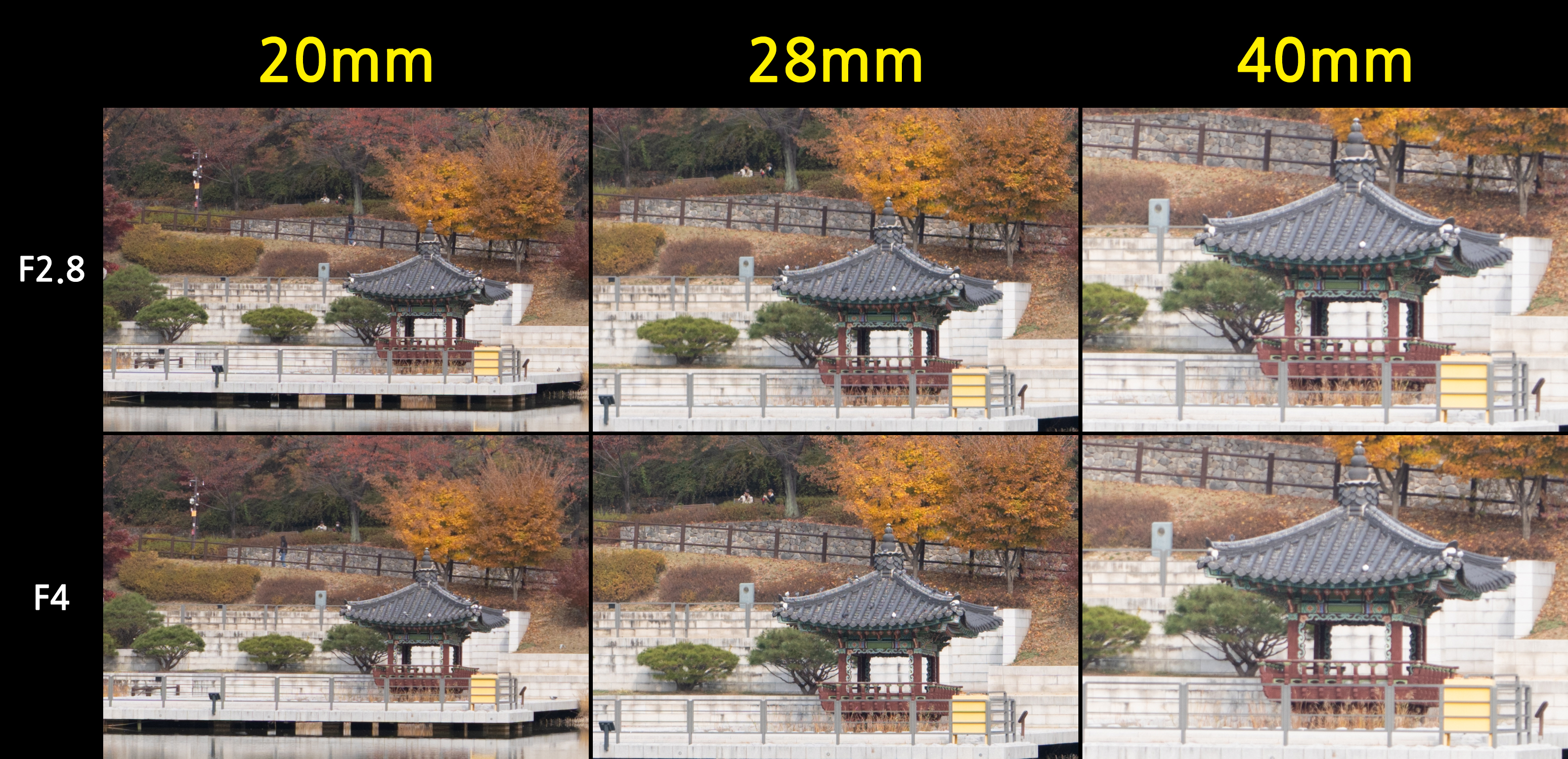 최대 광각 20mm에서는 제가 사용 중인 FE 20mm F1.8 G 단렌즈와 비교해 한 스톱이 조금 넘게 어둡습니다. 초광각에서는 이 차이가 생각보다 크지 않게 느껴질 수 있습니다. 표준-망원 대비 얕은 심도 연출에 제약이 있고, 야외 풍경 촬영에서는 높은 조리개 값을 주로 설정하기 때문에. 하지만 17cm 근접, F2.8 최대 개방 조리개 값을 조합하면 초광각 특유의 원근감과 얕은 심도가 공존하는 결과물을 얻을 수 있습니다. 40mm 에서는 대구경 표준줌 렌즈에 준하는 얕은 심도 연출, 피사체 부각이 가능하고요. 아래는 조리개 값에 따른 심도의 차이를 비교한 것입니다.