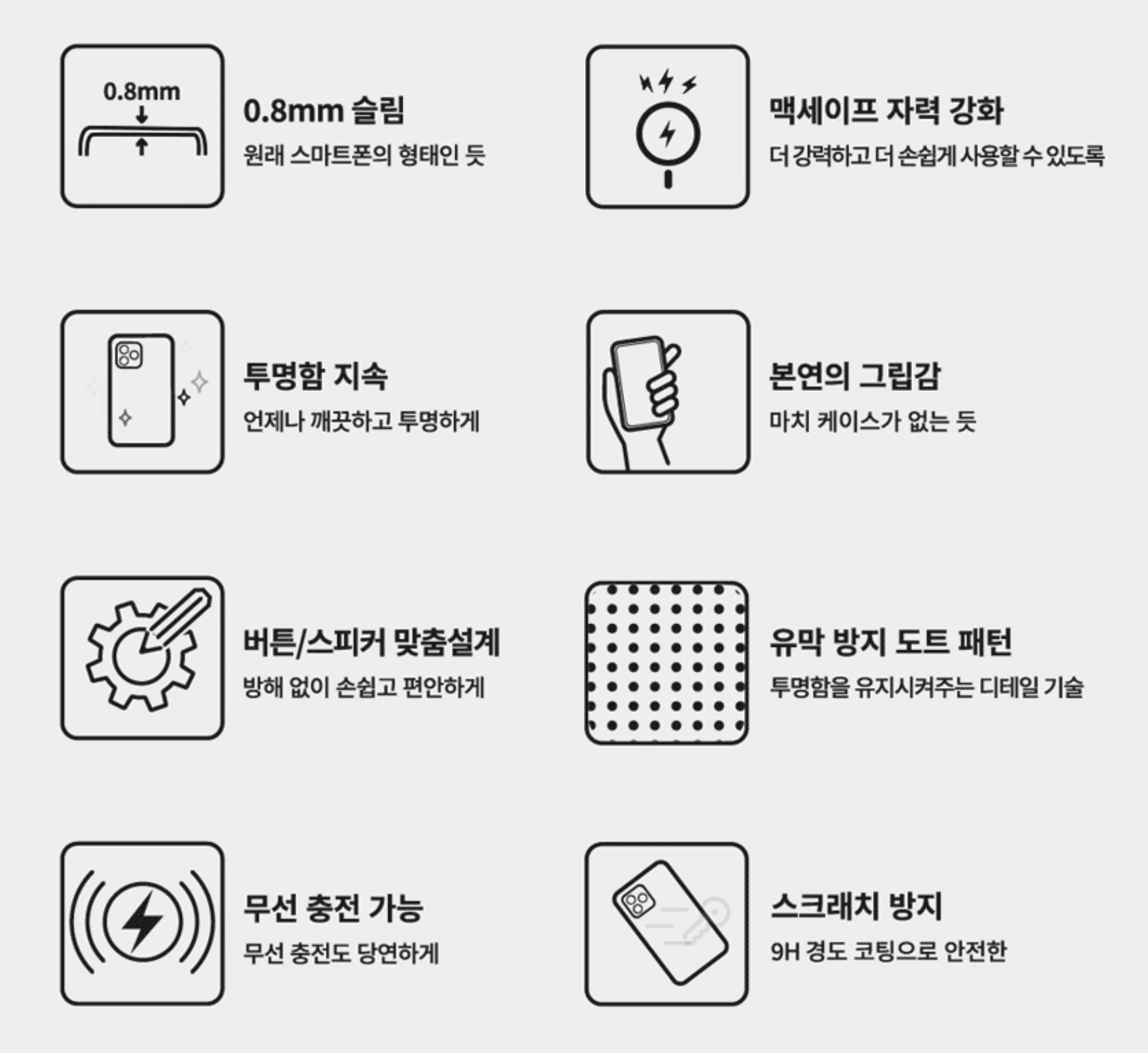 맥세이프를 지원하는 아이폰 12 이상 기종에 사용할 수 있습니다. 아이폰 14 시리즈에 맞춰 출시됐지만 구기종인 아이폰 12,13 시리즈까지 함께 출시했습니다. 제가 사용하는 아이폰 13 프로에서도 사용할 수 있는 점이 좋습니다. 0.8mm로 케이스 두께가 매우 얇아 본체 디자인을 해치지 않고 스크래치/유막 방지 코팅이 적용돼 오래 사용할 수 있습니다. 맥세이프와 호환되는 자석이 있어 다양한 액세서리를 사용할 수 있습니다.
