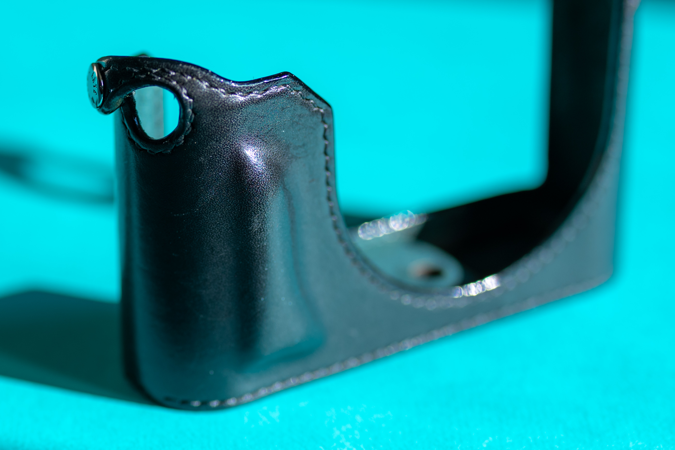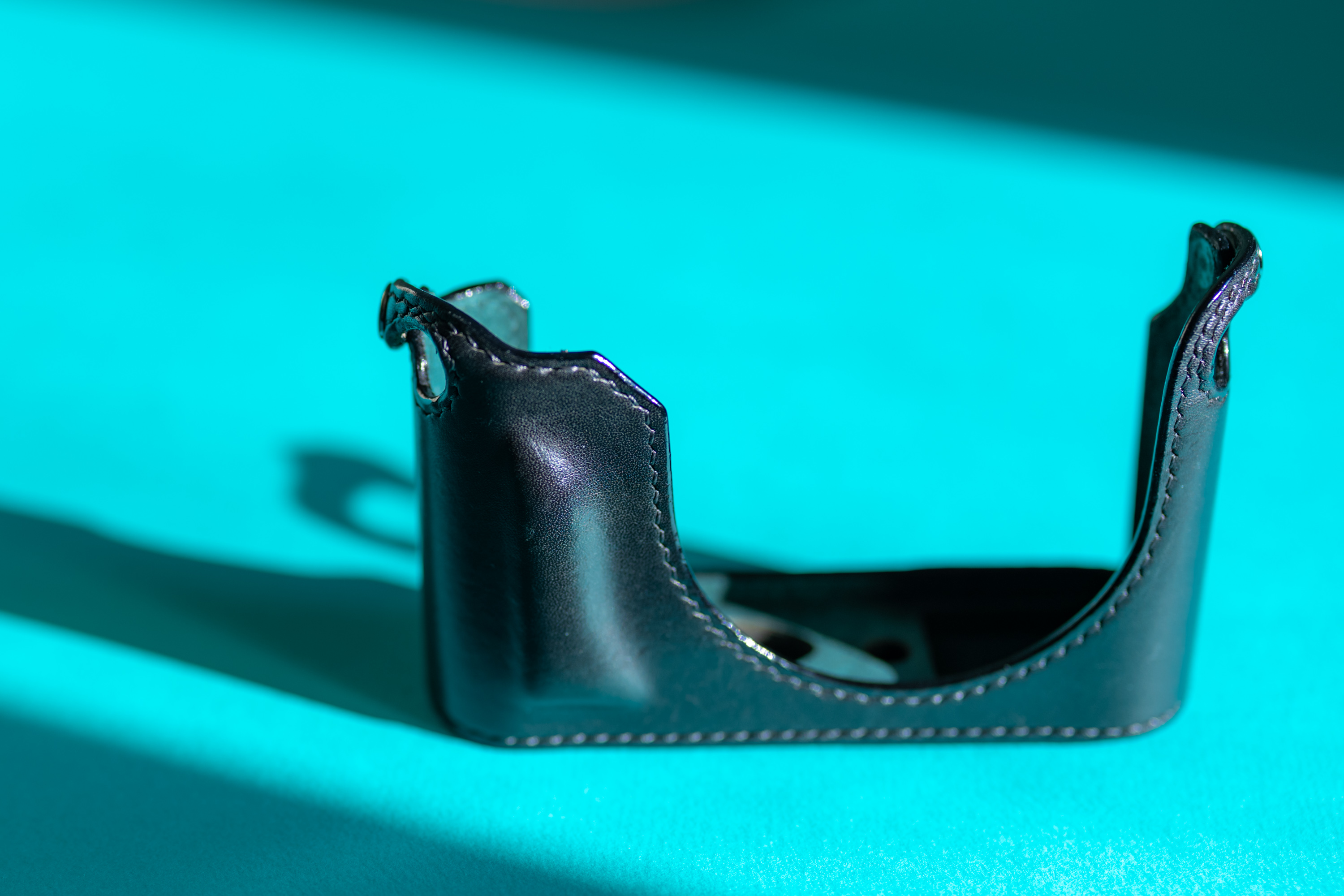 사용된 가죽은 정확한 정보는 알 수 없지만 아마 추가금 없이 제작되는 기본 옵션 중 하나, 무난한 민짜 가죽인 것을 보아 부테로 가죽이 아닐까 싶습니다. 촉촉하고 매끄러운 감촉이 천연 가죽의 장점을 충분히 느끼게 해 줍니다. 가죽의 두께도 적당하고 무엇보다 무게가 가벼워 카메라에 체결했을 때 부담이 없습니다.