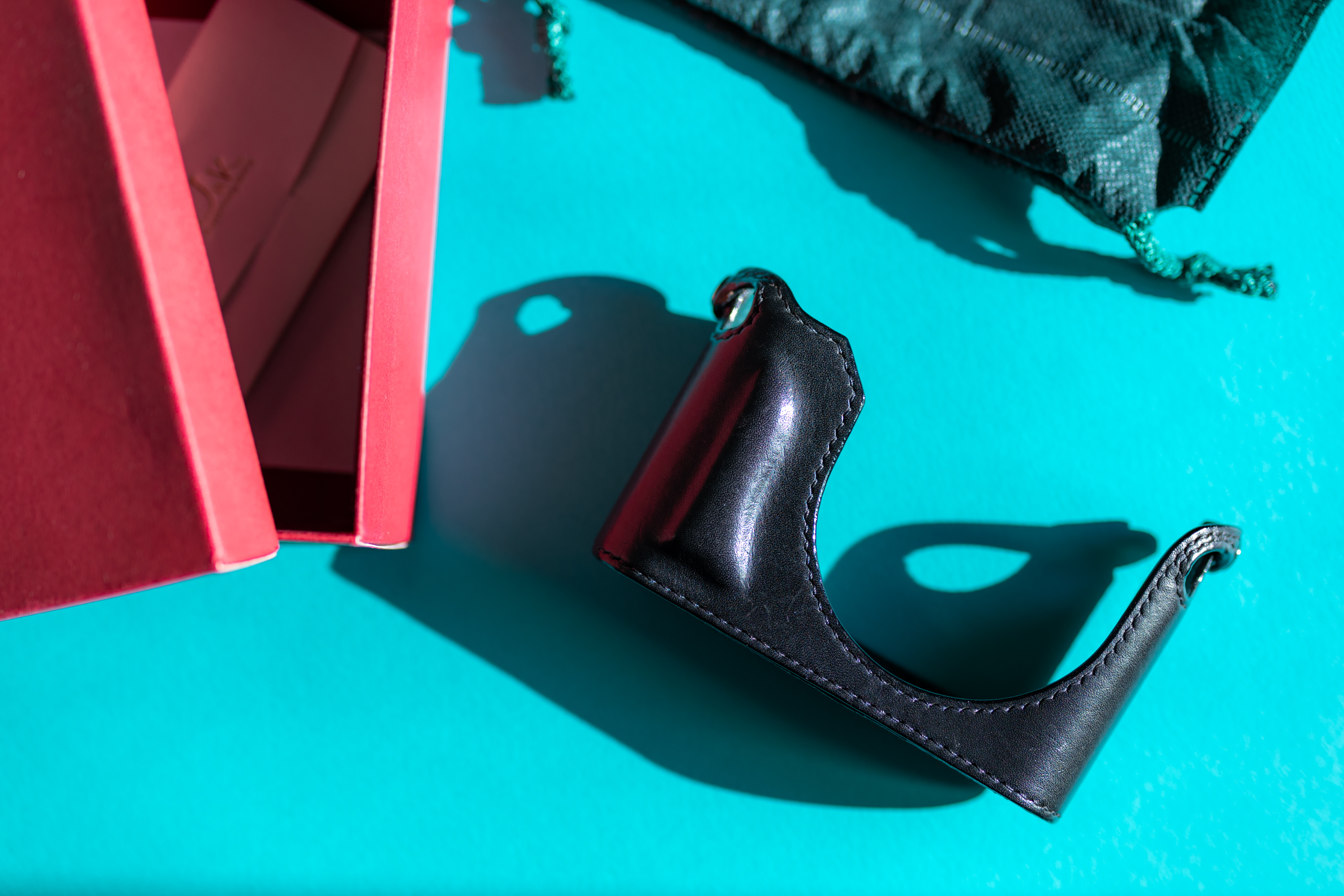 중고 제품이지만 박스와 내부 포장까지 갖춰져 있었습니다. 색상은 블랙이며 기본 그립과 배터리/SD 카드 도어 옵션이 포함돼 있었습니다. arte di mano 제품답게 내피는 녹색으로 되어 있습니다. 라이카 M Type 240을 사용할 때 Jnk 케이스를 사용했었는데 그 제품 역시 내피 색상이 녹색이었습니다.