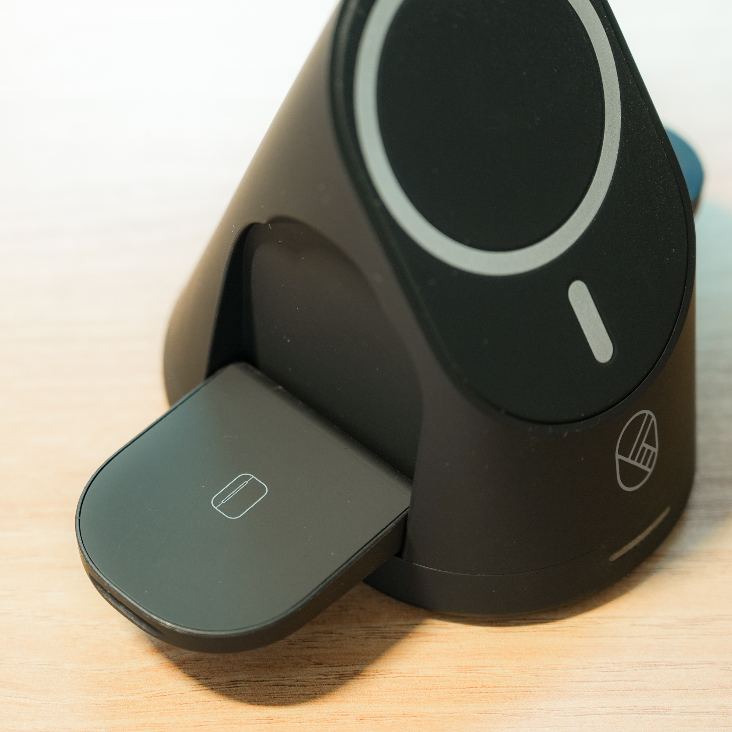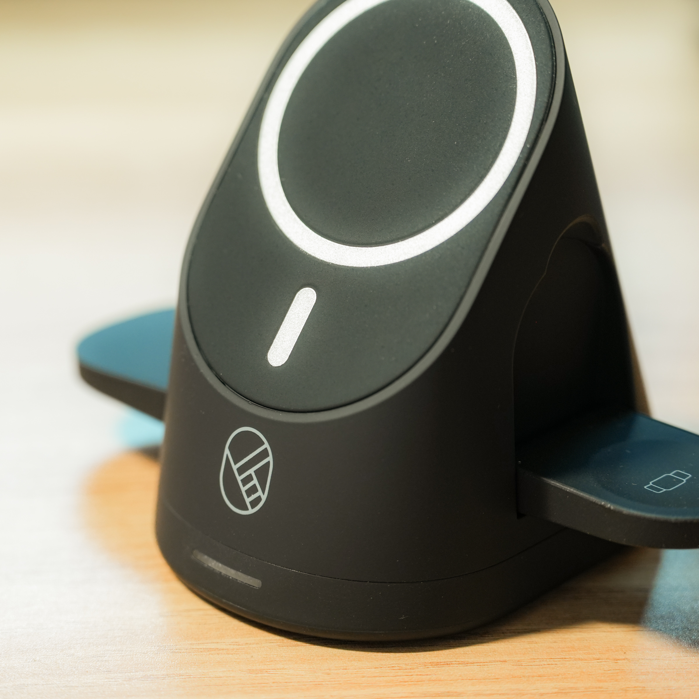 가장 큰 특징은 에어팟, 애플워치 충전부를 접어서 수납하는 폴더블 방식이라는 것입니다. 이런 구조로 인해 전체 부피를 크게 줄였습니다. 제조사 발표 기준 7x11x9cm로 여행용 멀티 충전기로도 무리가 없어 보입니다. USB C 케이블 하나로 세 개의 디바이스를 충전할 수 있으니까요.