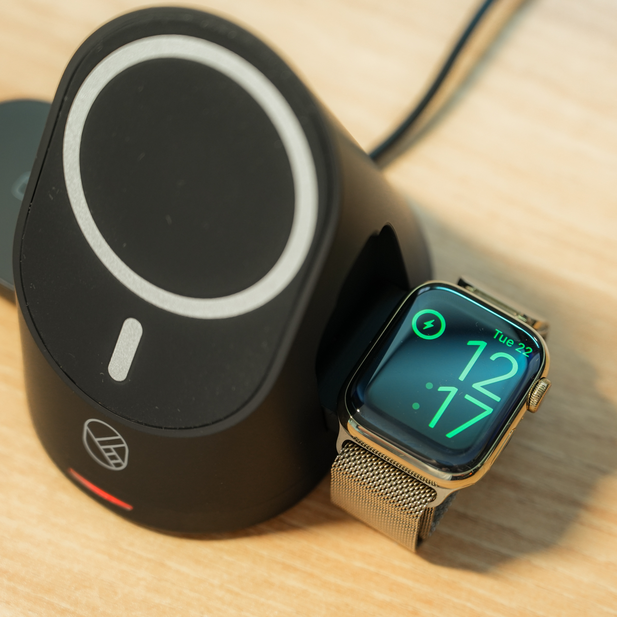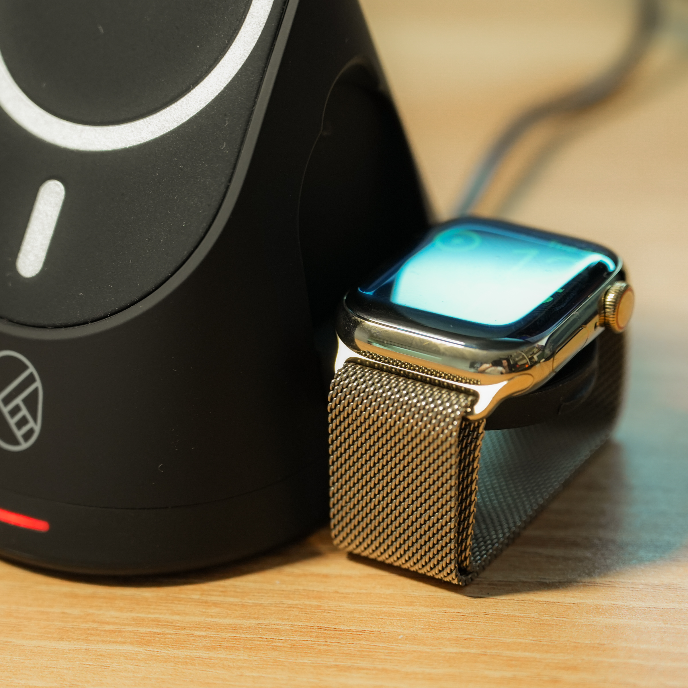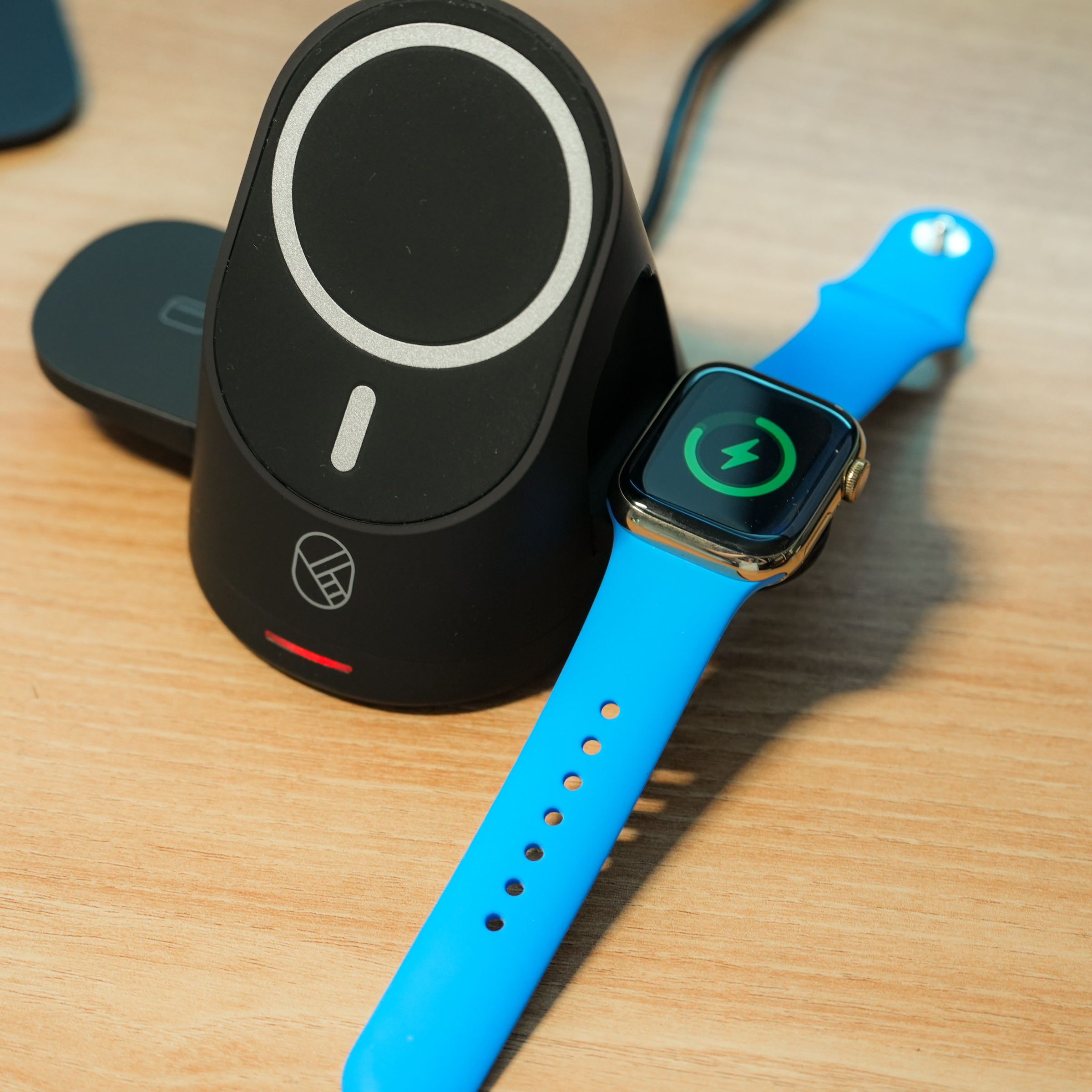애플워치 충전기는 본체 오른쪽에 접이식으로 수납돼 있습니다. 미인증 제품 중에서도 ‘발열 없는 충전이 가능하다’며 광고하는 제품을 종종 봐왔기 때문에 직접 사용하기 전까지 우려는 가시지 않았습니다. 여차하면 워치 충전은 별도 제품을 사용할 생각이었는데 4,5일간 사용하면서 발열, 방전 등의 문제는 없었습니다. 정상적으로 충전이 됐고 가끔 워치 뒷면이 미지근하긴 하지만 발열로 부를만한 현상은 없습니다. 결과적으로 3in1 충전기를 모두 잘 사용하고 있습니다. 다만 애플워치 시리즈 7 이상에서 지원되는 고속 충전은 이 제품에선 지원되지 않는 것으로 보입니다.