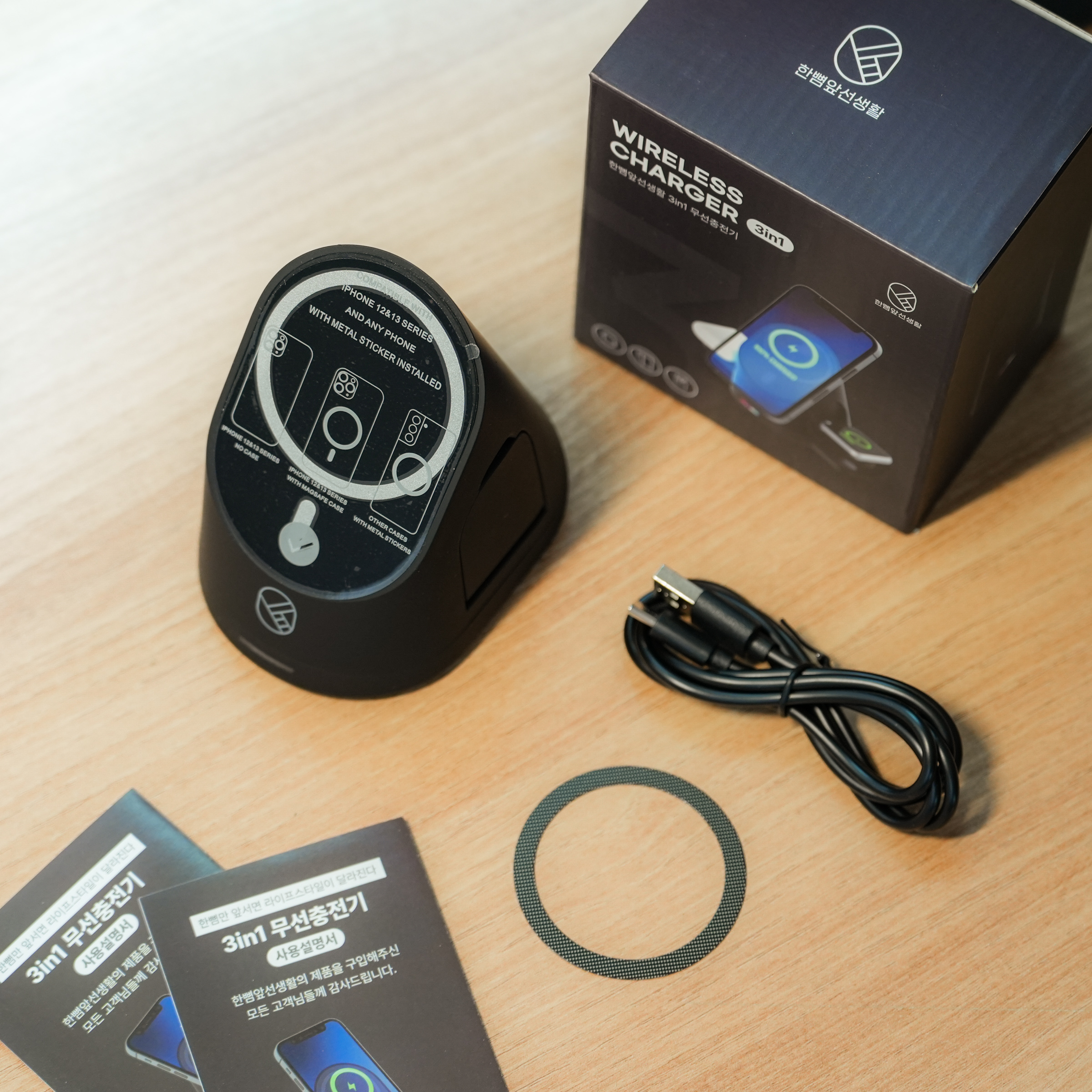 꾸밈없이 간결한 상자에 제품명과 사진이 인쇄돼 있습니다. 아이폰과 에어팟, 애플 워치 동시 충전이 가능하다는 것을 알 수 있습니다. 한글 로고가 역시 친근합니다. 뒷면에는 제품 사양이 인쇄돼 있습니다. 구성품은 충전기 본체와 USB C 케이블 그리고 맥세이프 호환 스티커입니다. 맥세이프를 지원하지 않는 아이폰 12 시리즈 이전 모델 또는 타사 스마트폰에 붙여서 충전할 수 있습니다.